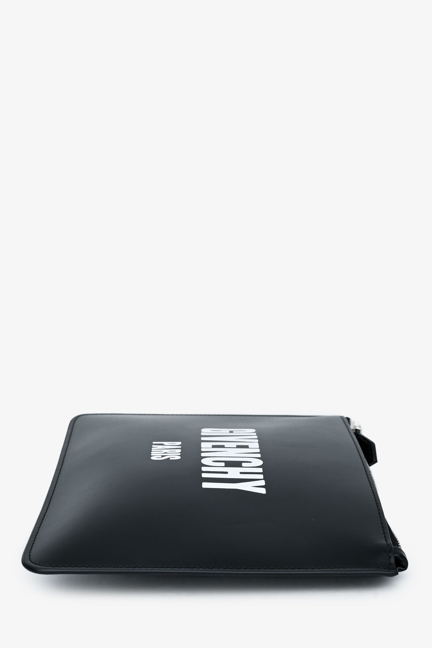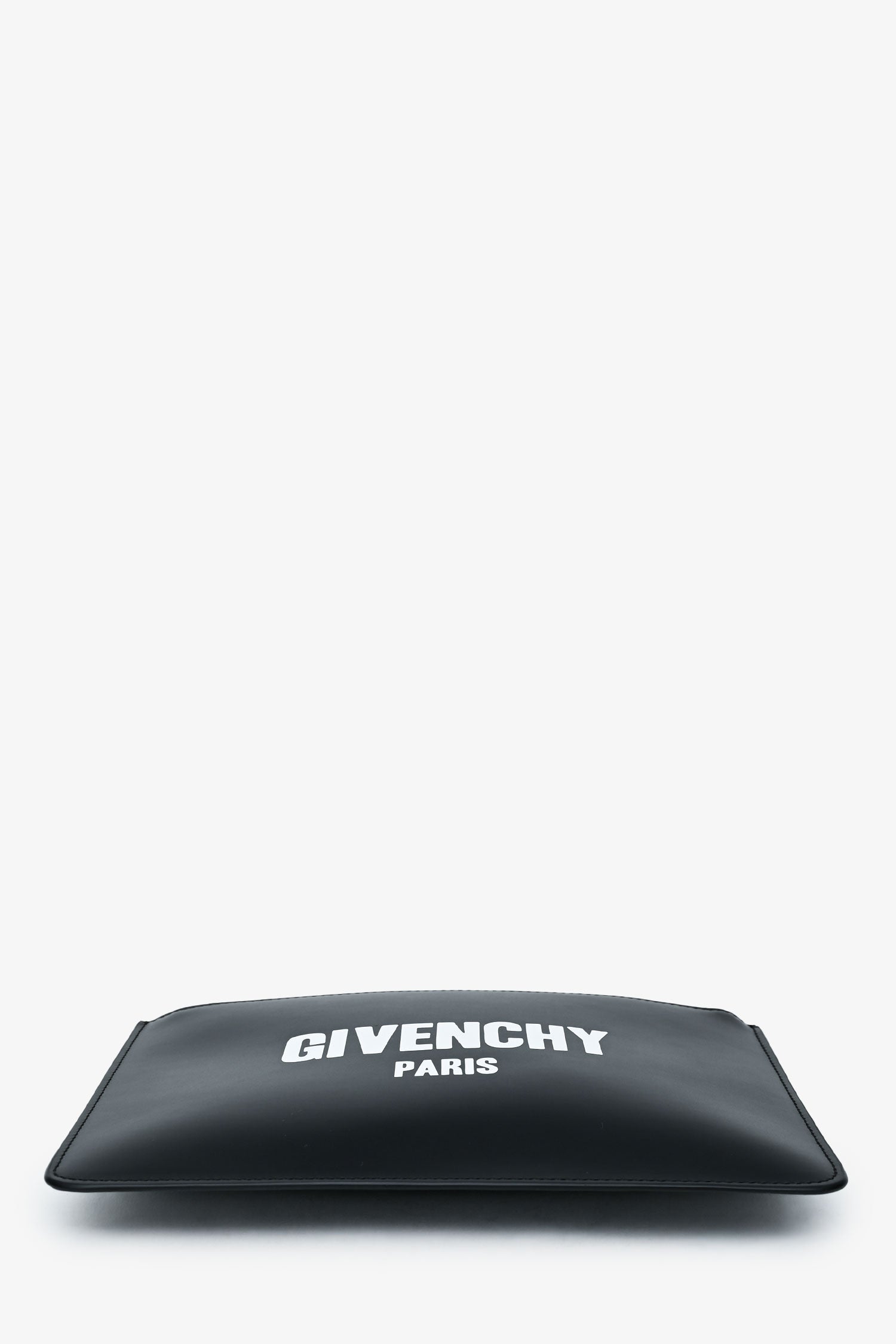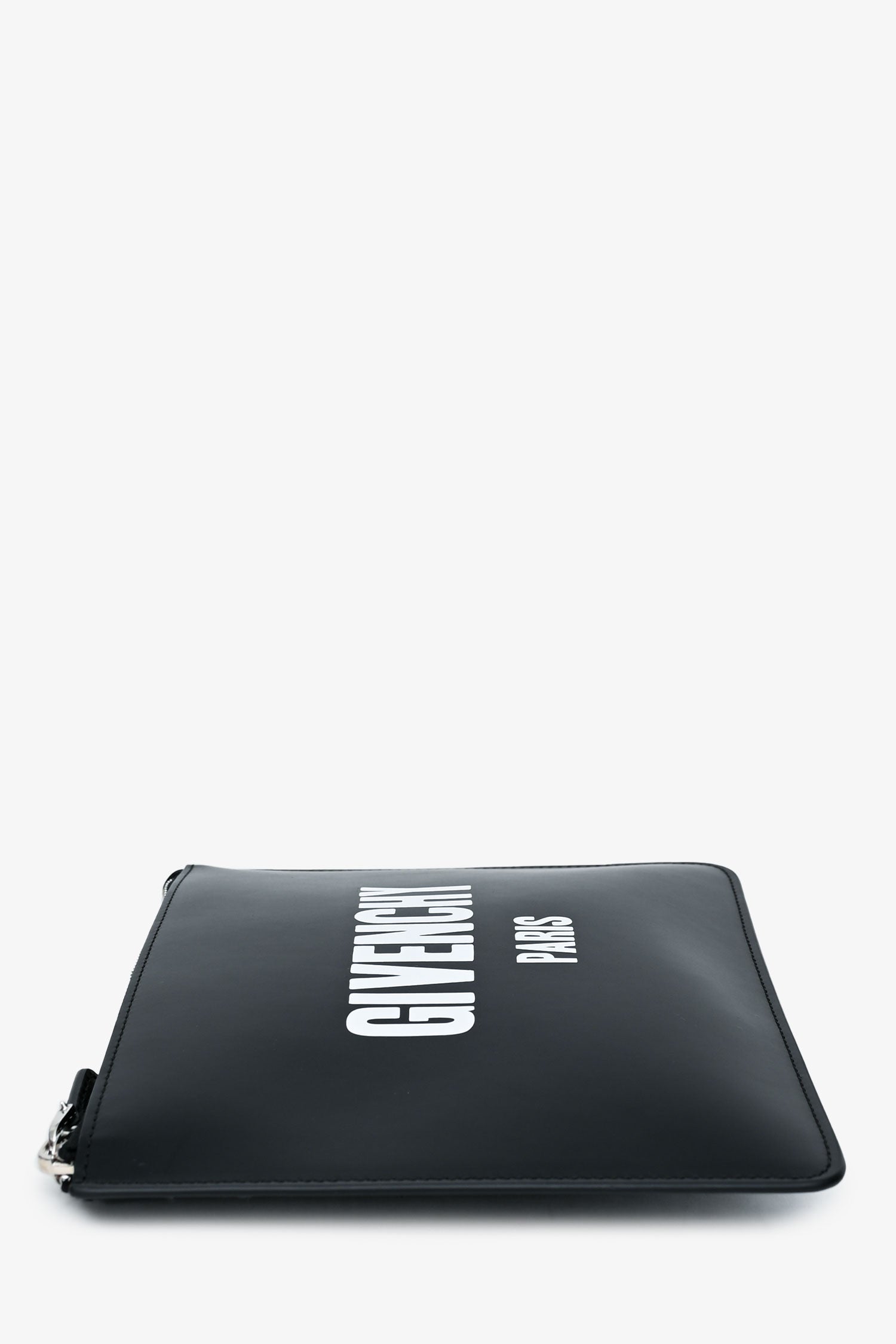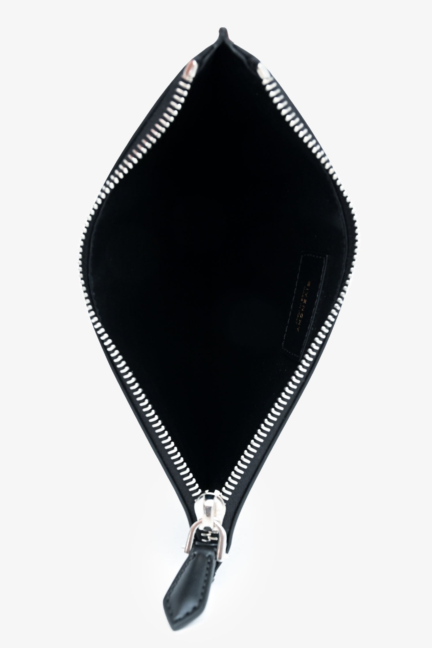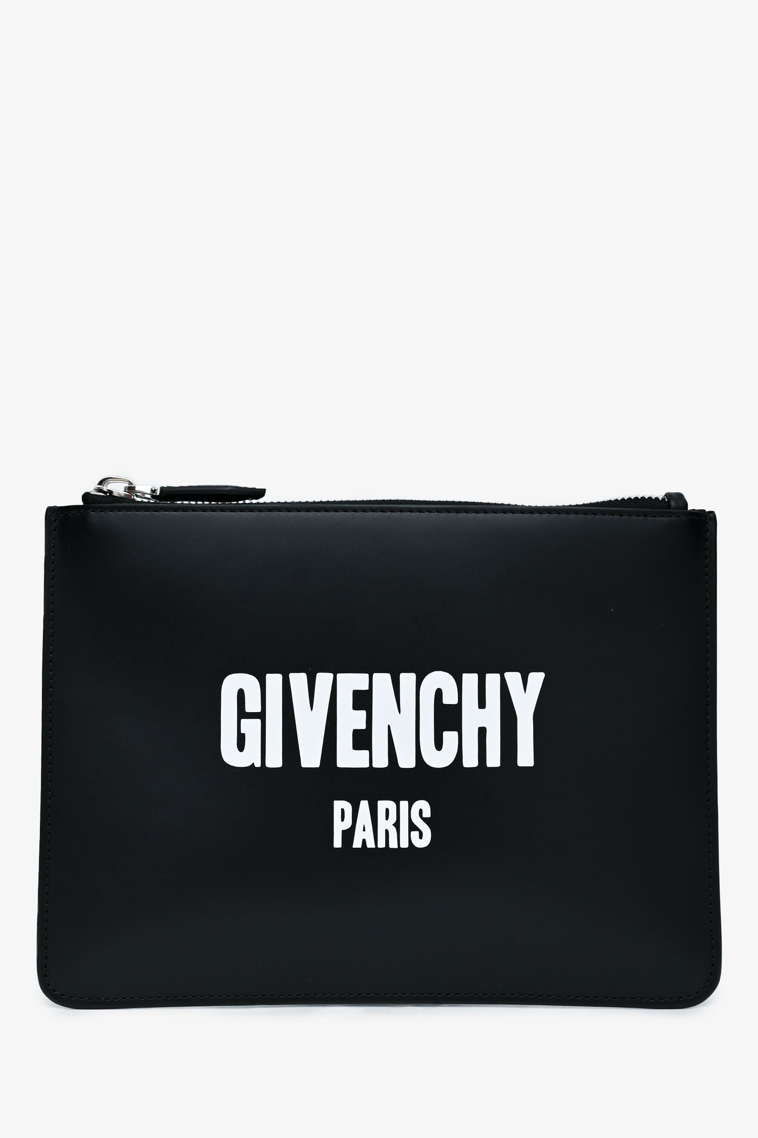Refresh availabilityGivenchy 2017 Black Leather Logo Zip Pouch. Top zip closure. Silver-tone hardware. Tonal suede interior lining. Open interior.
