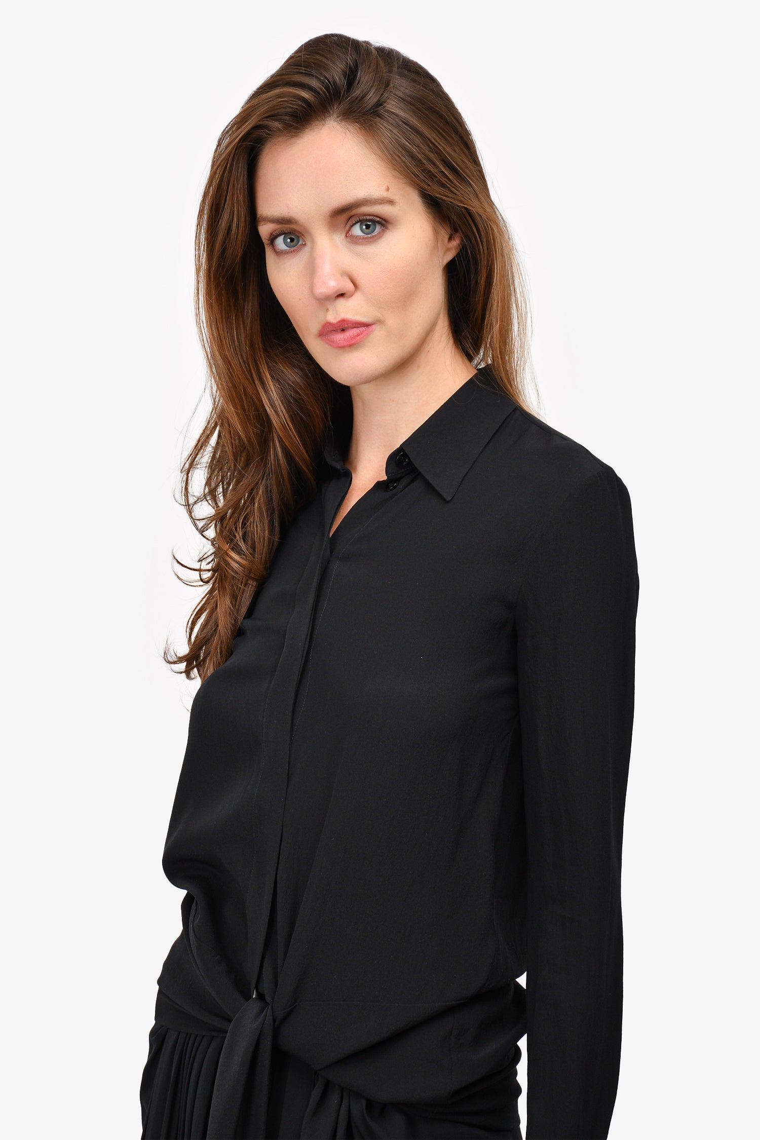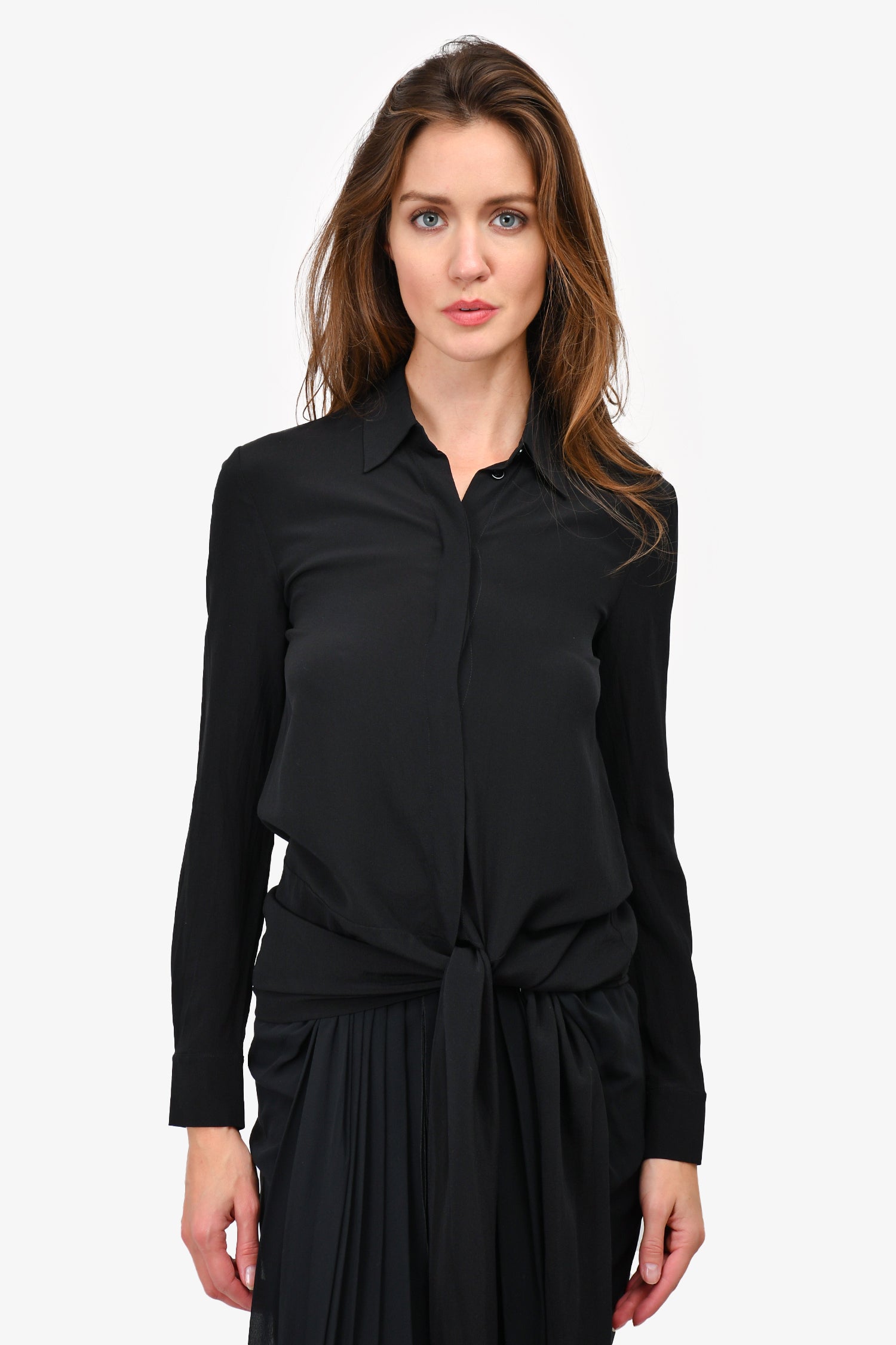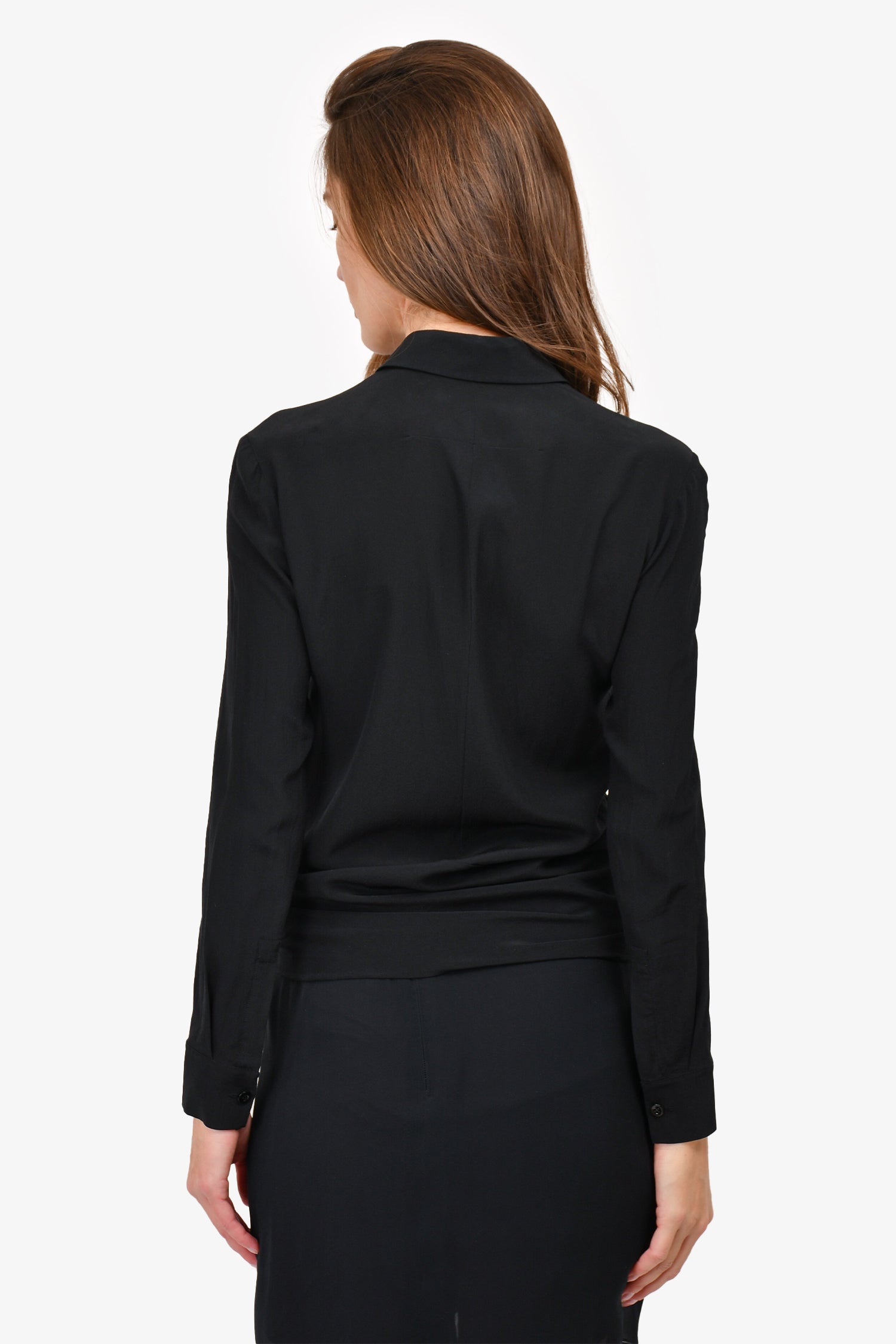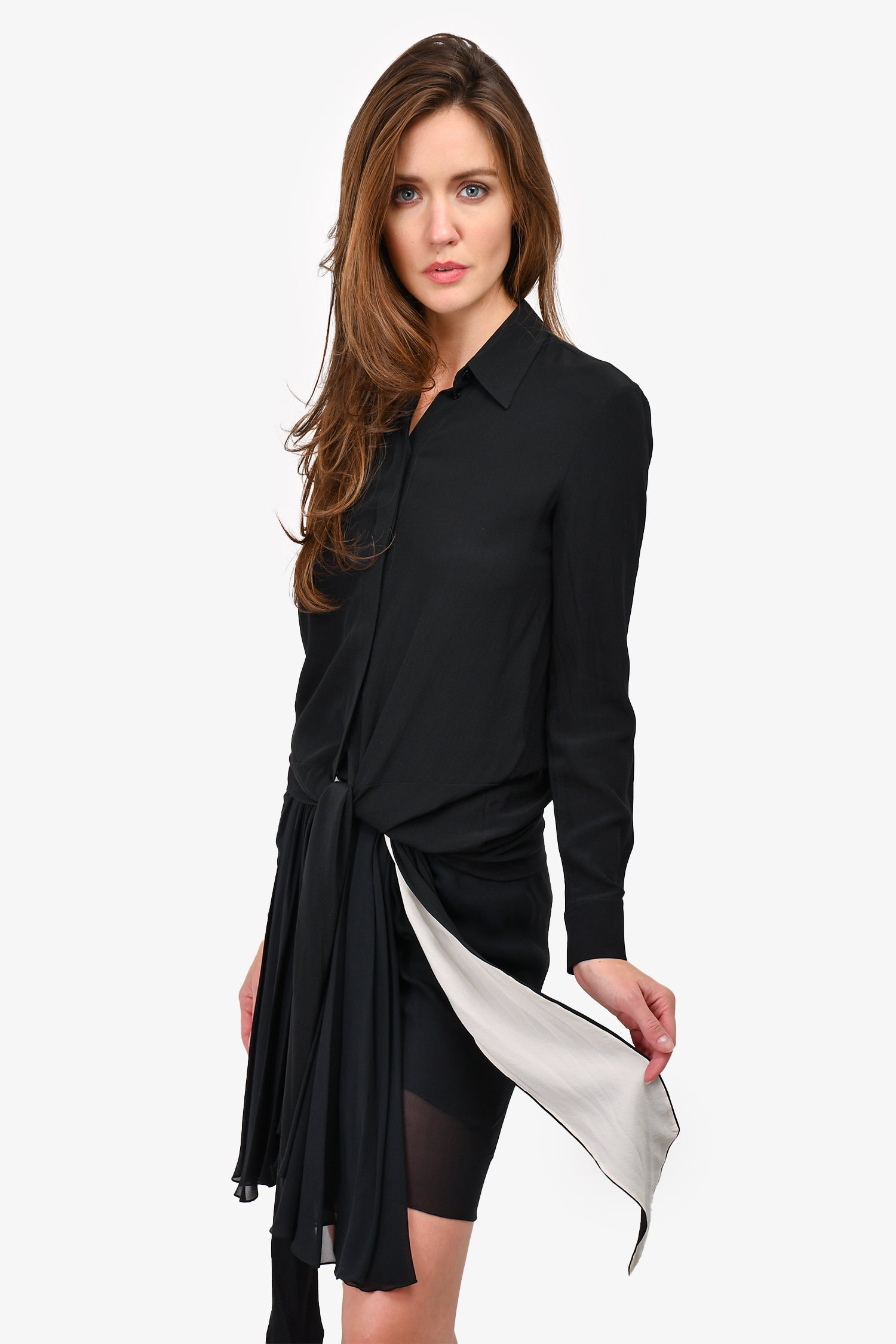 Refresh availabilityGivenchy 2017 Black/White Silk Tie Around Button Up Shirt. Front button-up closure. Tonal hardware. Hem tie-up. Buttoned at the cuff. Tonal stitching.