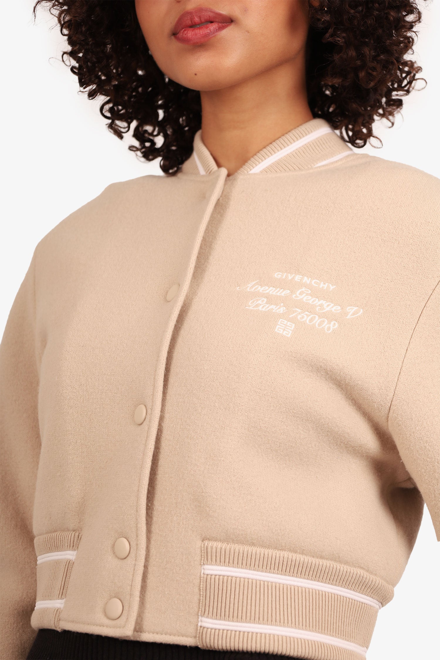 Refresh availabilityGivenchy Beige Cropped Embroidered Bomber Jacket. Front snap-button-up closure. Round-neckline. Elasticated sleeve cuffs, neckline and waistband. Quilted interior. Silver-tone hardware. Tonal stitching.