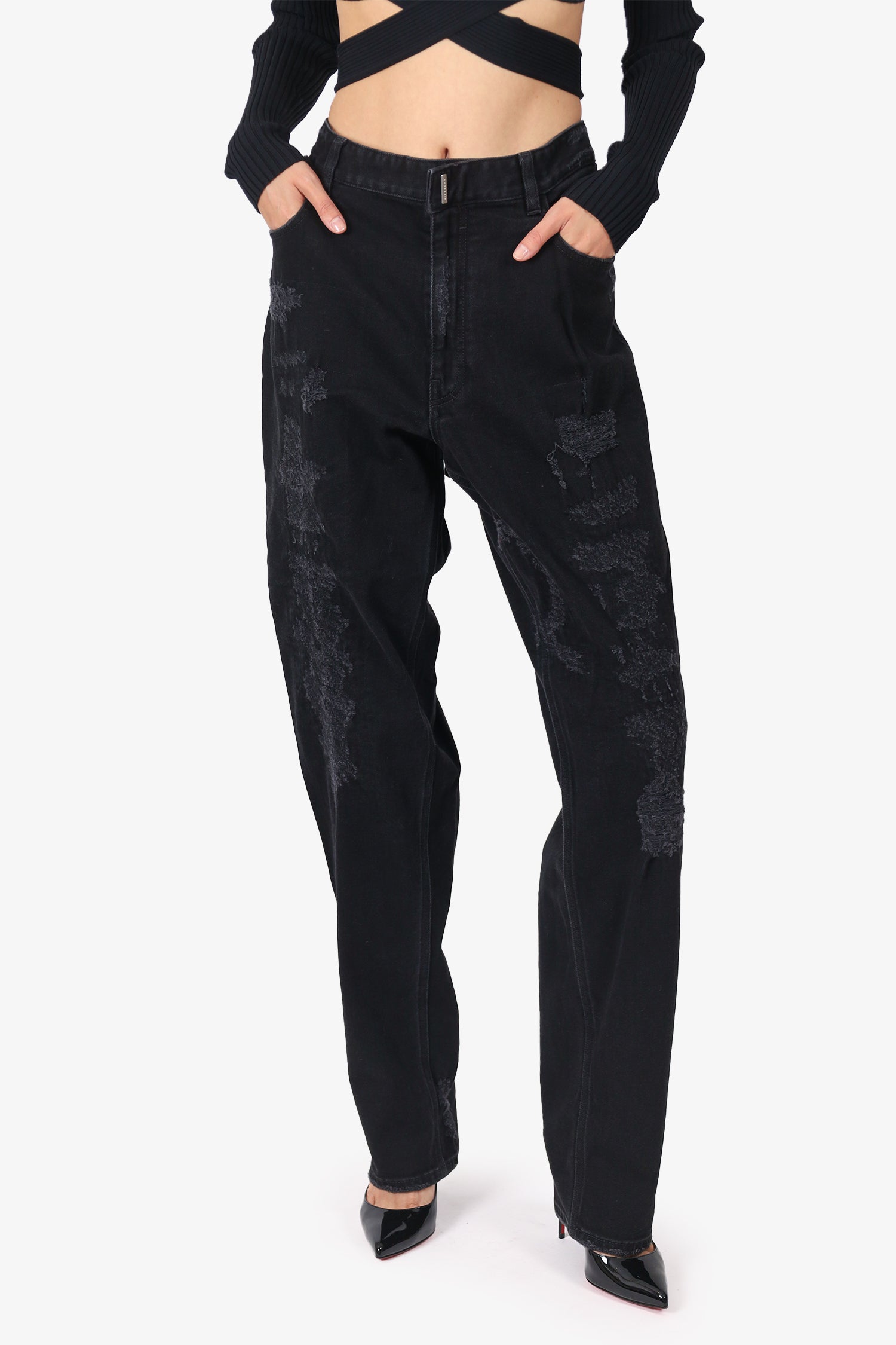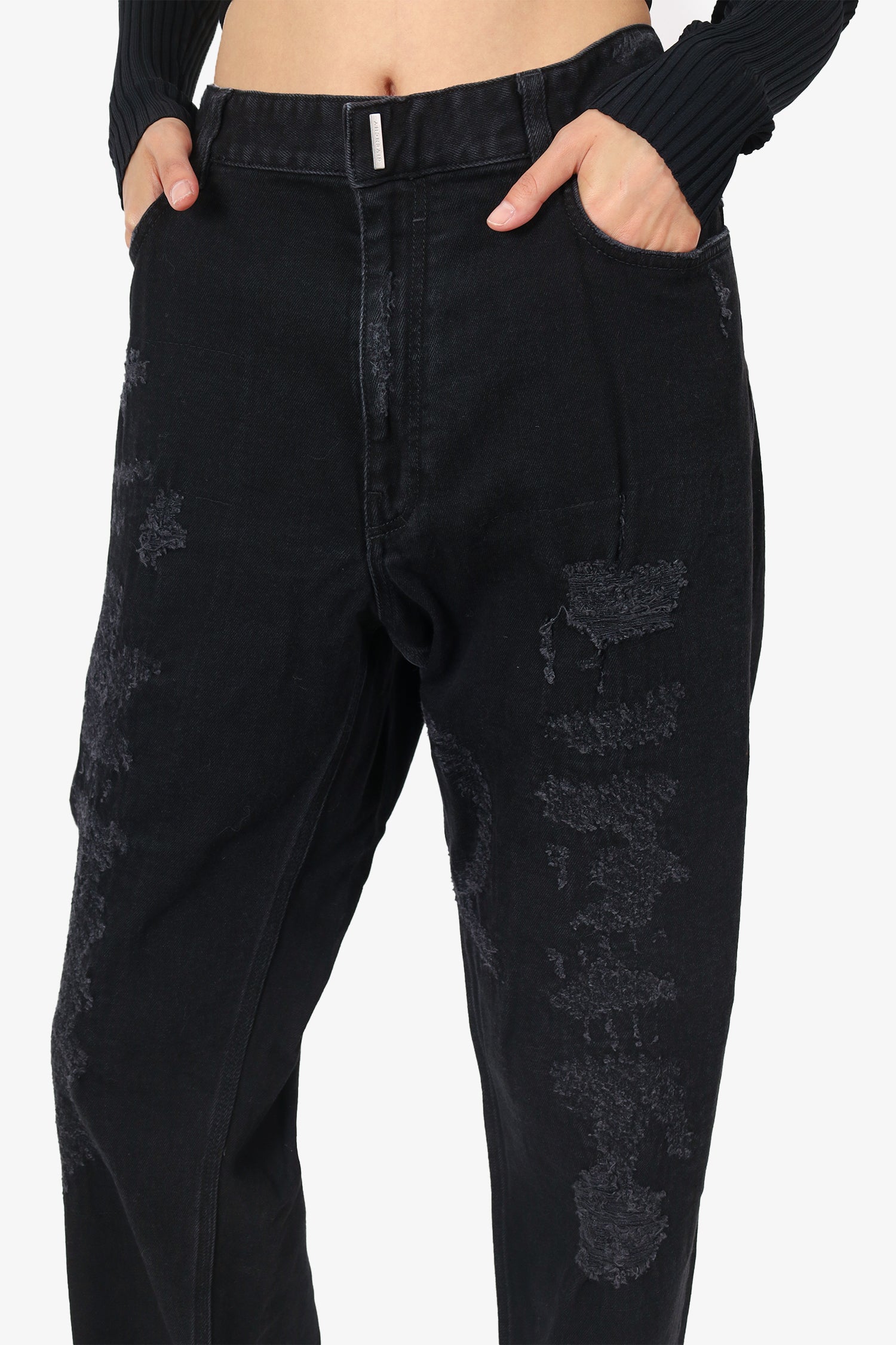 Refresh availabilityGivenchy Black Denim Distressed 4G Jeans. Slip on. Front zip with hook-and-eye and button closure. Waistband belt-loops. 4 exterior pockets; 2 front slip, and 2 rear slip. Silver-tone hardware. Tonal stitching.