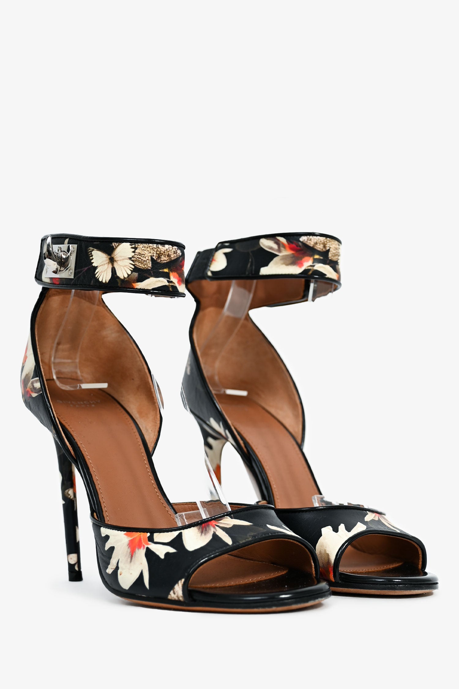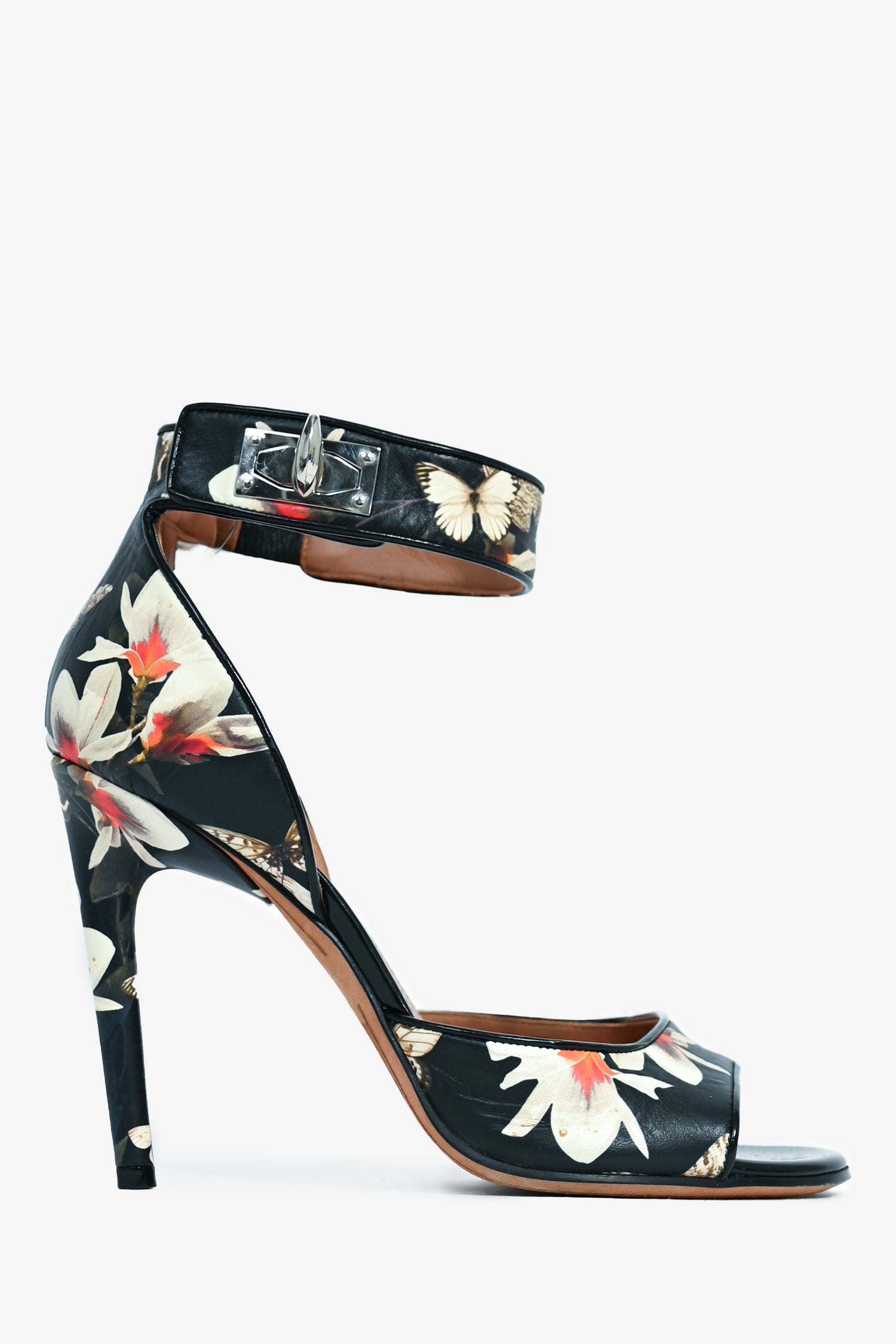 Refresh availabilityGivenchy Black Leather Floral Ankle Strap Peep Heels. Open toe. Side turn-lock closure. Elasticized shoe strap. Silver-tone hardware. Tonal stitching.
