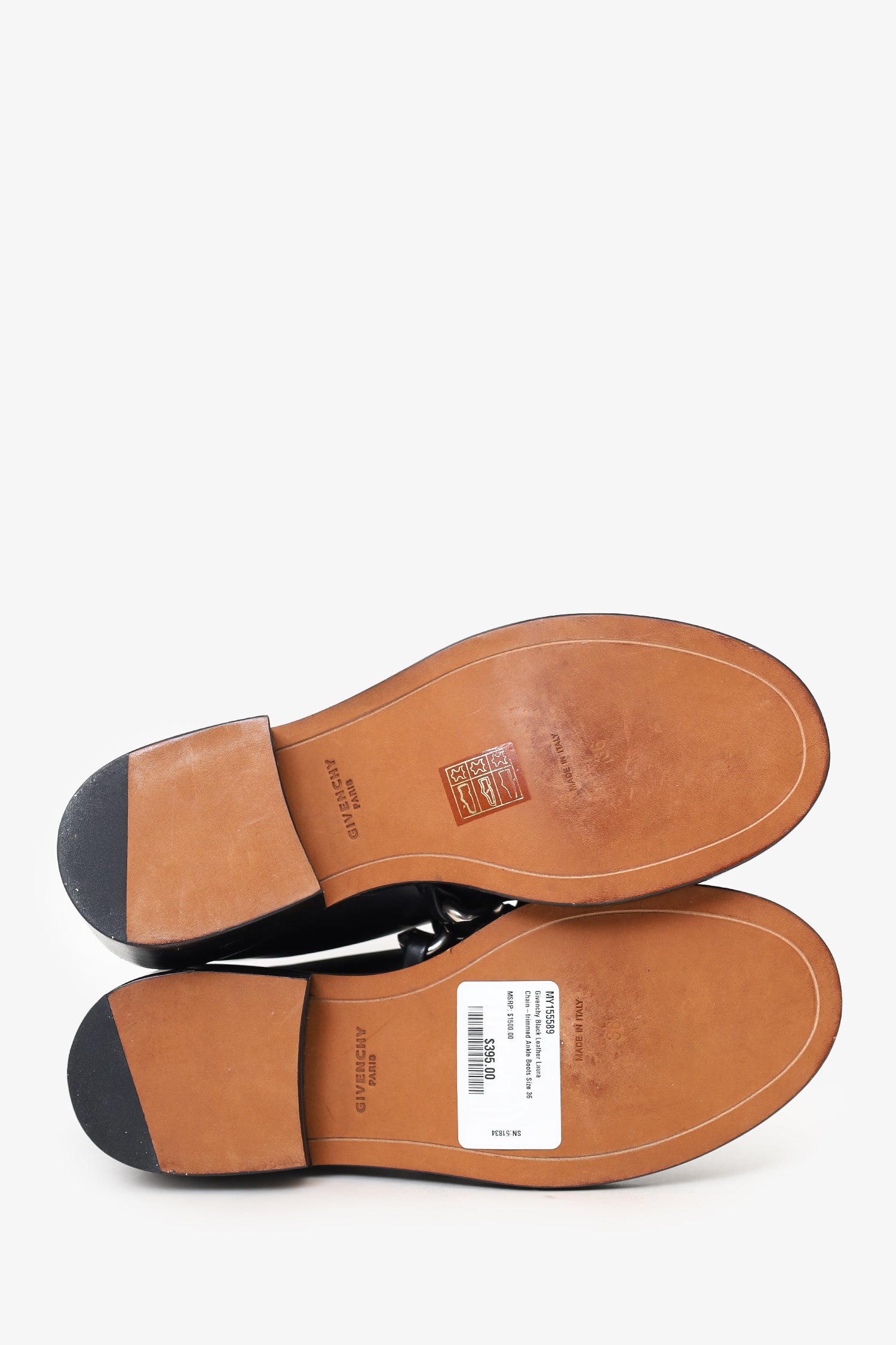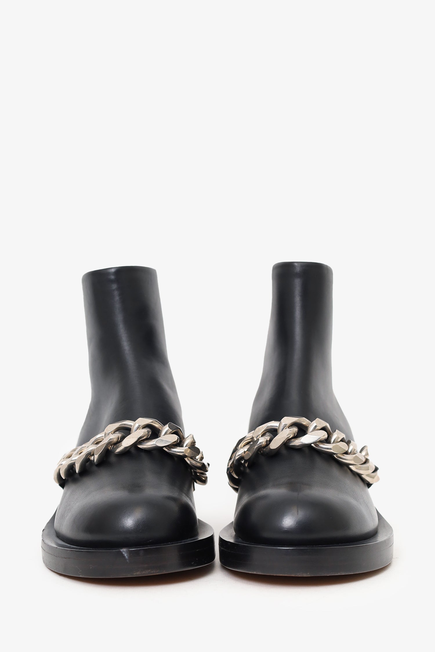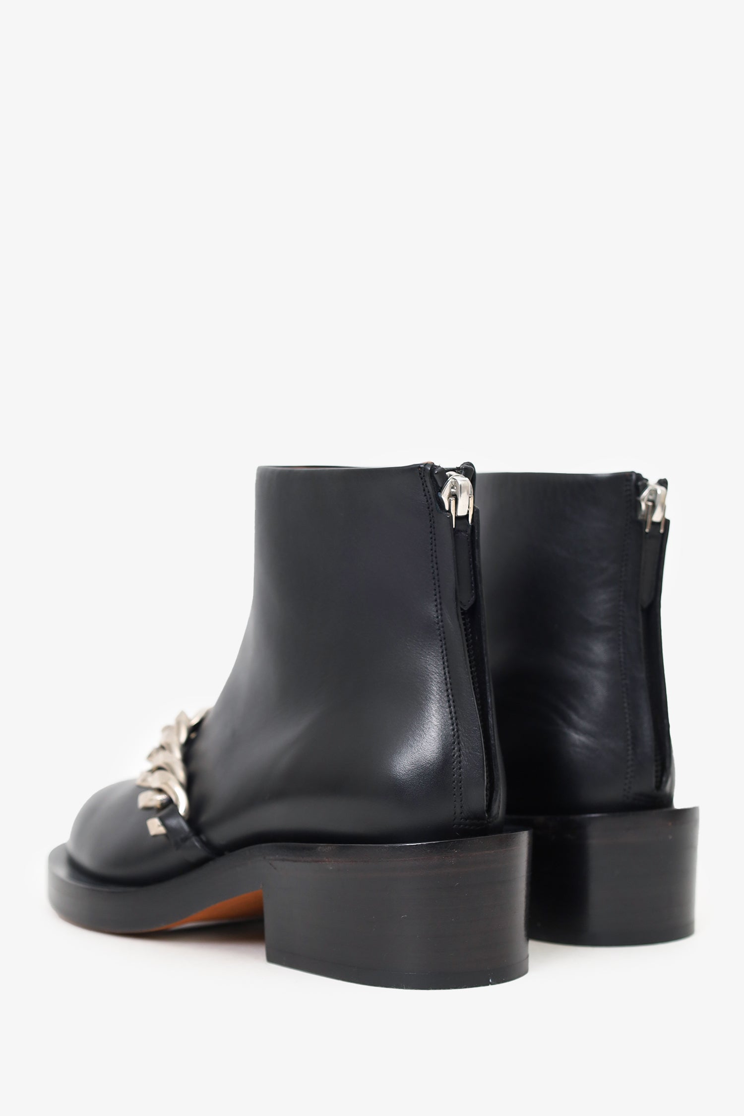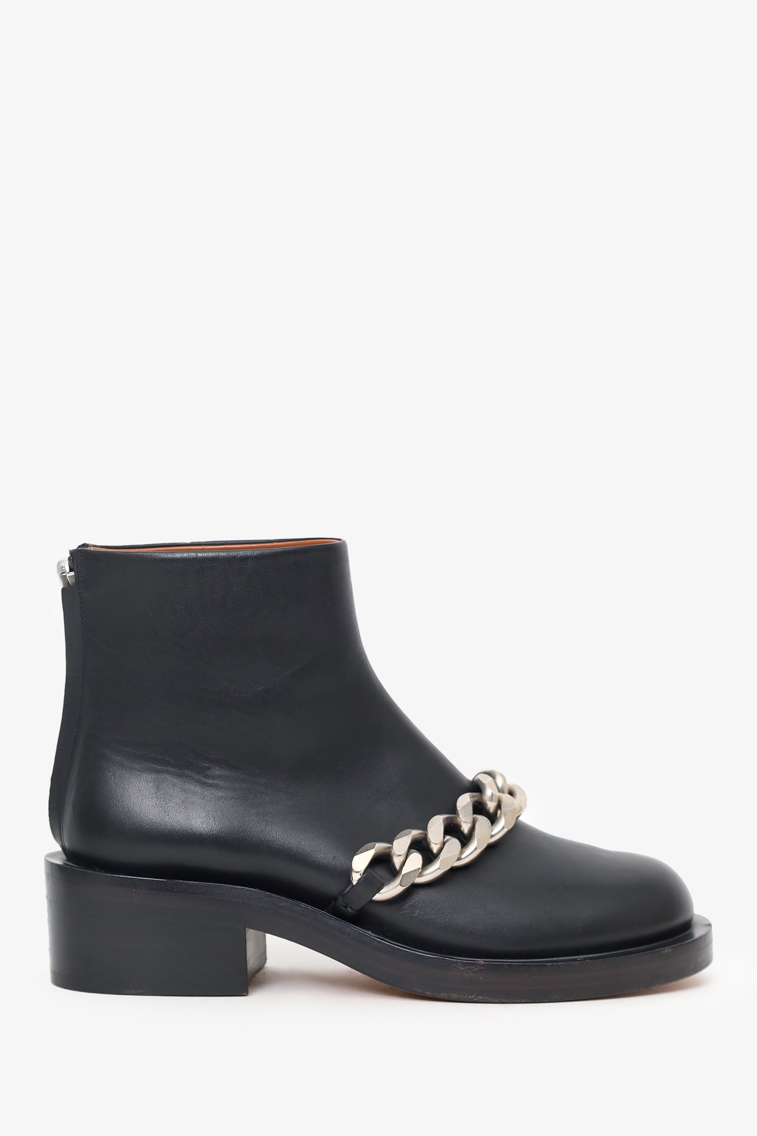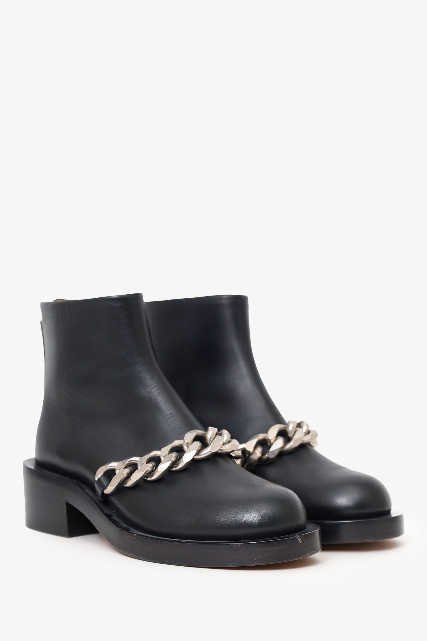 Refresh availabilityGivenchy Black Leather Laura Chain-trimmed Ankle Boots. Round toe. Rear zip closure. Block heel. Silver-tone hardware. Tonal stitching.