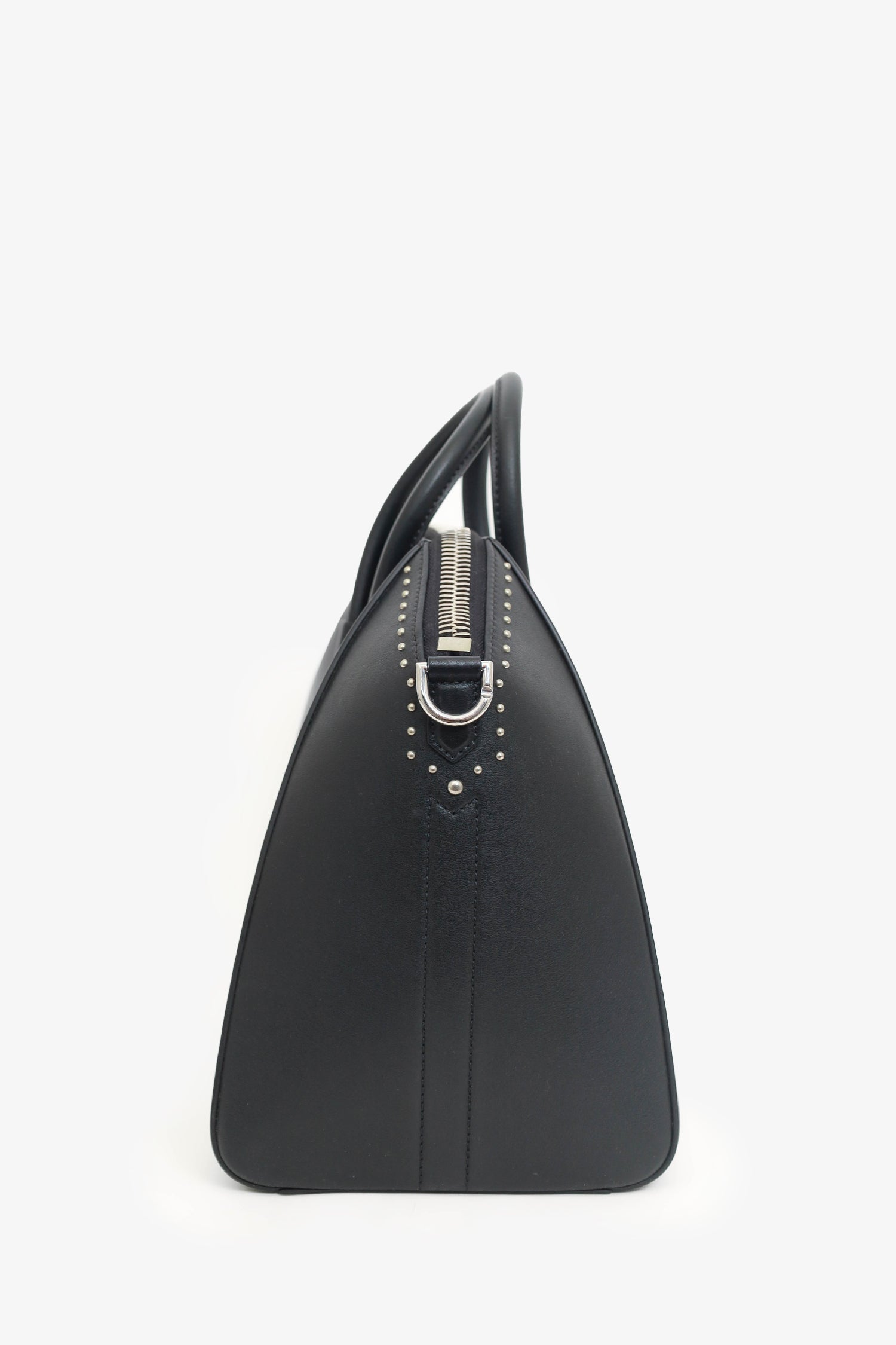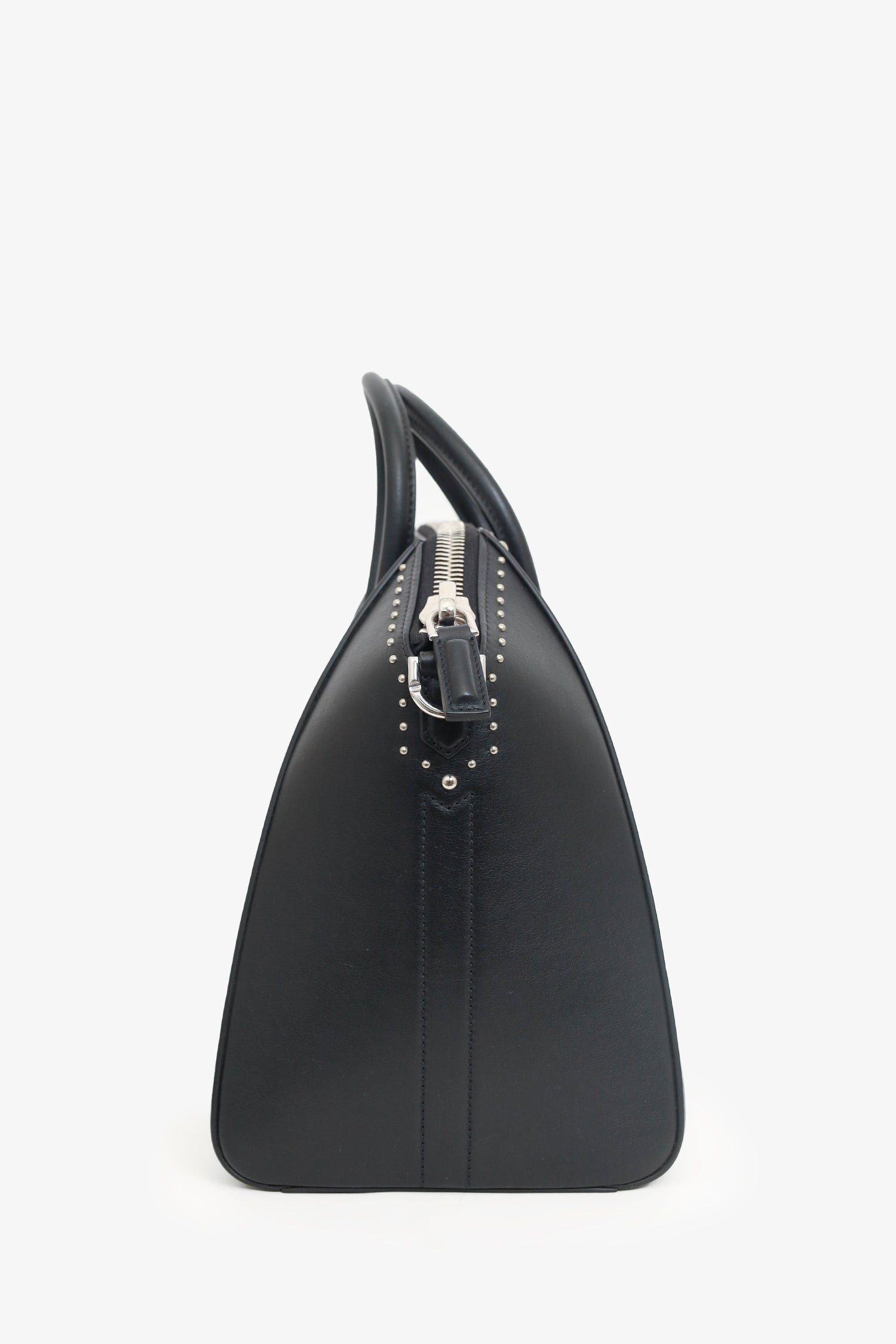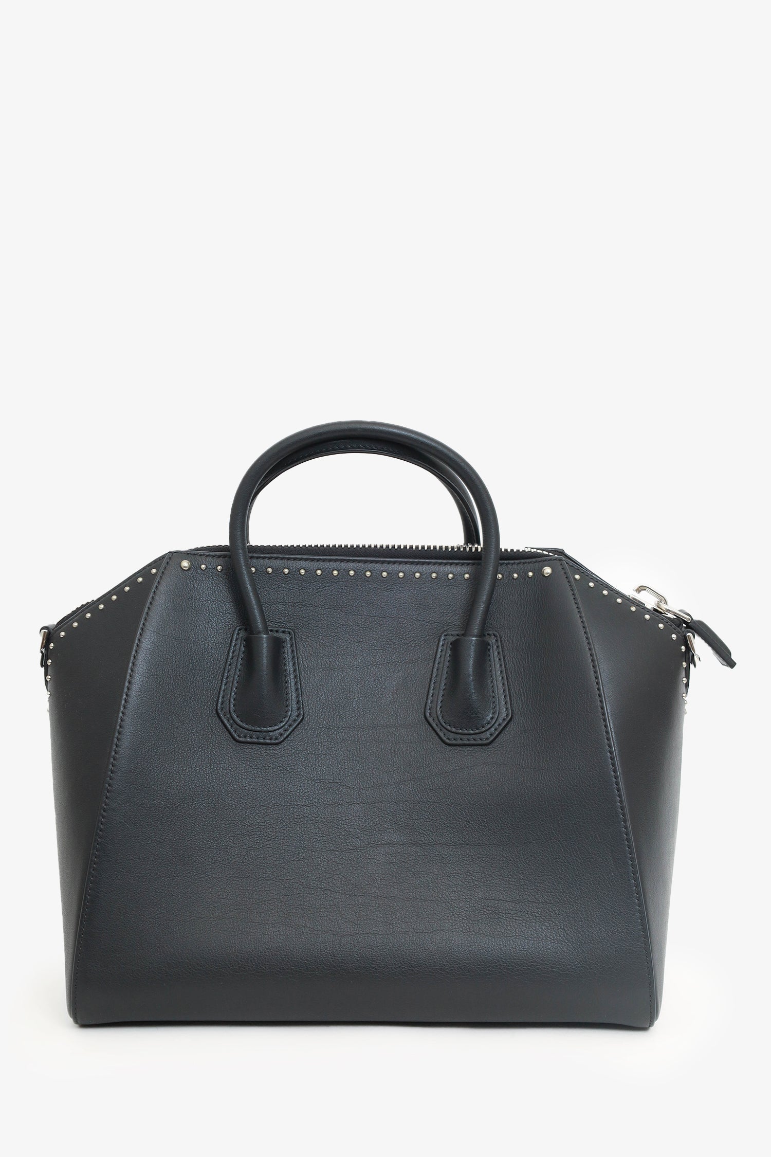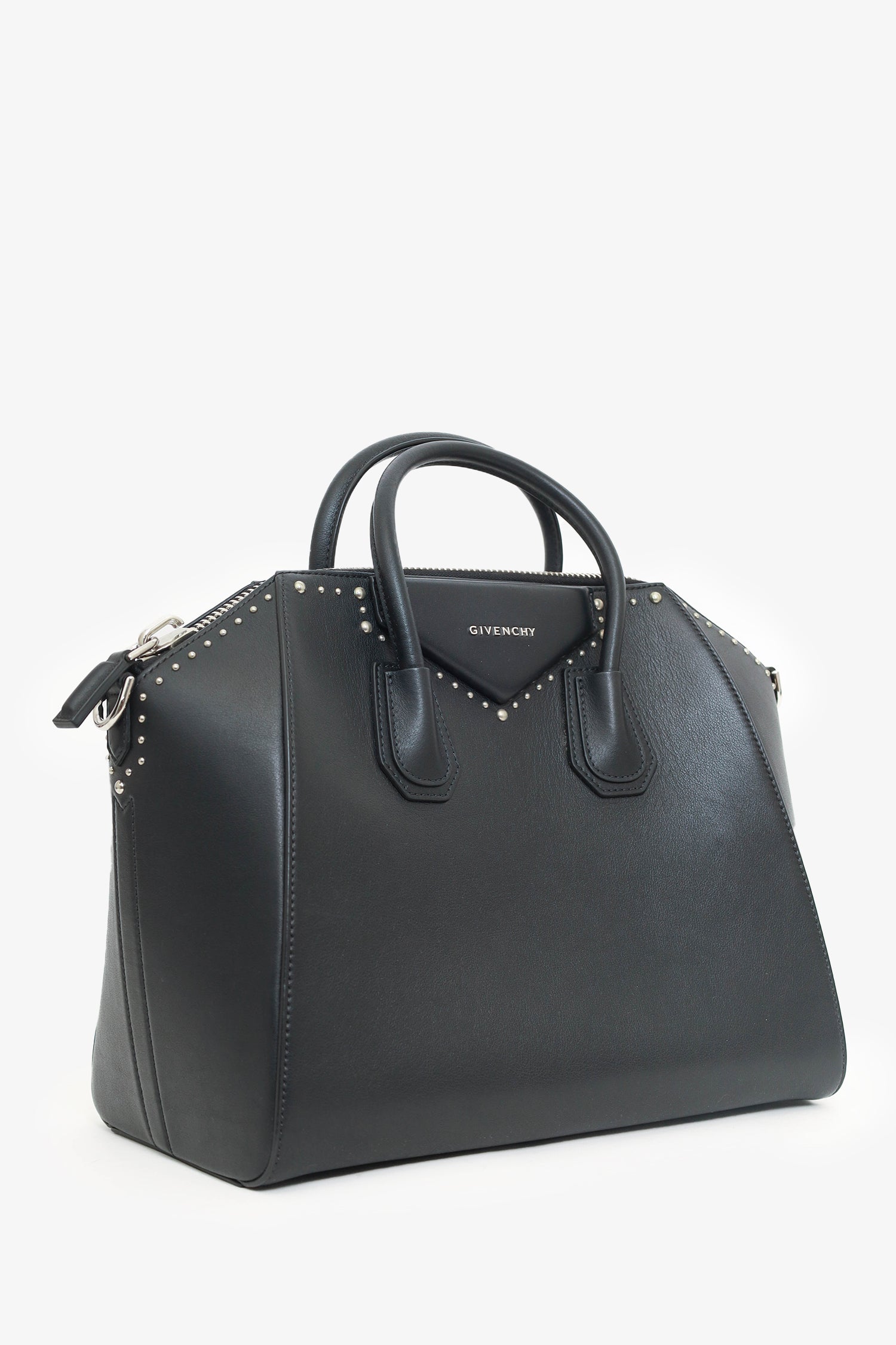 Refresh availabilityGivenchy Black Leather Studded Antigona Bag. Top zip closure. Top handle. Removable strap. 2 interior wall pocket; 1 with zip closure, 1 slip pocket. Tonal stitching. Silver-tone hardware.