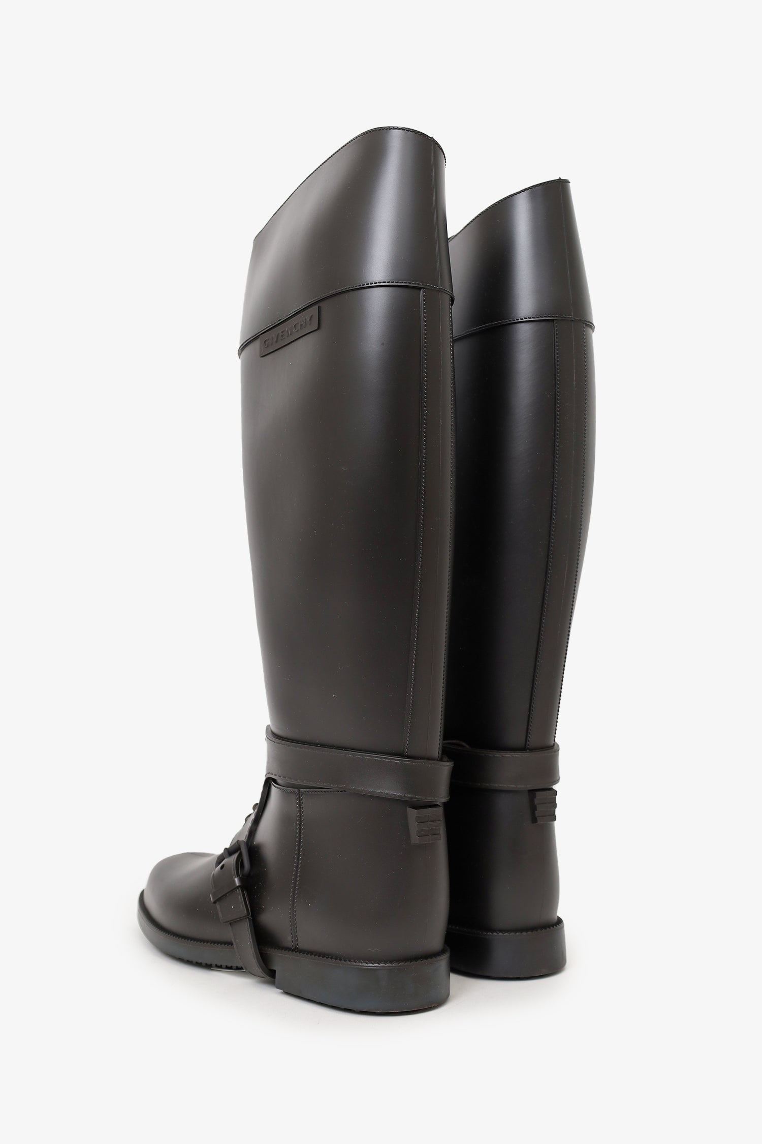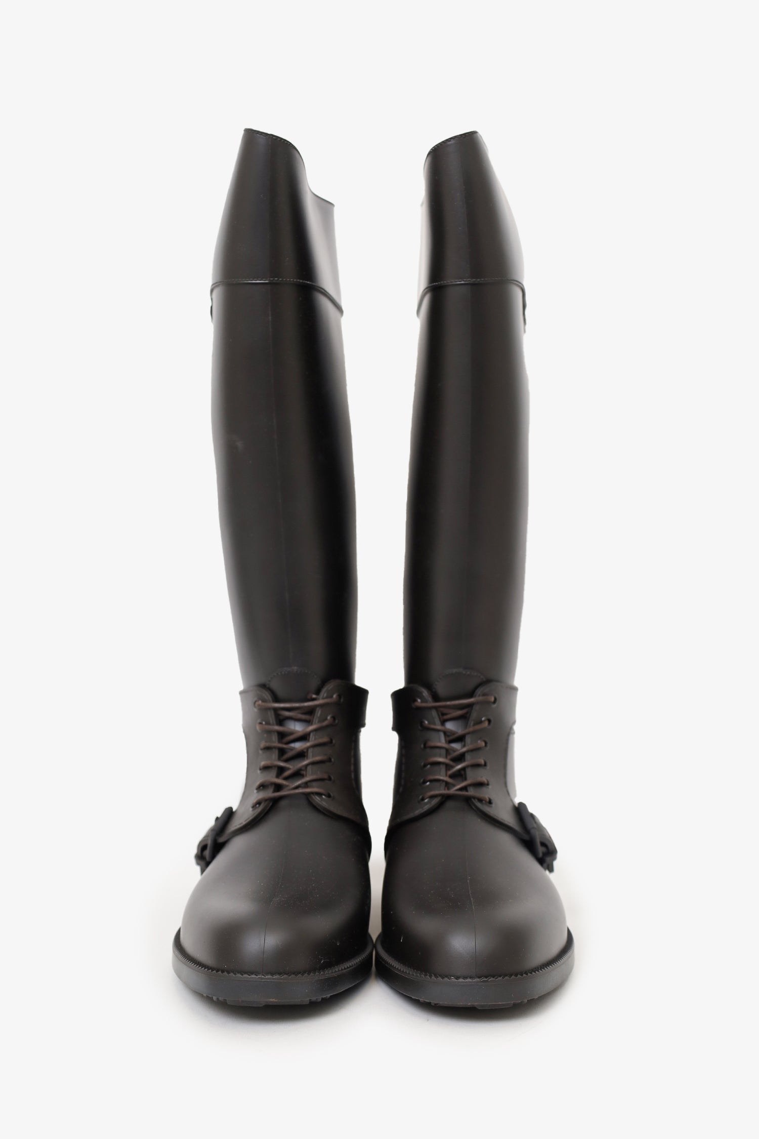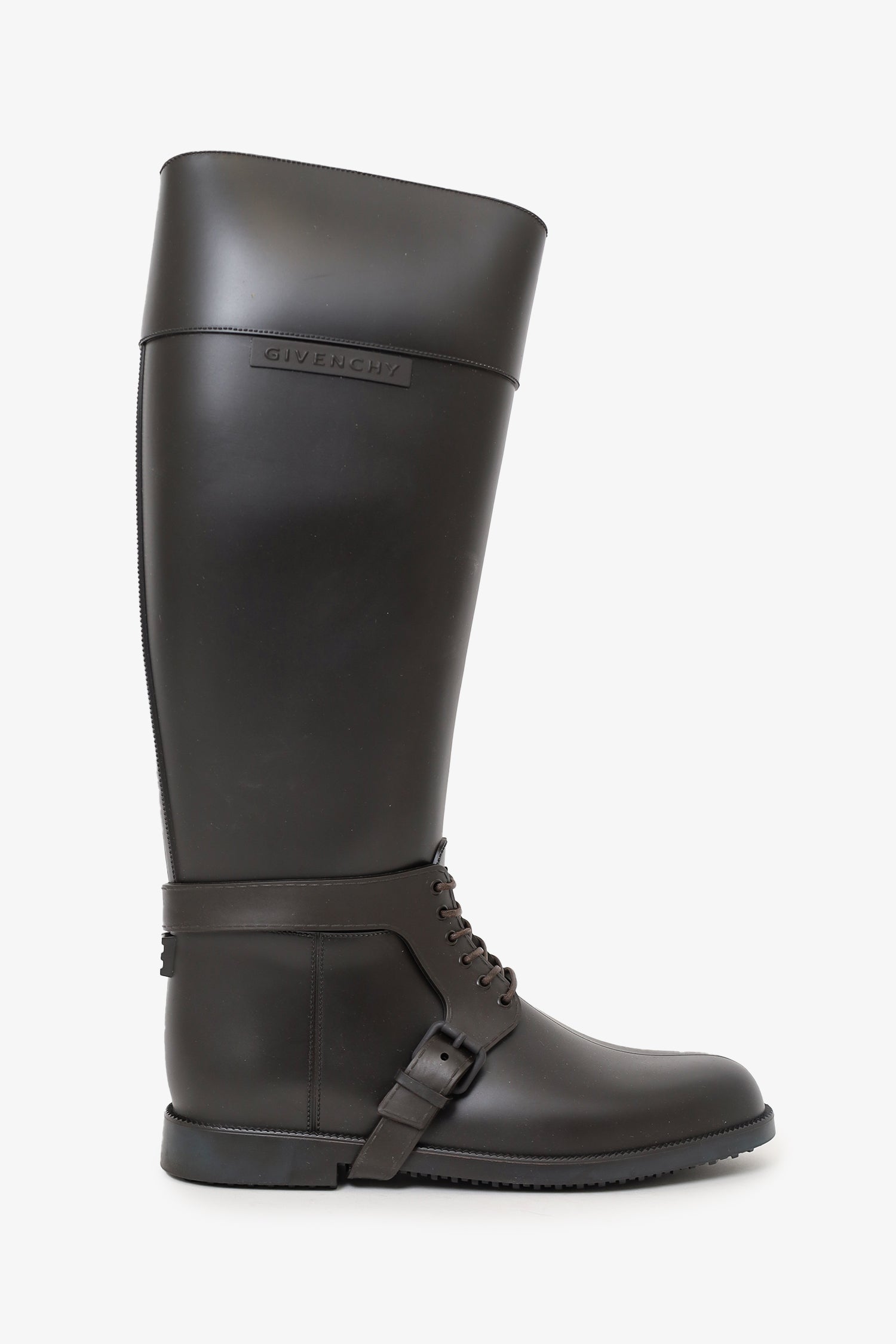 Refresh availabilityGivenchy Dark Brown Rubber Knee High Riding Boot. Pull-on. Pointed-round toe. Front lace-up closure at ankle. Lined interior. Tonal stitching.