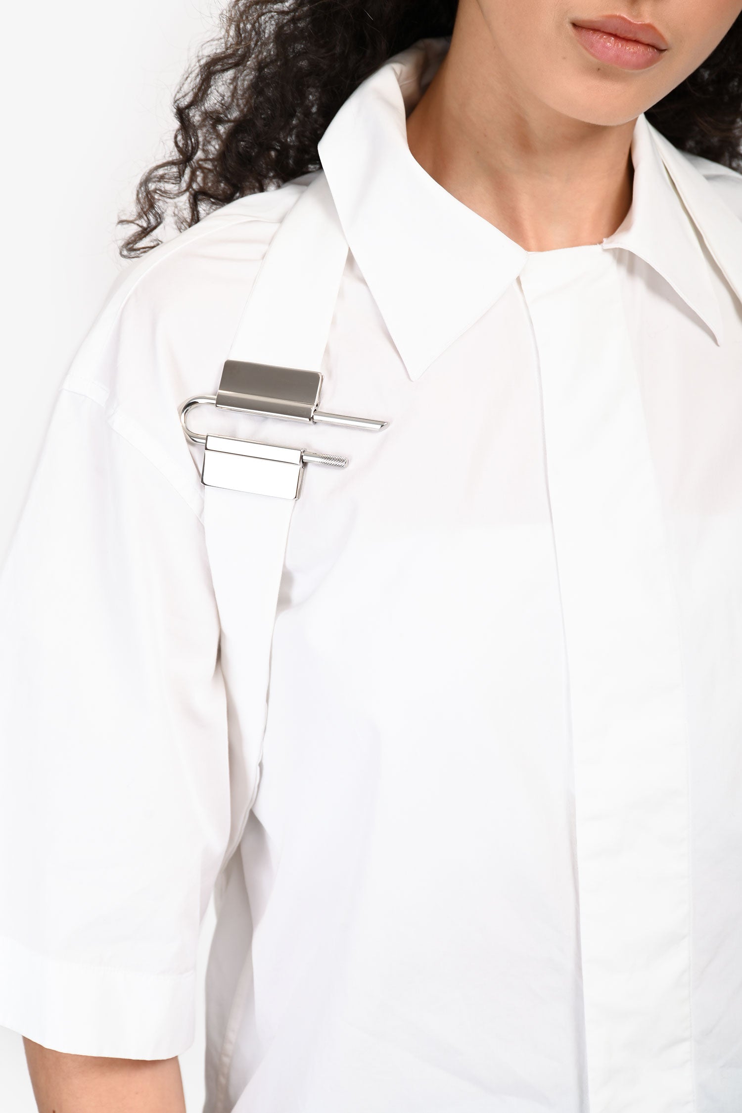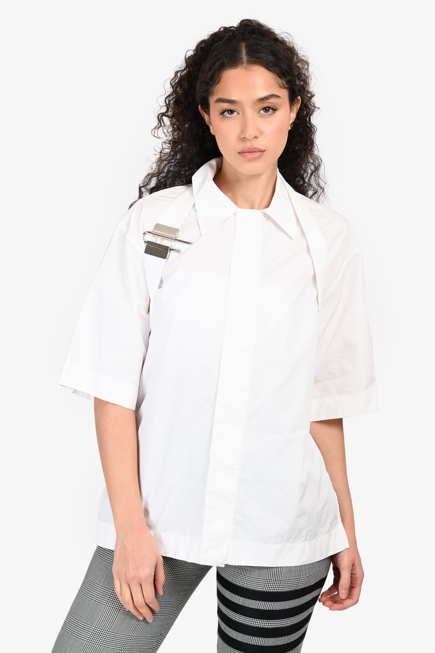 Refresh availabilityGivenchy White Button Up Short Sleeve Shirt with Buckle. Slip-on. Pointed collar. Front button-up closure. Side seam slits. Removable buckle strap. Silver-tone hardware. Tonal stitching.