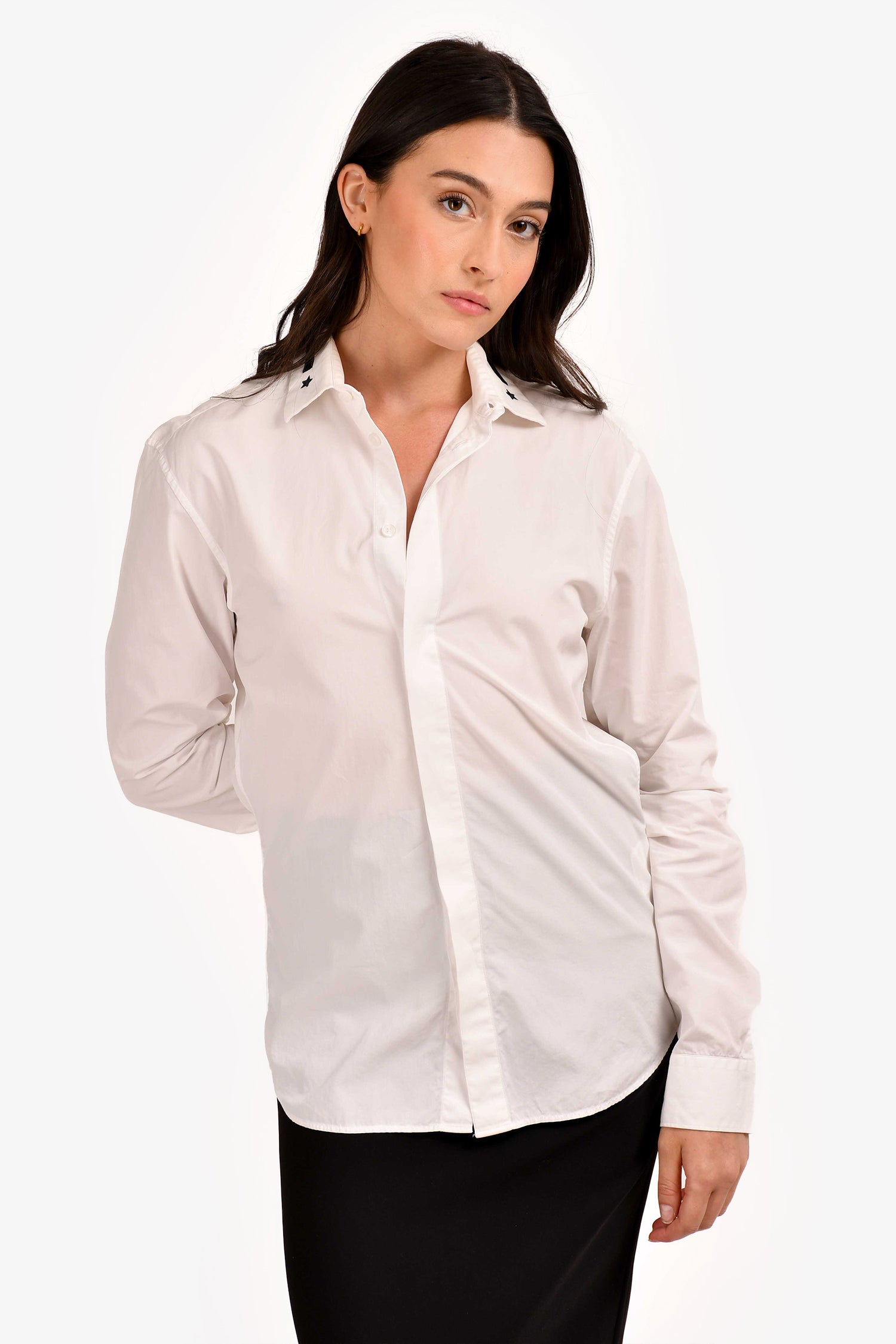 Refresh availabilityGivenchy White Cotton Star Embroidered Collar Shirt. Classic point collar with black star embroidery. Button front closure. Long sleeves with buttoned cuffs. Tonal stitching.