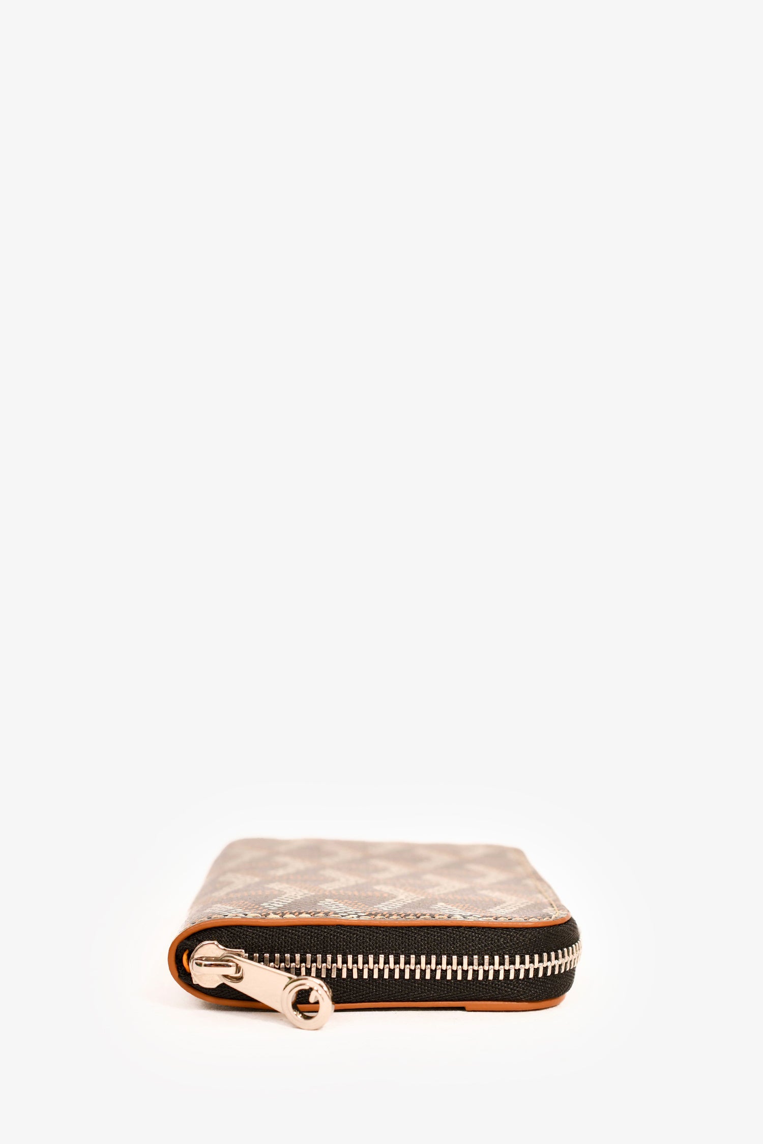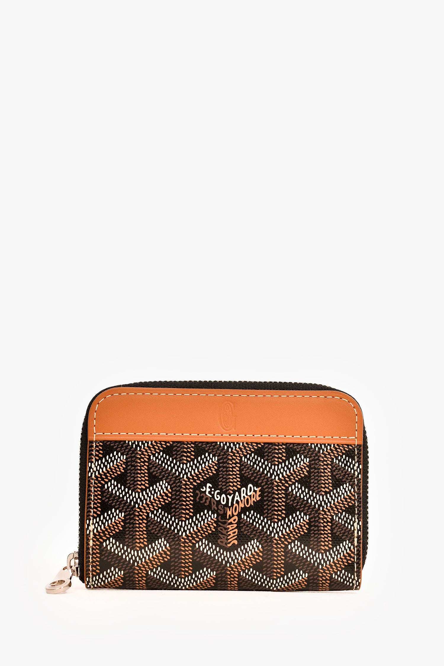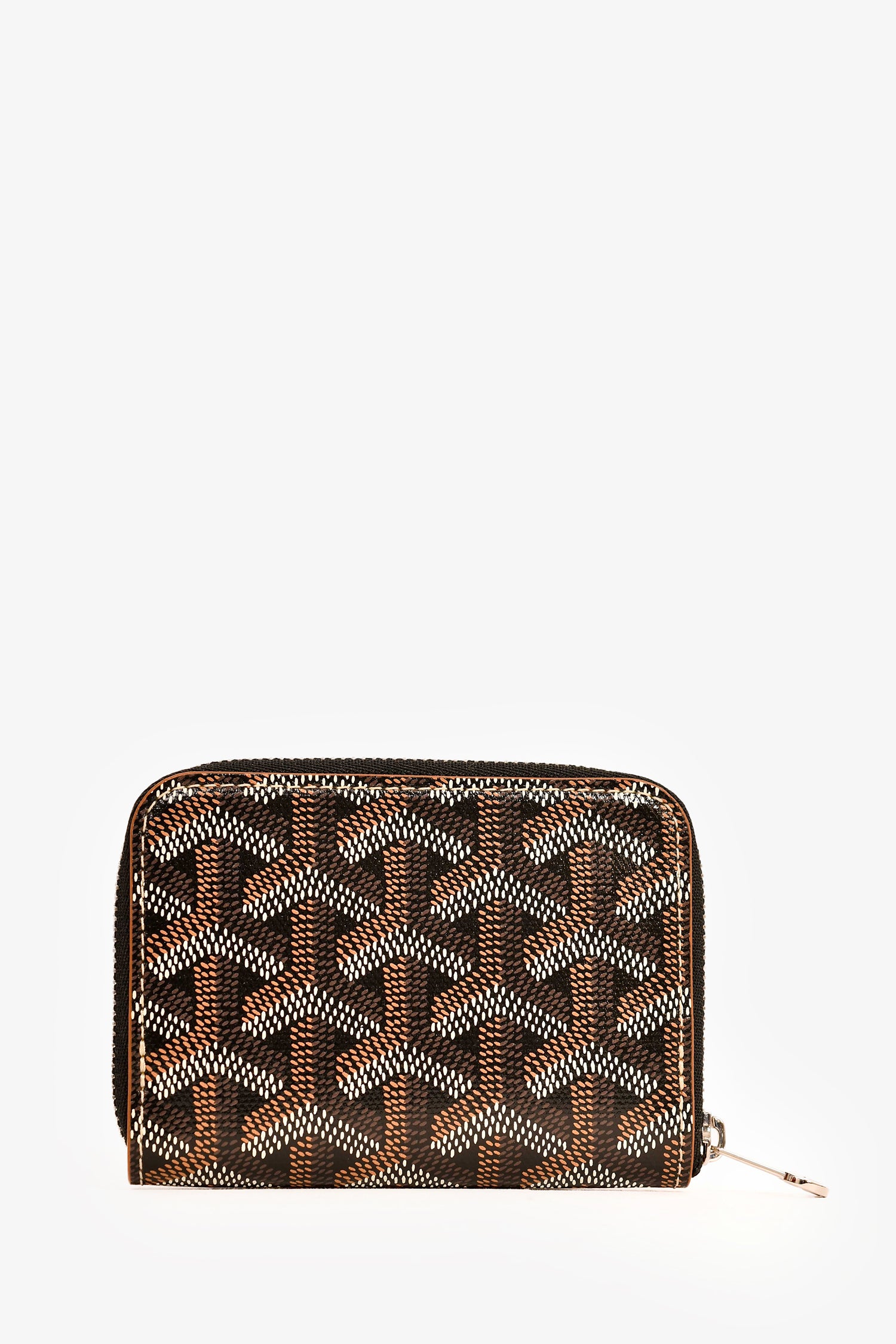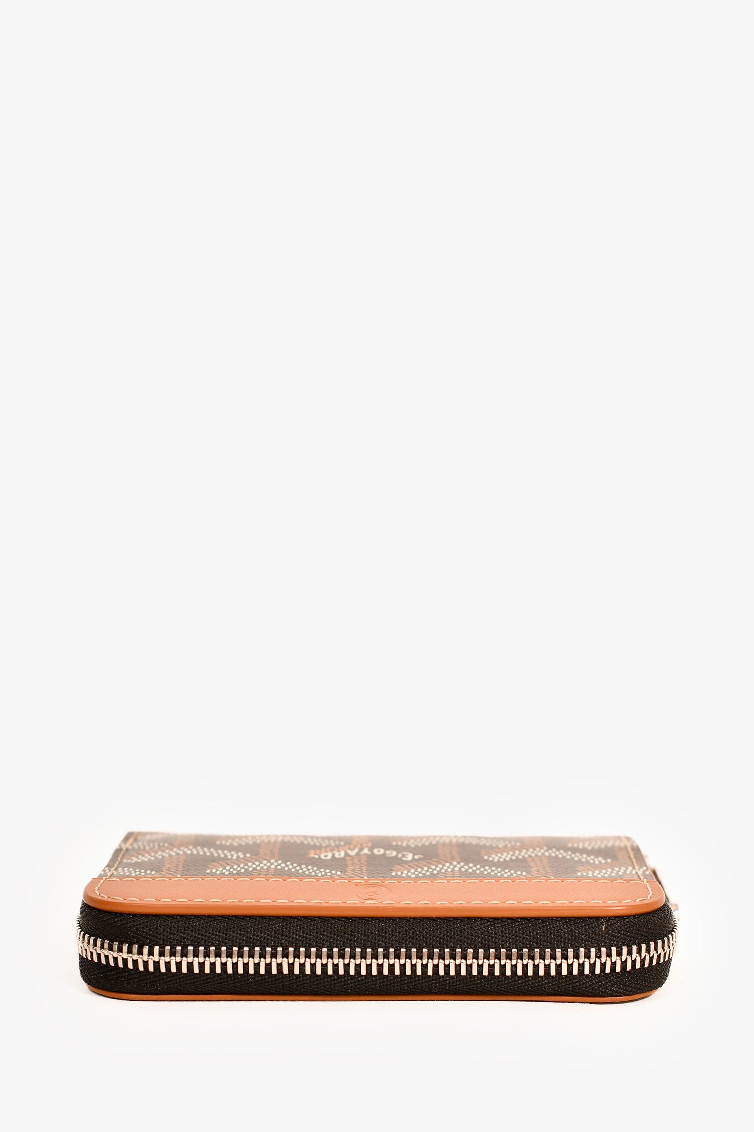 Refresh availabilityGoyard Black Canvas Tan Leather "Matingon Mini' Wallet. Top zipper closure. Single interior coin compartment with a card slot. Silver-tone hardware. Leather lining. Tonal stitching.