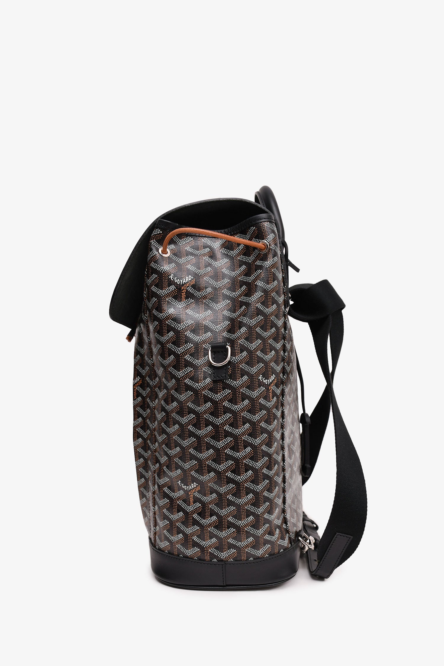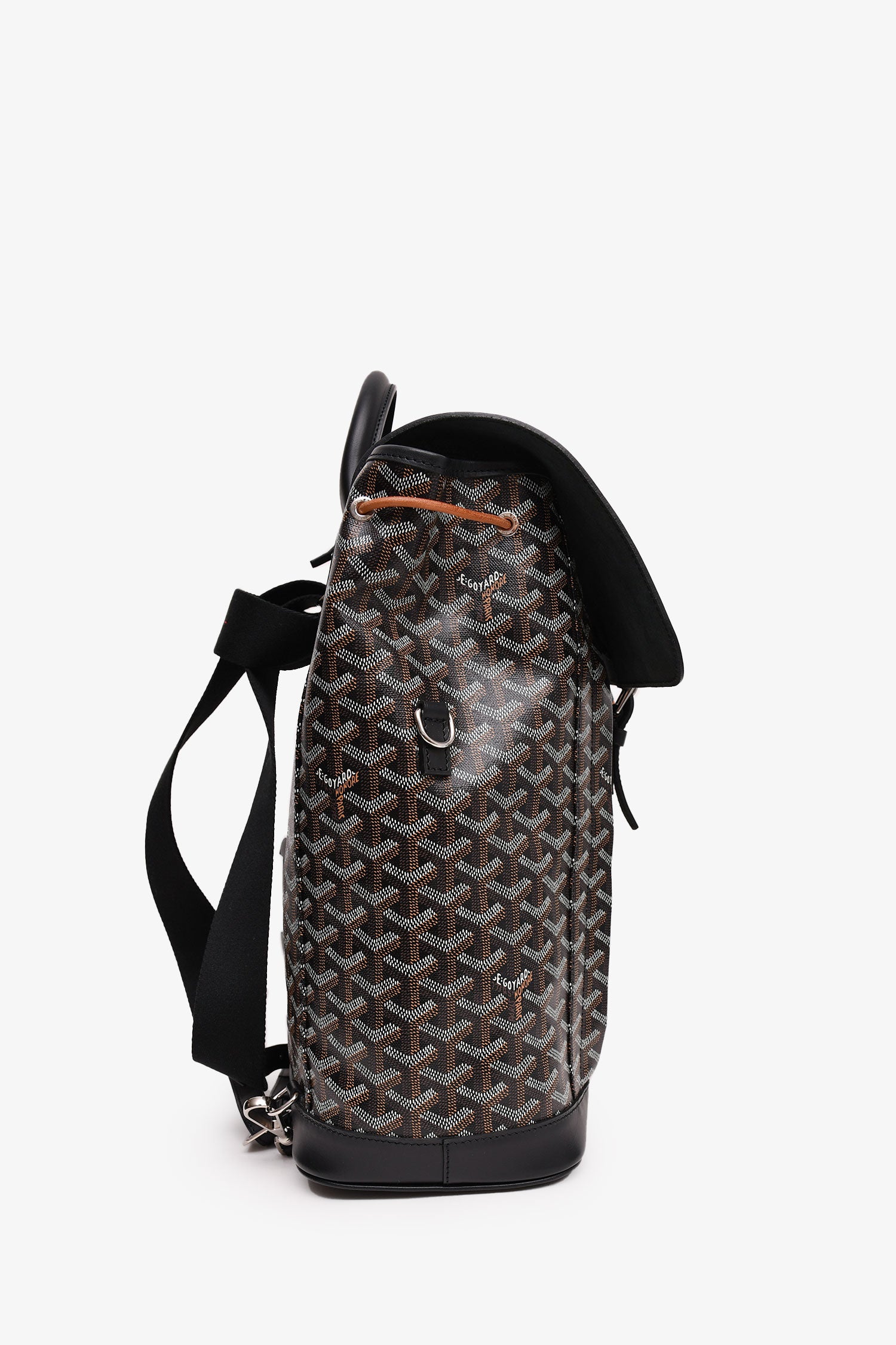 Refresh availabilityGoyard Black Goyardine Alphin Backpack with Monogram. Leather trimming, base, and fold-over flap. Silver-tone hardware. Leather pull tabs. Coated monogram canvas. Lined canvas interior. 1 zipped interior compartment and 1 single slip pouch.