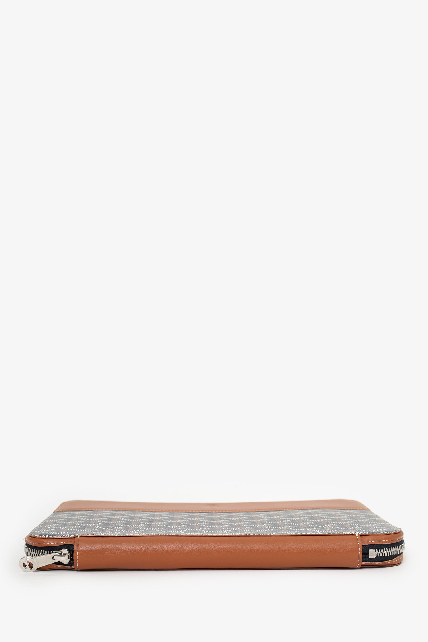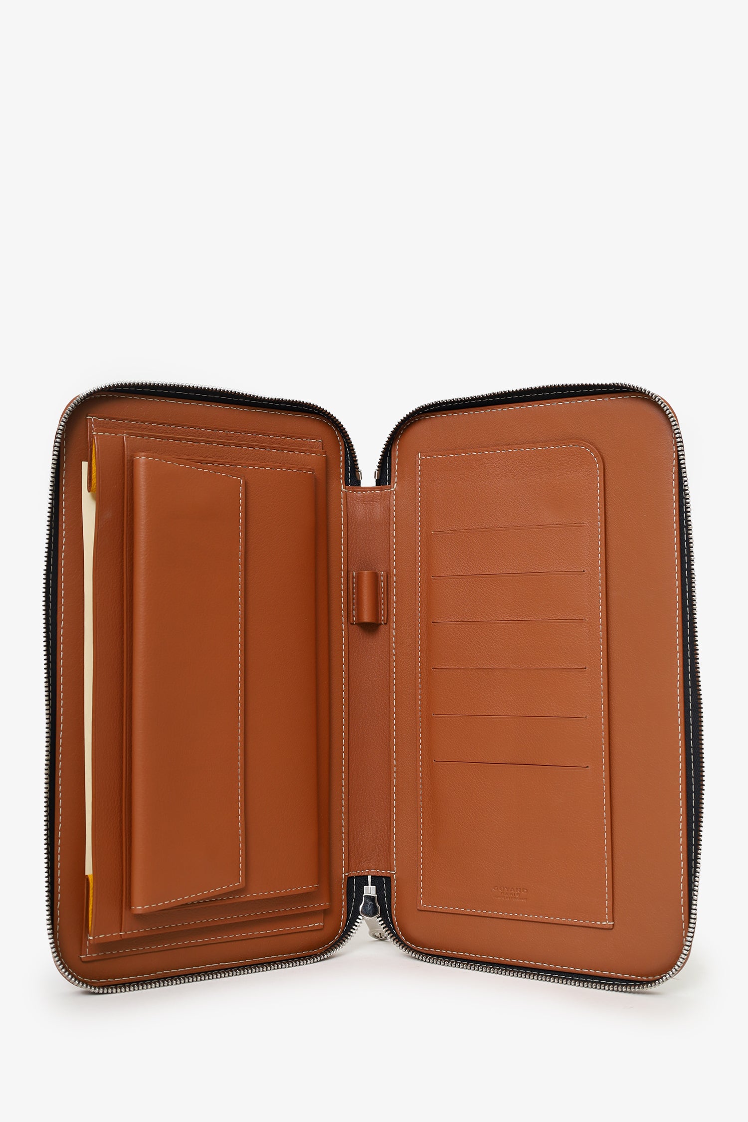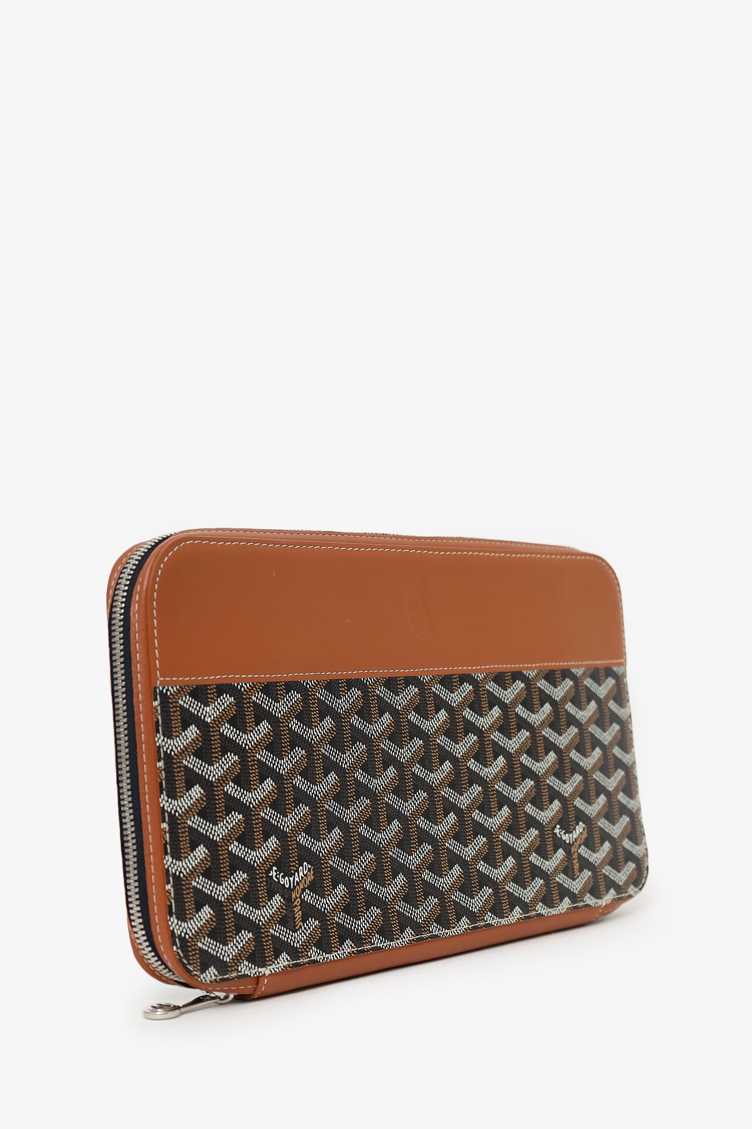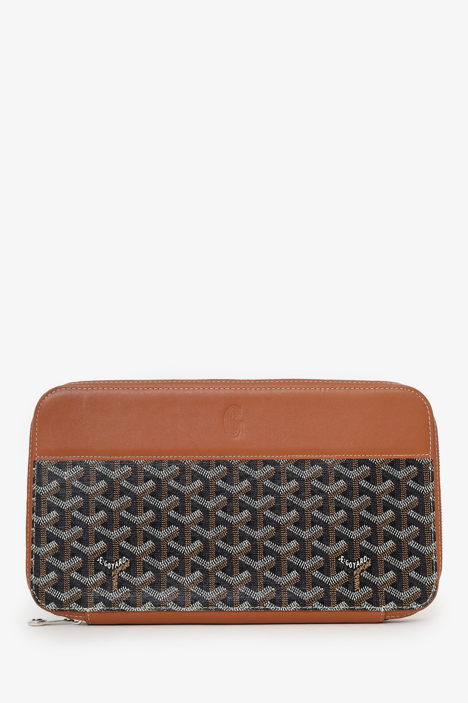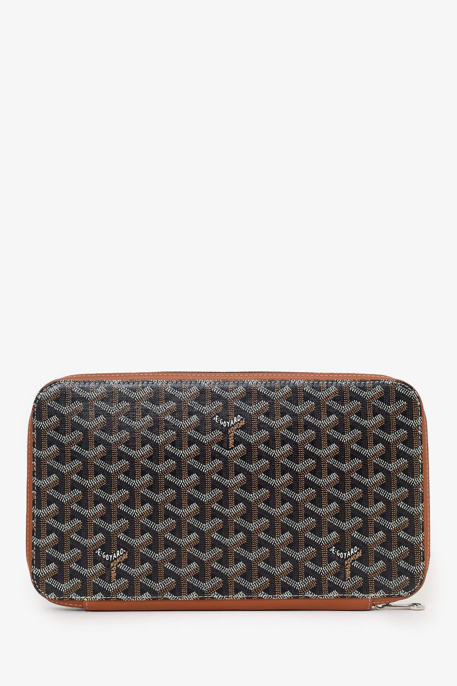 Refresh availabilityGoyard Black Goyardine Canvas/Brown Leather Opera Travel Organizer. Side zip closure. Lined interior; 6 card slots; 3 slip compartments and flap compartment with snap-button closure; 1 pen slot. Silver-tone hardware. Contrast stitching.
