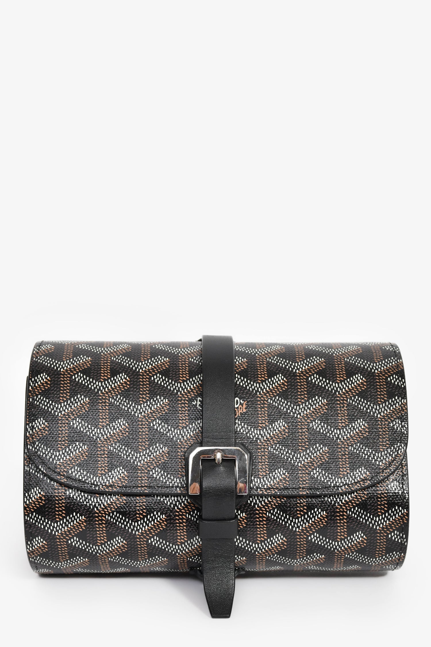 Refresh availabilityGoyard Black Goyardine Leather Double Travel Watch Case. Bi-fold opening. Buckle and strap fastening. Leather-lined interior with two watch holders. Silver-tone hardware. Tonal stitching.