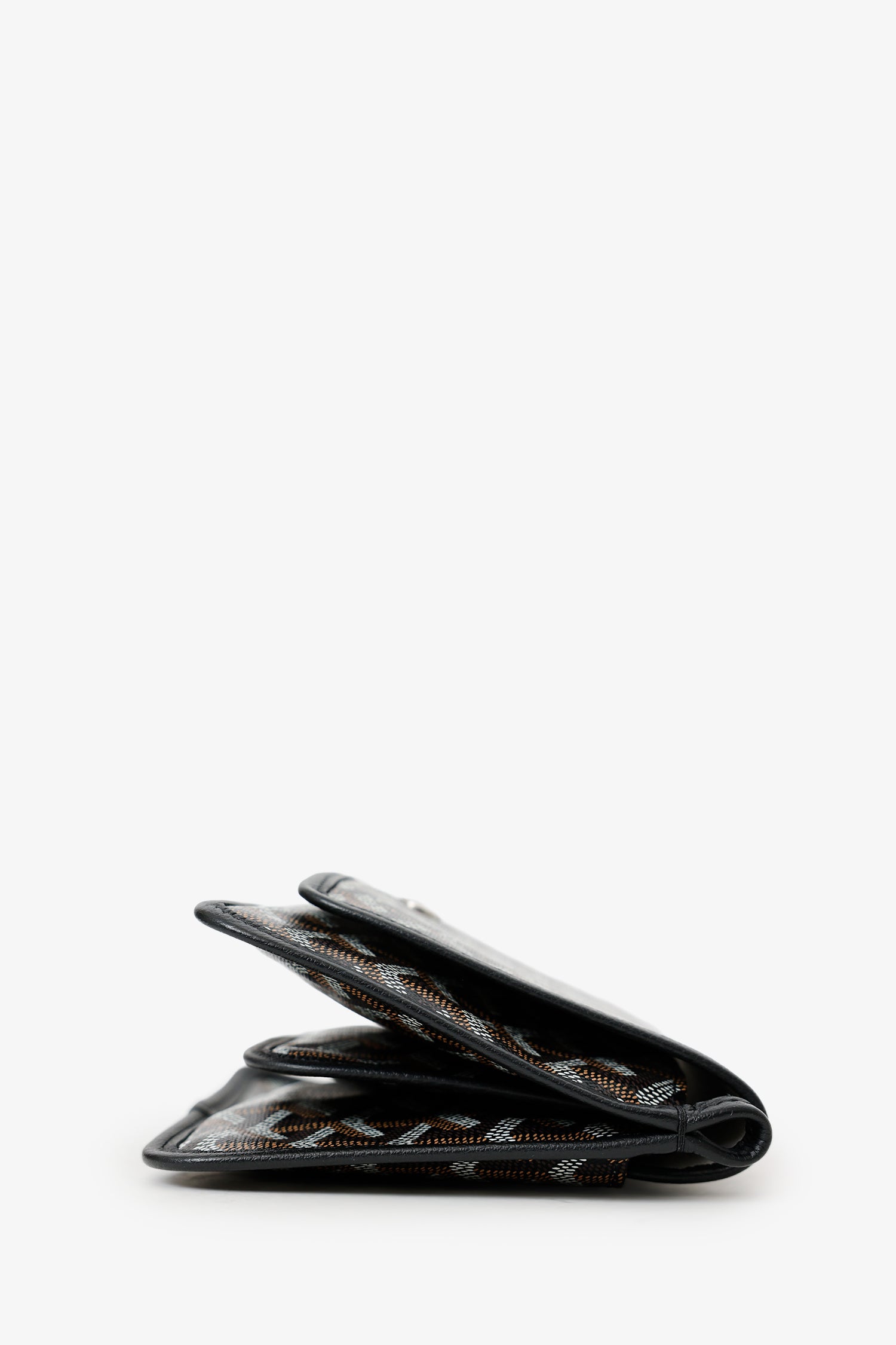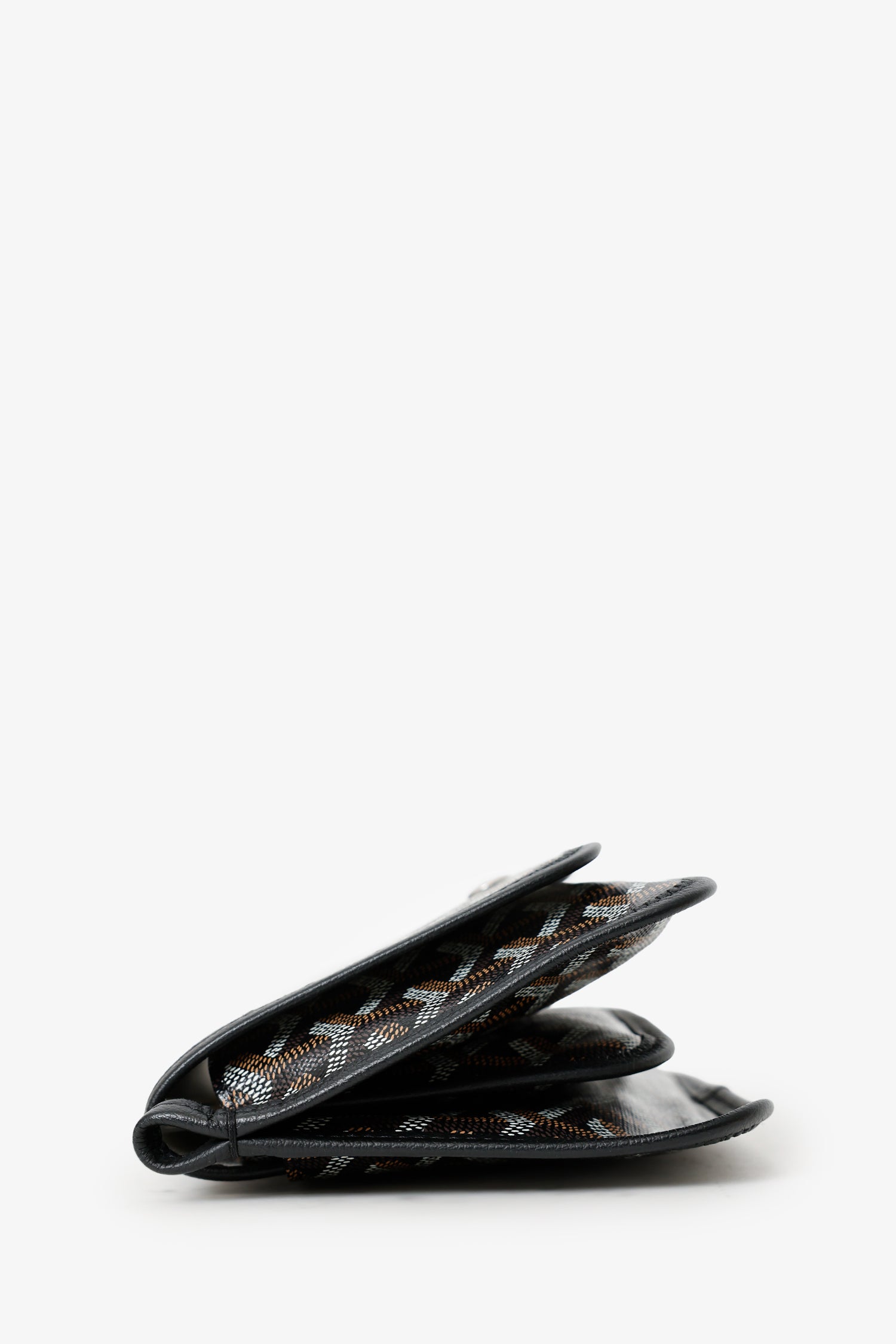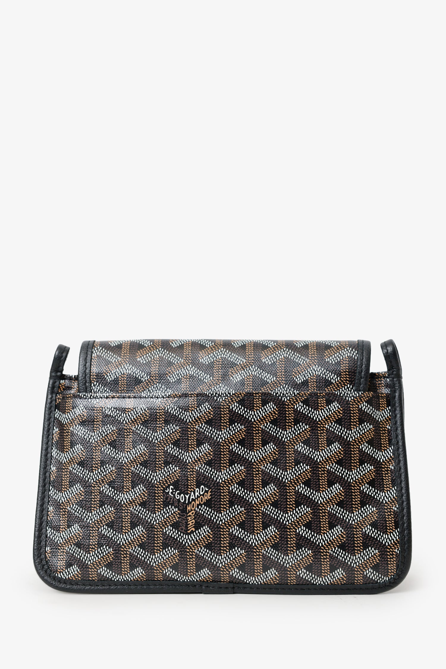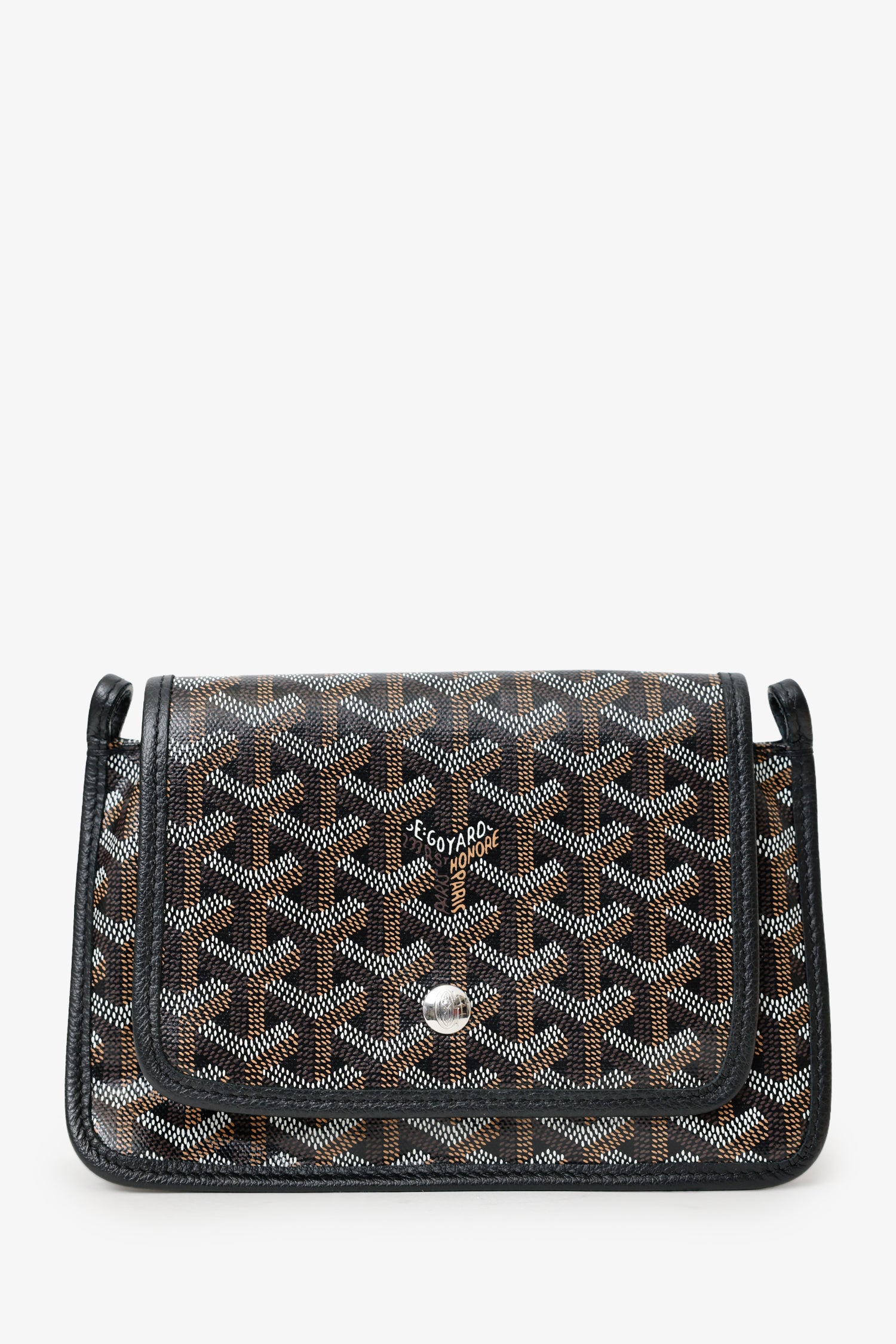 Refresh availabilityGoyard Black Goyardine Plumet Crossbody Bag. Front fold-over flap with button-up closure. Removable crossbody strap with push-pin closure. 1 rear exterior slip pocket. Lined interior. 3 interior compartments; front compartment with 1 cardholder. Middle compartment is 1 pocket with zip closure. Rear compartment with 1 cardholder. Silver-tone hardware. Tonal stitching.
