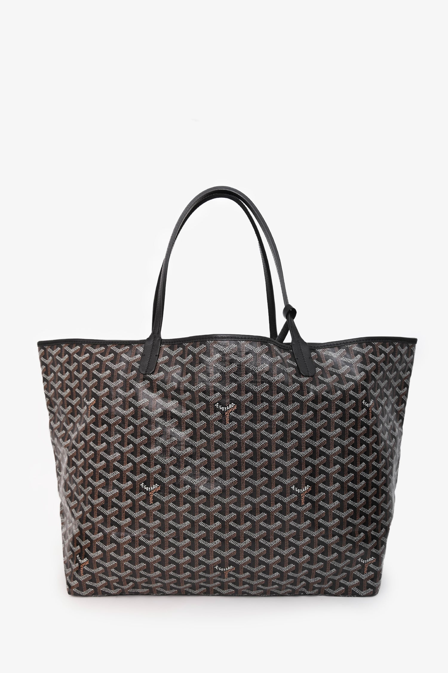 Refresh availabilityGoyard Black Goyardine St. Louis GM Tote with pouch. Top open. Dual flat leather shoulder straps; detachable interior pouch included with snap button closure. Canvas-lined interior. Silver-hardware. Tonal stitching.