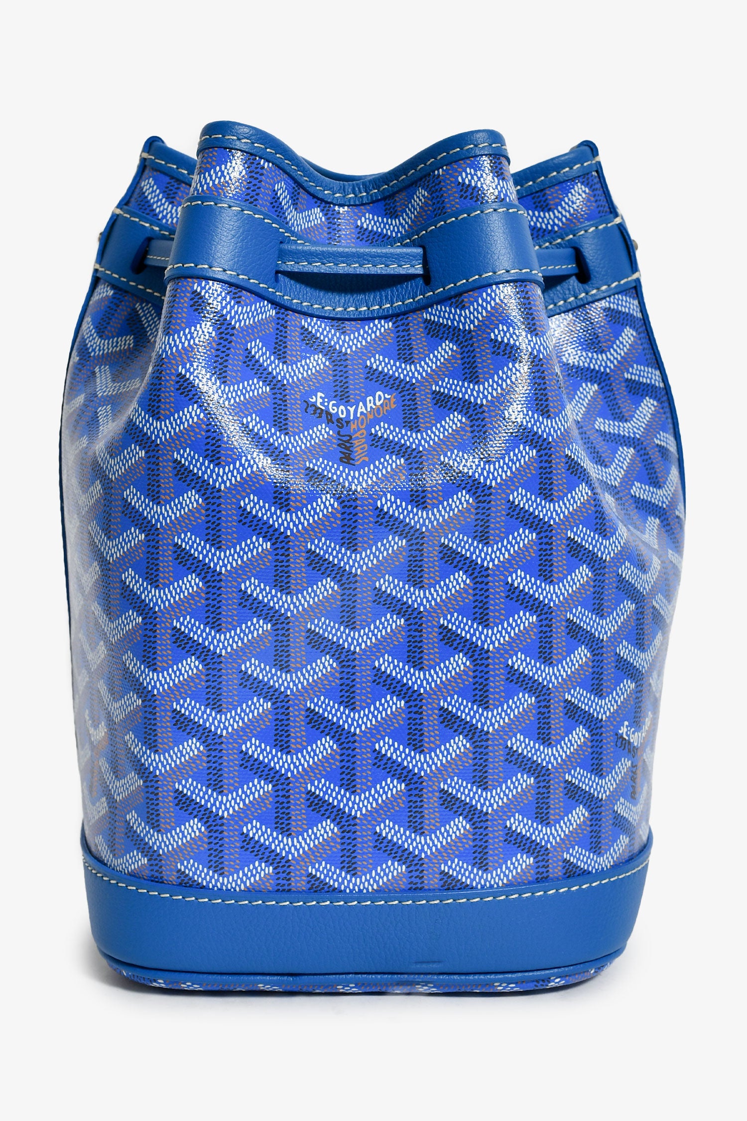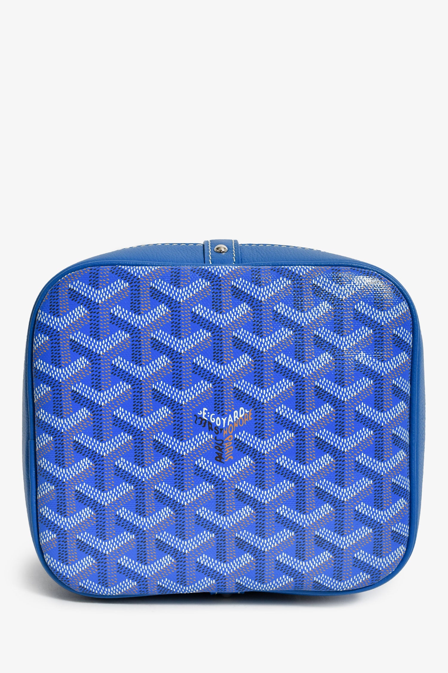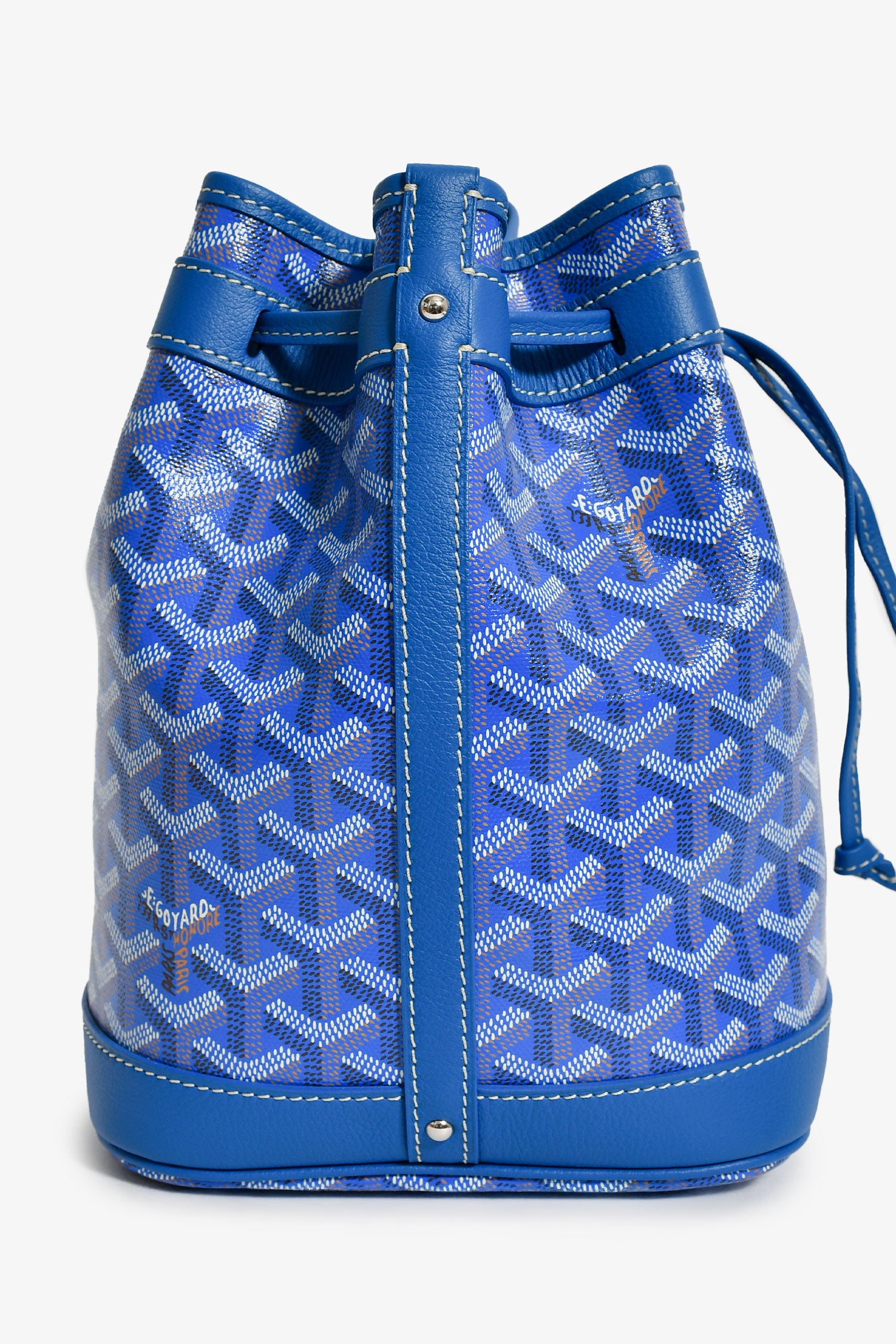 Refresh availabilityGoyard Blue Goyardine Petit Flot Bucket Bag. Front drawstring closure. Single interior compartment. Textile-lined interior. Silver-tone hardware. Contrast stitching.