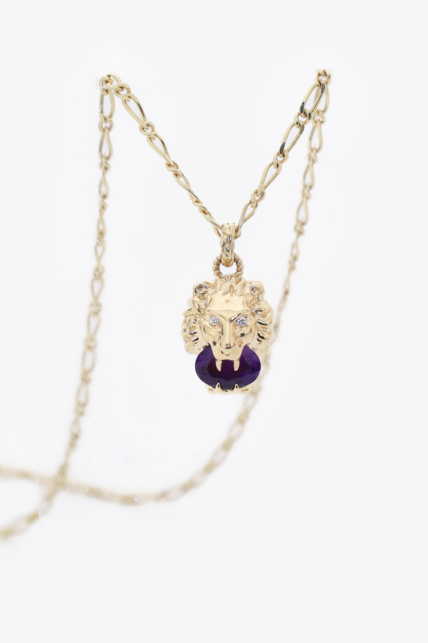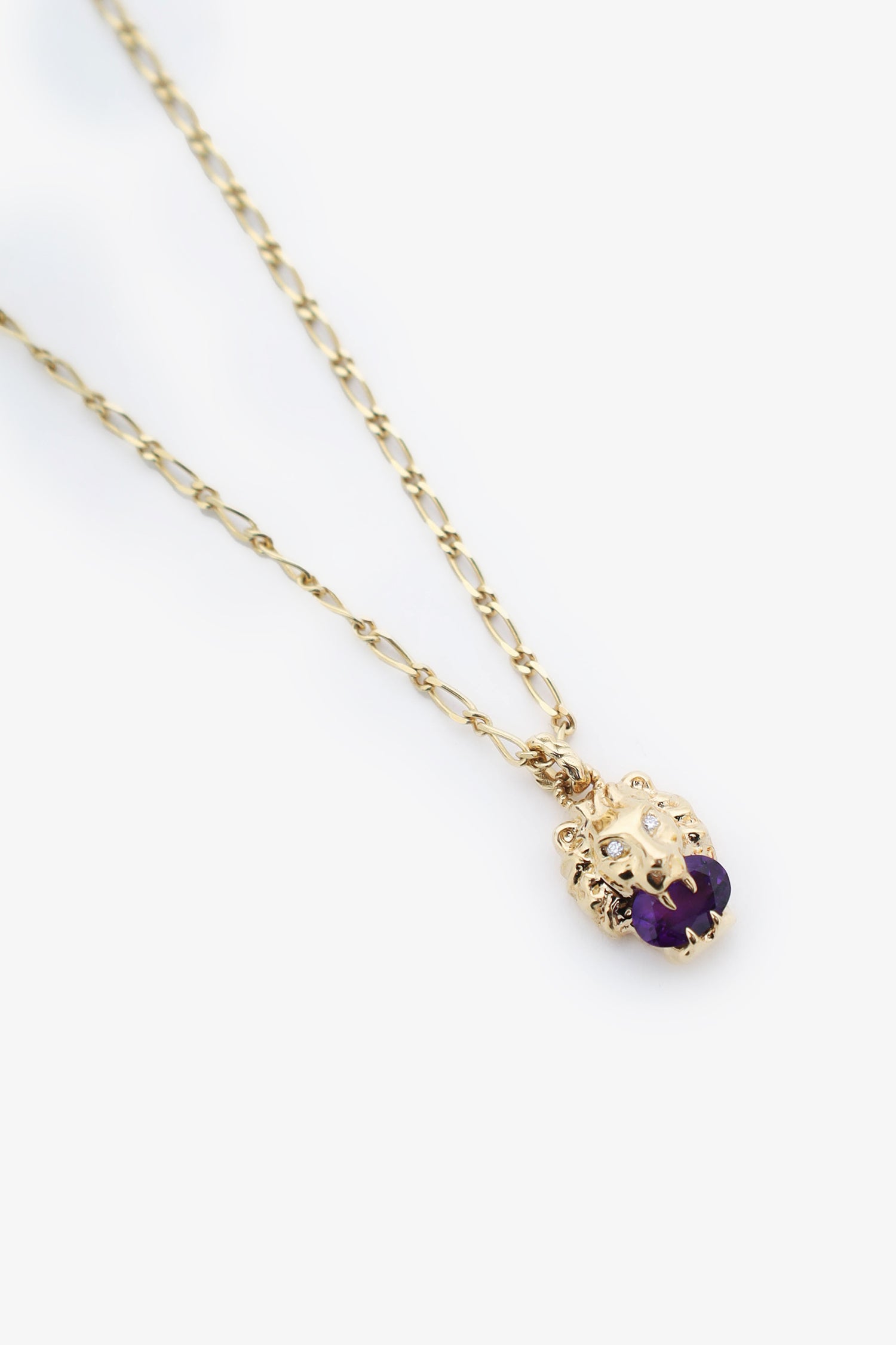 Refresh availabilityGucci 18K Yellow Gold Diamond Amethyst Stone Lion Necklace. Lobster clasp closure with 2 adjustable lengths.