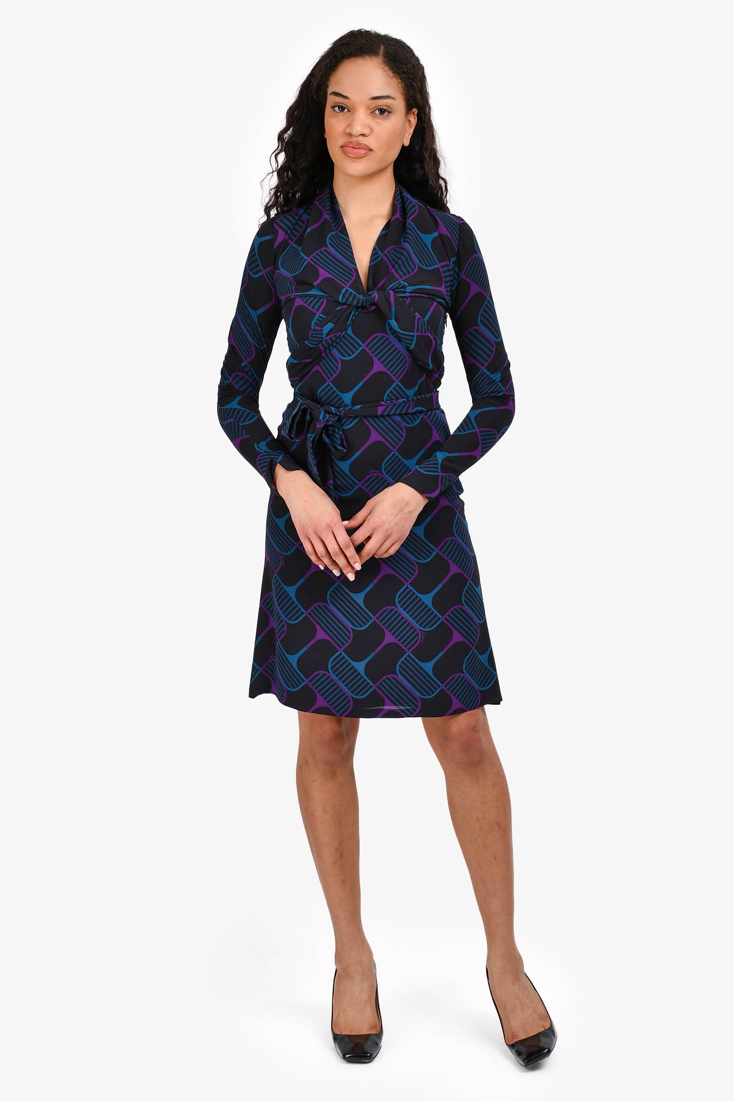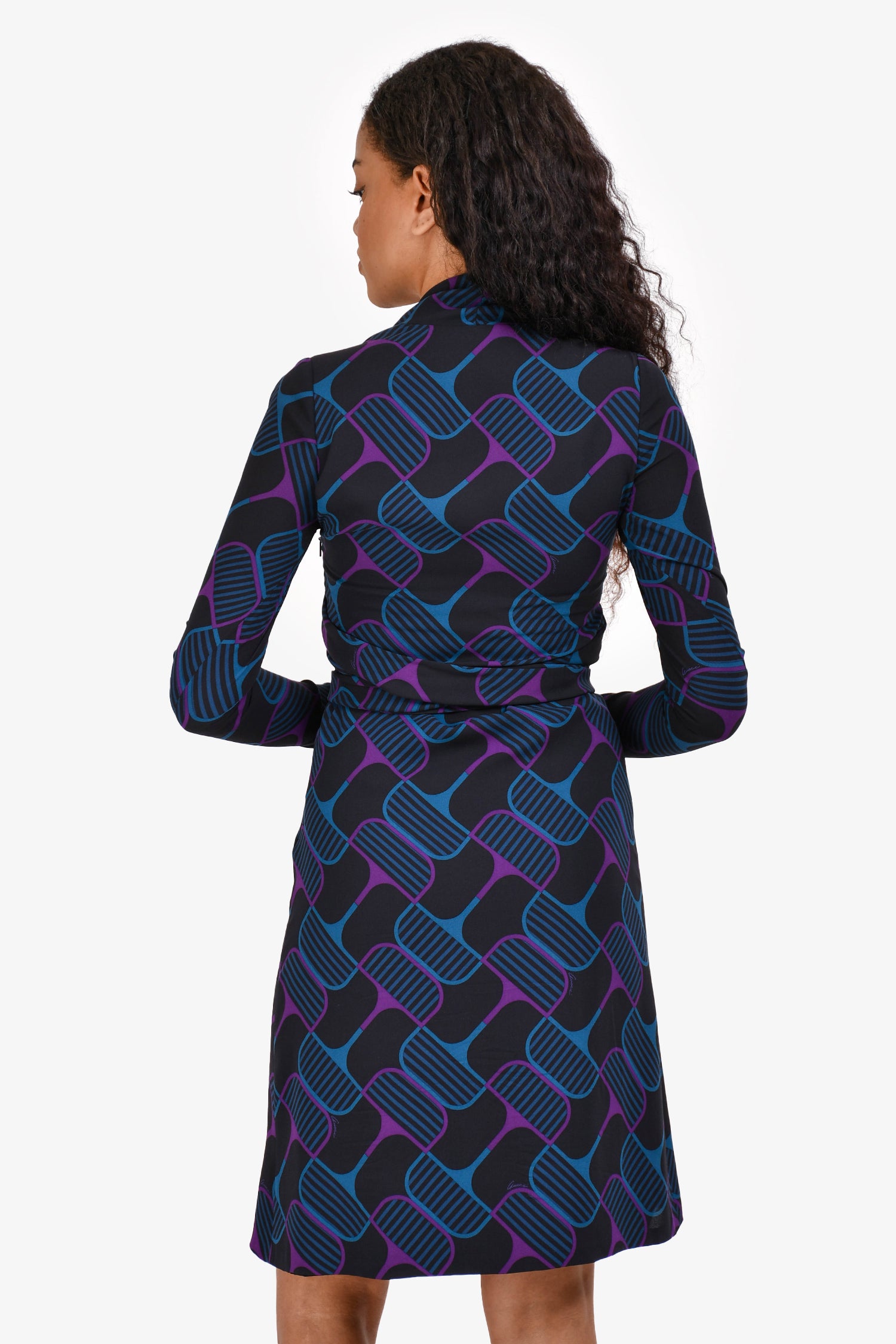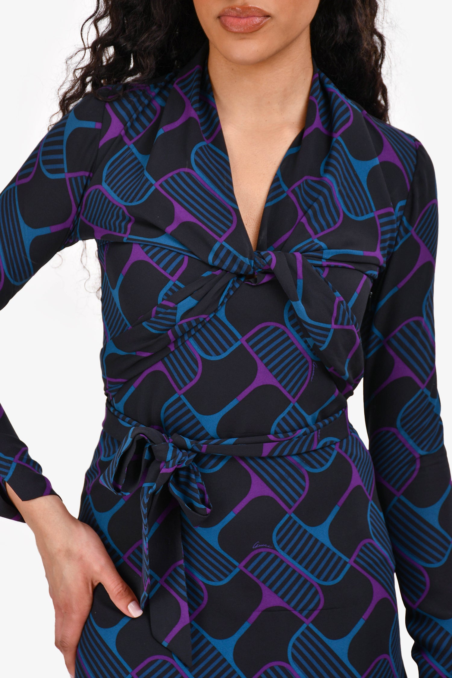 Refresh availabilityGucci 2006 Black/Purple/Blue Silk Belted Mini Dress. High cowl neck. Side zip closure. Front criss-cross tie that does up on back. Lined. Tonal stitching.