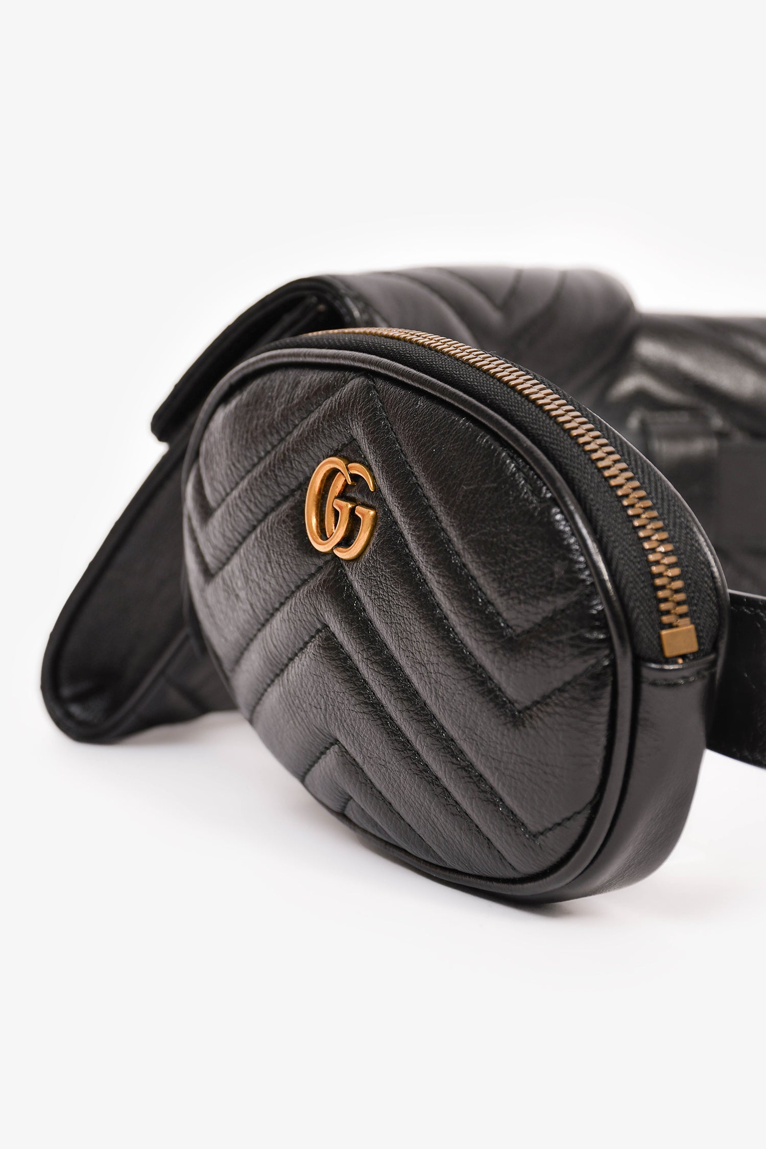 Refresh availabilityGucci 2018 Black Marmont Matelasse Multi Pocket Belt Bag. Antiqued gold-tone hardware. 3 pochettes: 1 regular, 1 square, and 1 oval. Suede lined interiors. Adjustable belt strap. Tonal stitching.