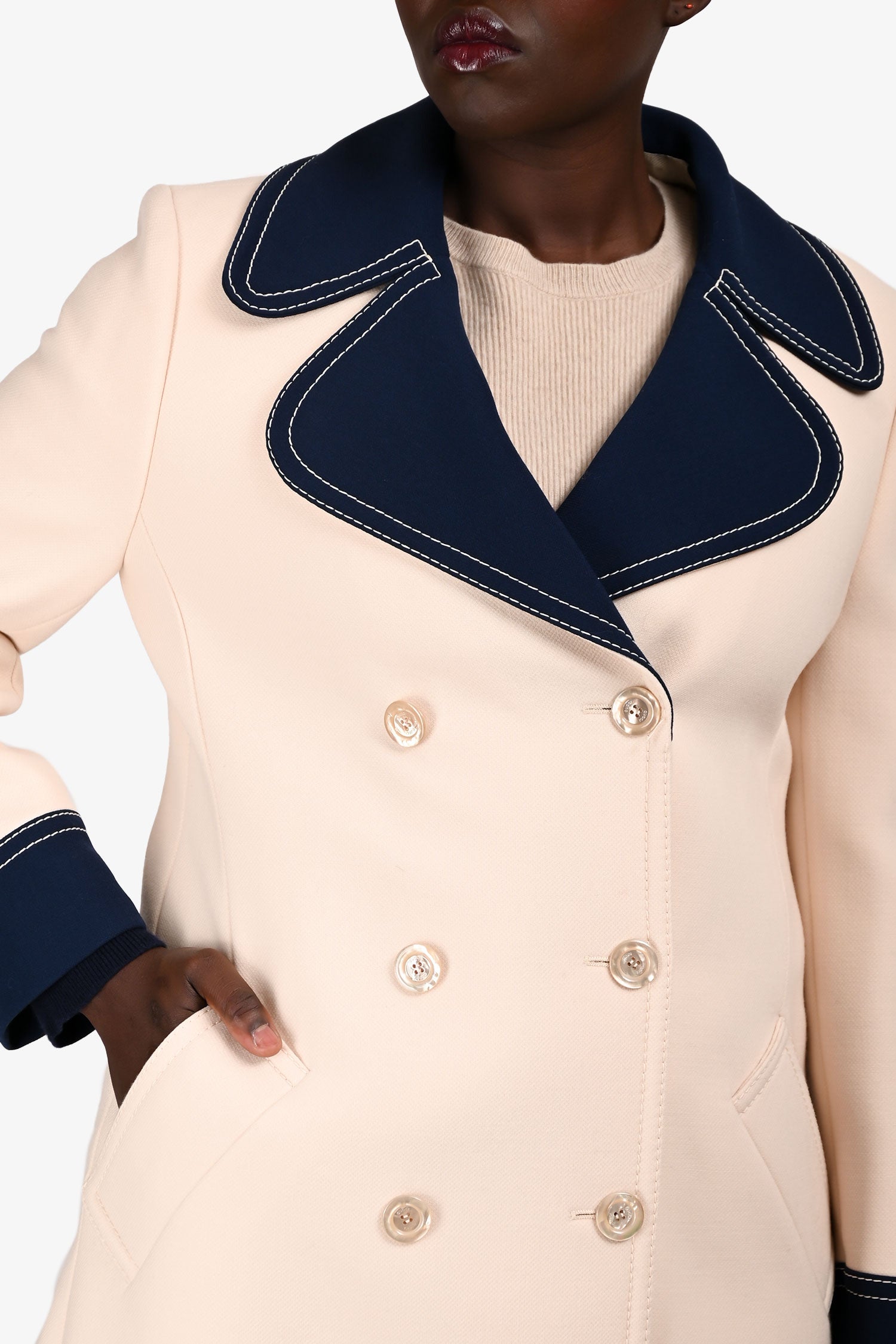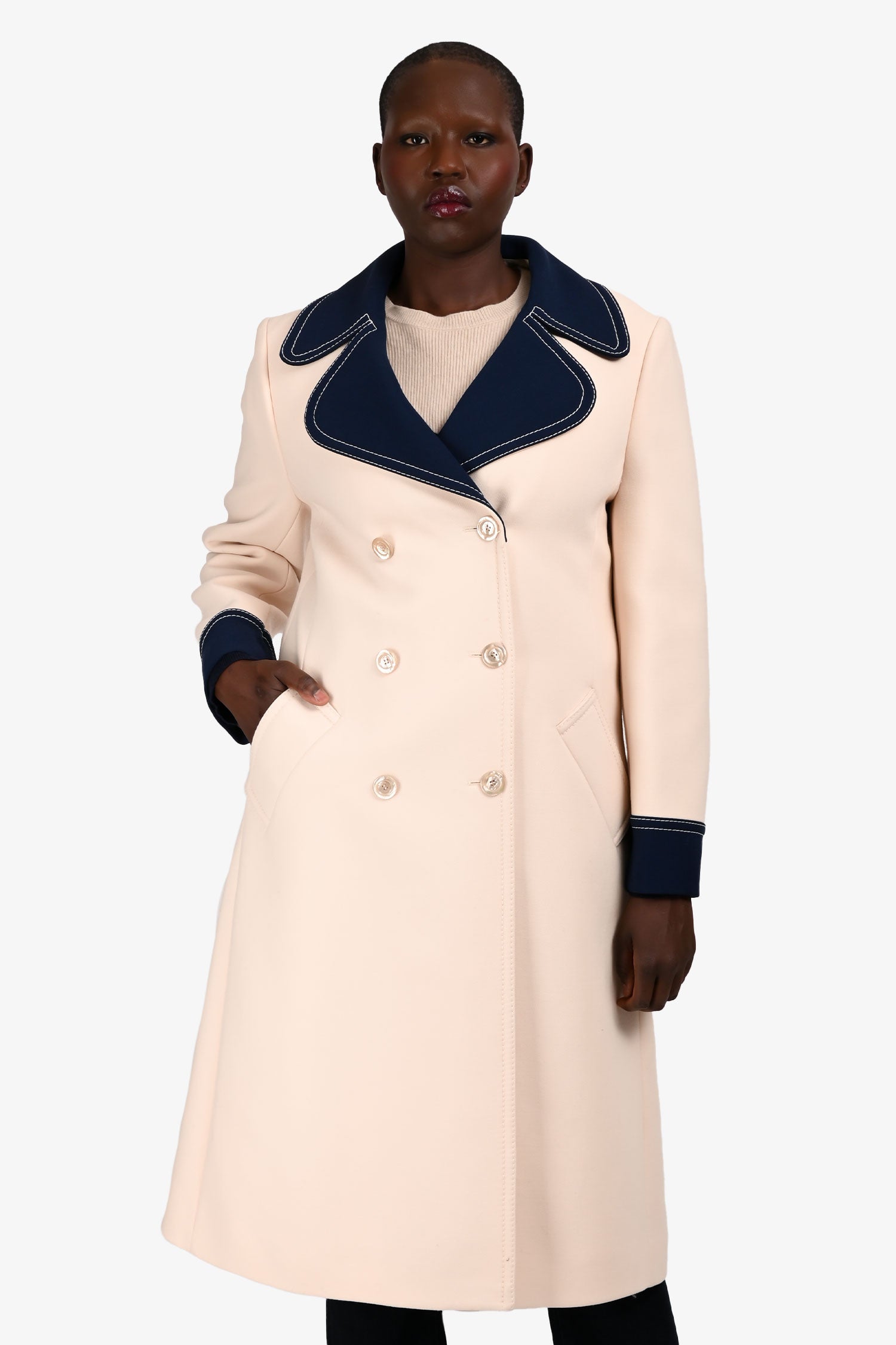 Refresh availabilityGucci White/Blue Wool Stitch Detail Coat. Pull-on. Notch lapel. Double-breasted front button-up closure. 2 exterior slip pockets. Rear waist belt. Fully lined interior. Tonal and contrast stitching.