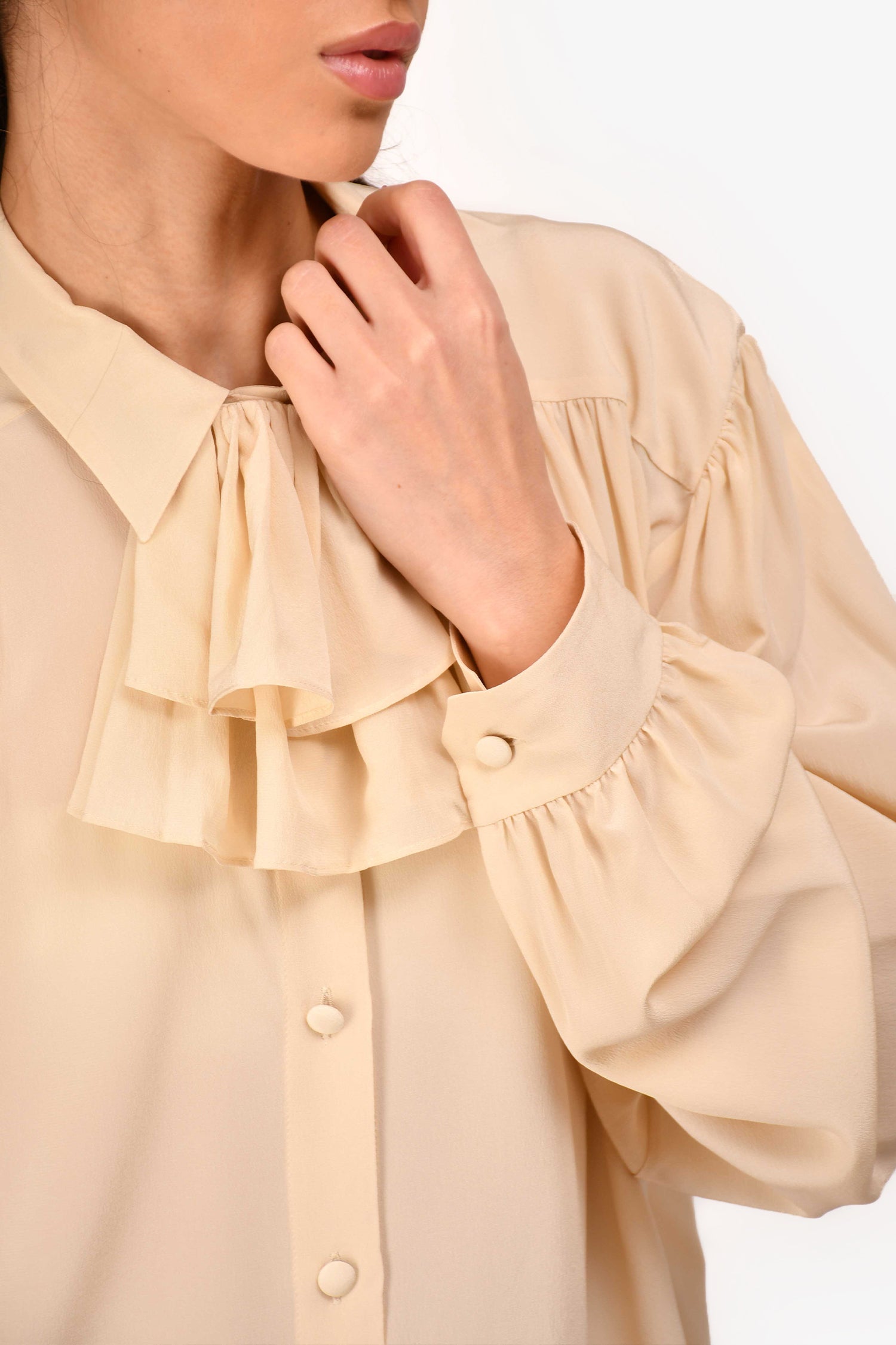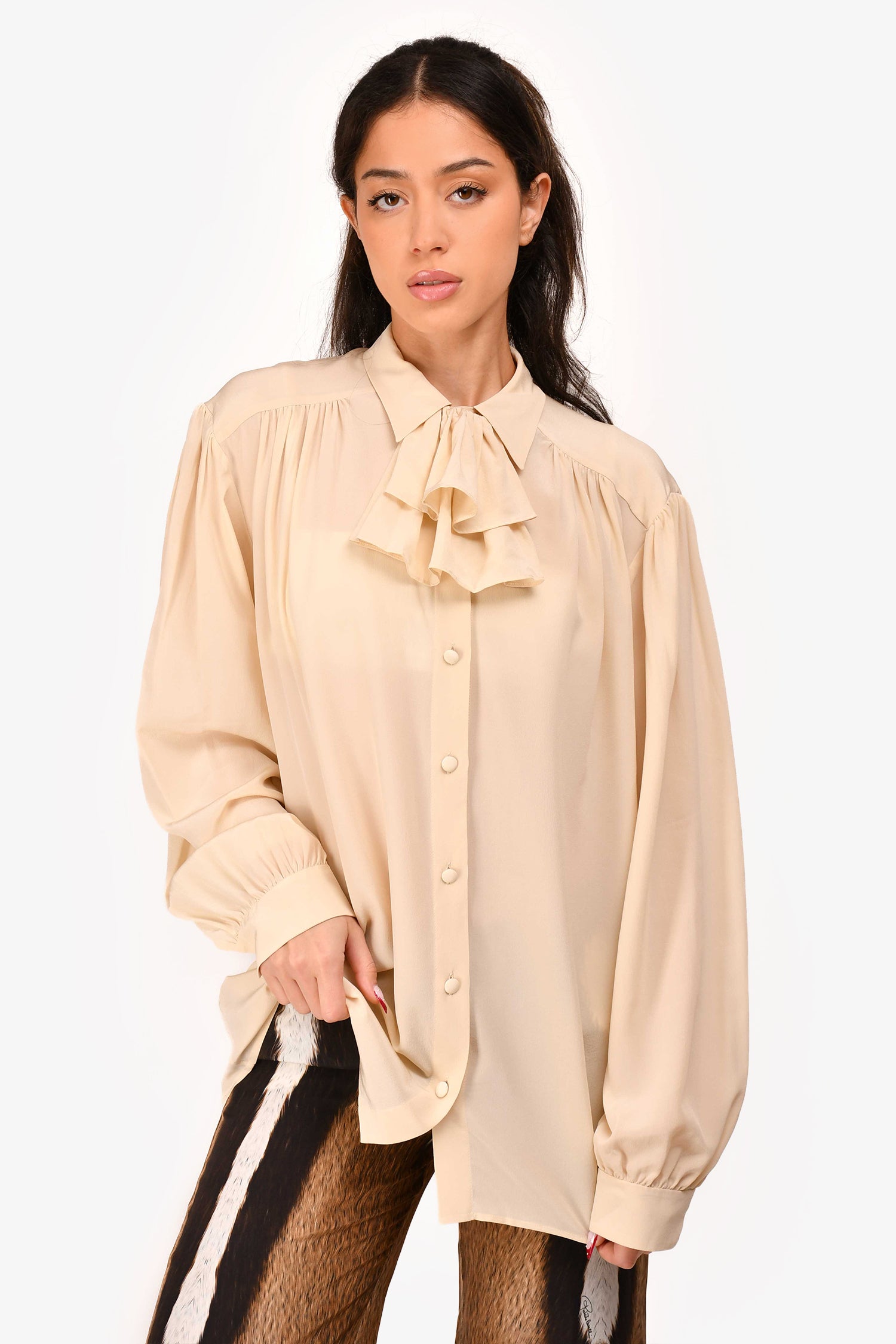 Refresh availabilityGucci 2020 Beige Silk Ribbon Detail Button Up Blouse. Fabric covered tonal buttons. Buttoned cuffs. Tonal stitching.