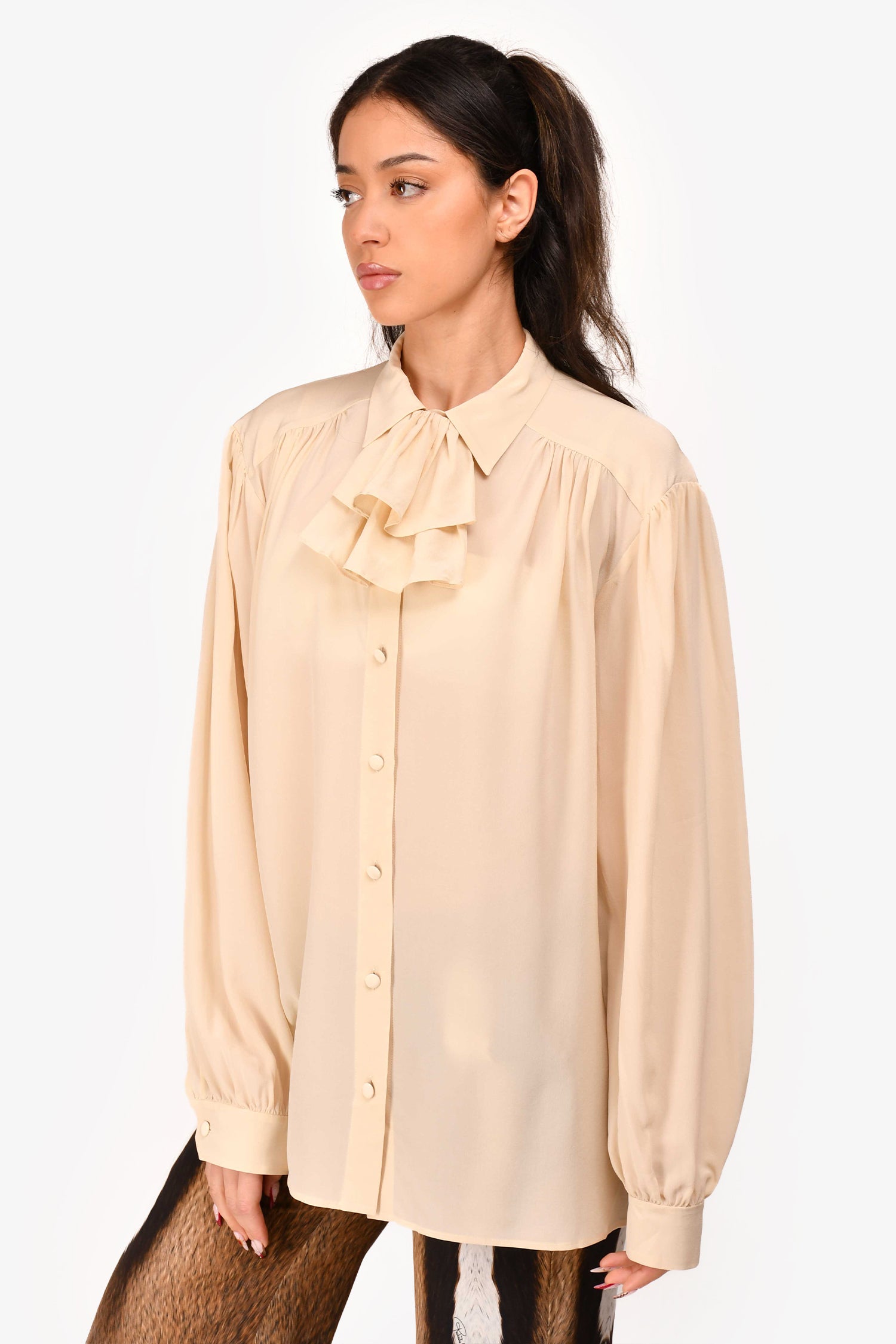 Gucci 2020 Beige Silk Ribbon Detail Button Up Blouse Size 44