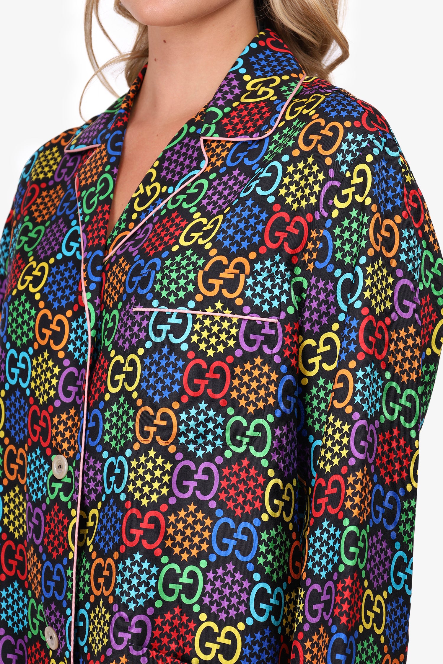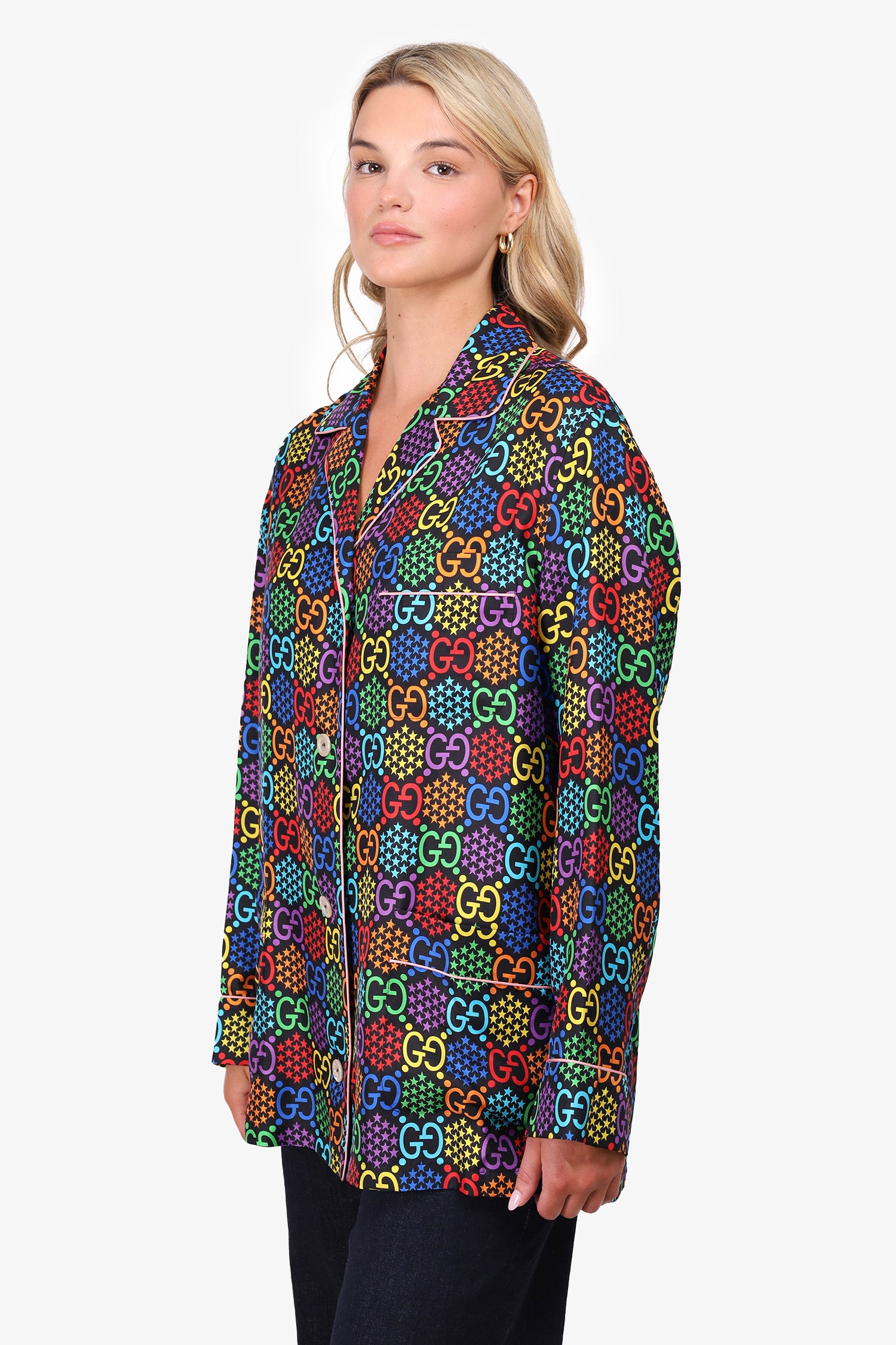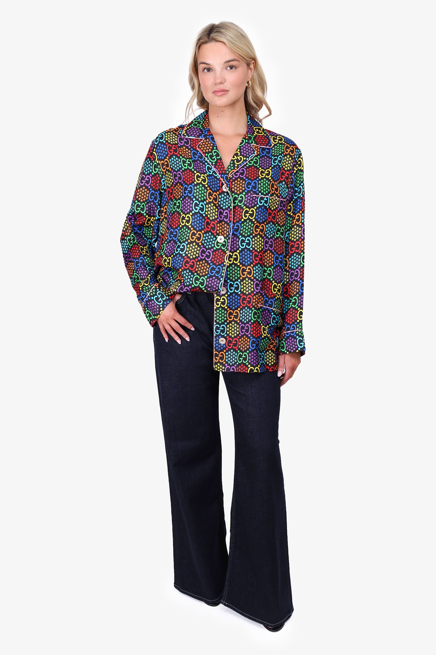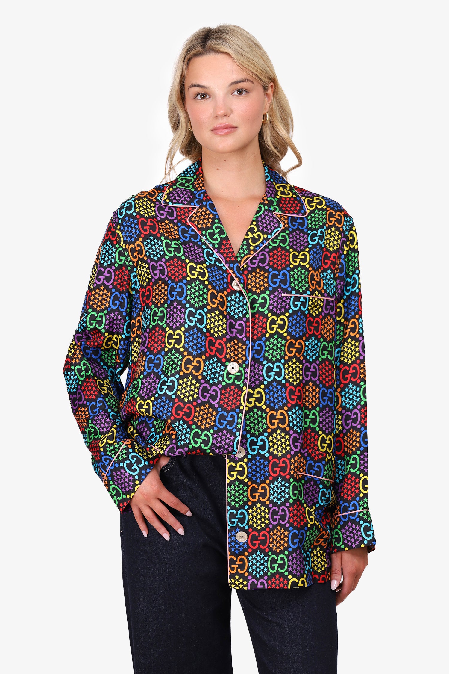 Refresh availabilityGucci 2020 Black/Multicolour GG Psychedelic Button-Up Top. Collared neckline. Button up closure on front. 3 slip pockets on front. Unlined. Contrast/tonal stitching.