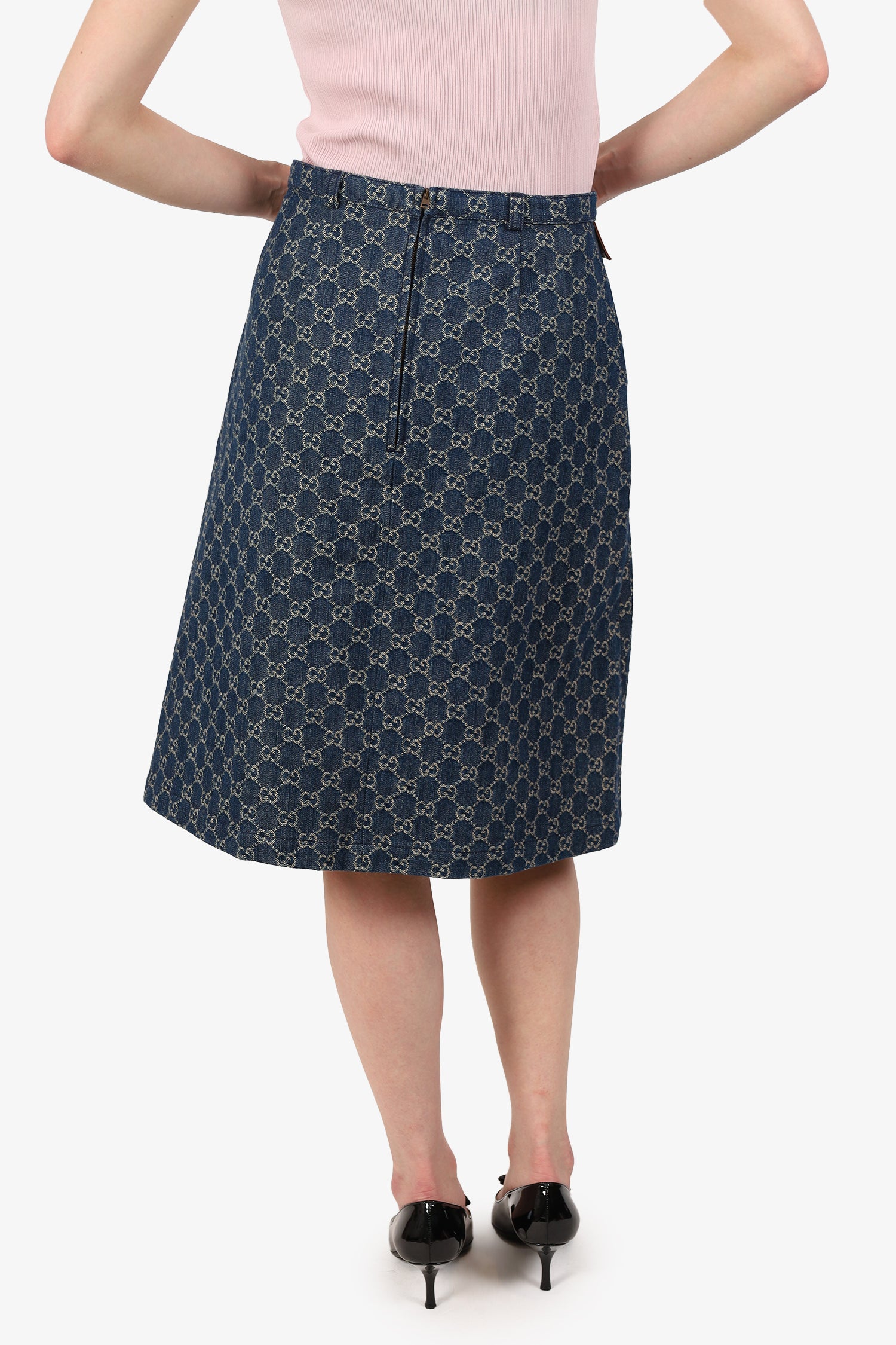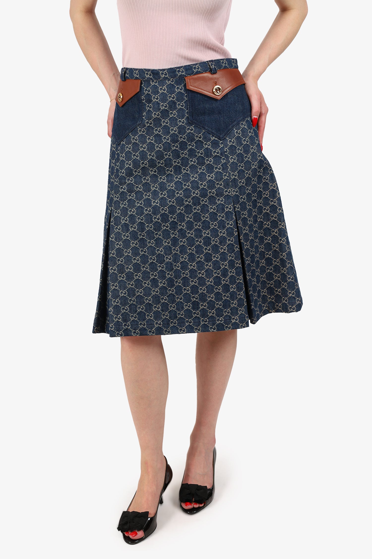 Refresh availabilityGucci 2021 Blue Denim Monogram/Brown Pleated Midi Skirt With Pockets. Slip-on. Rear zip closure. 2 front exterior pockets with button-up closure. Unlined. Gold-tone hardware. Tonal stitching.