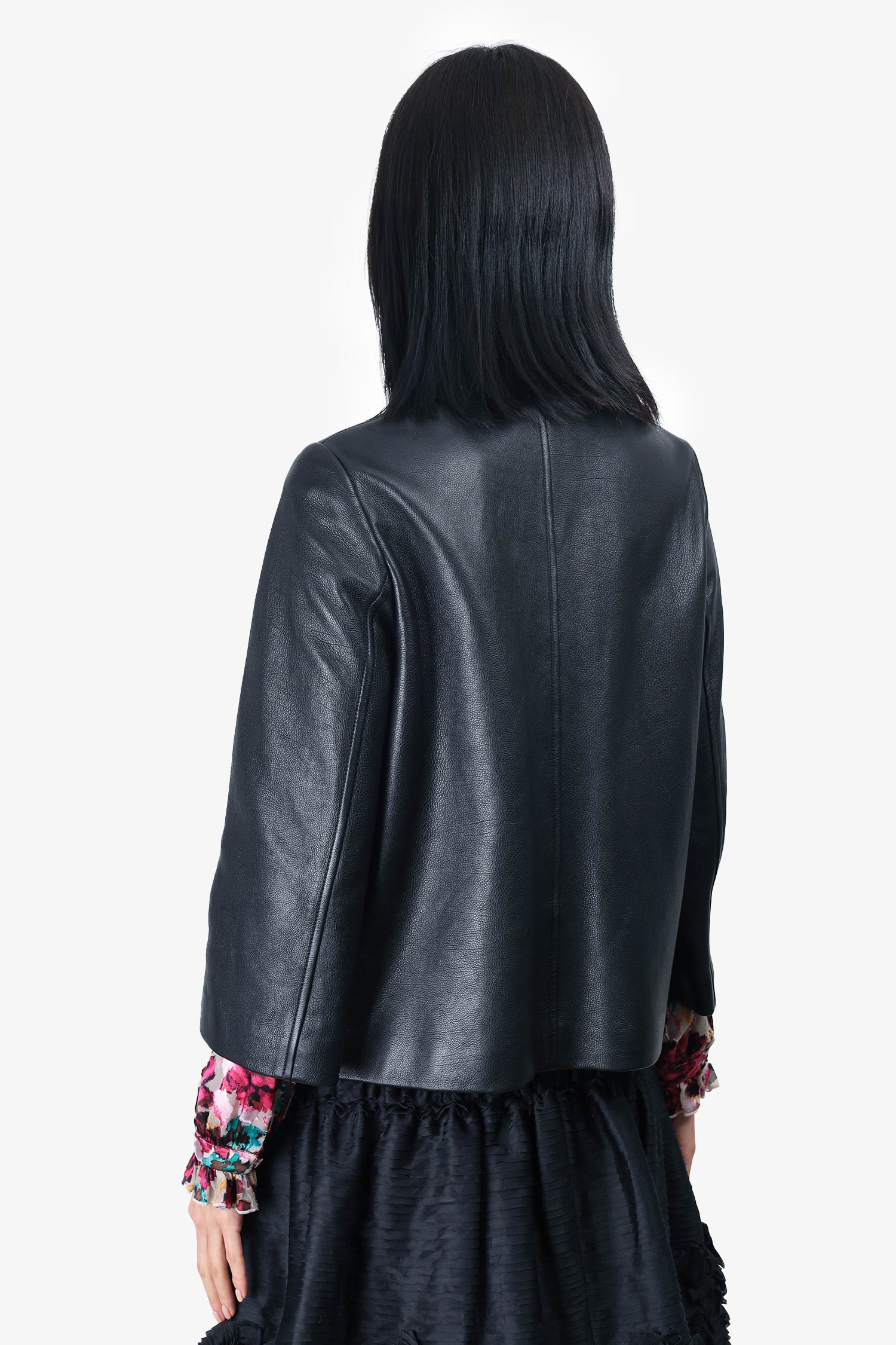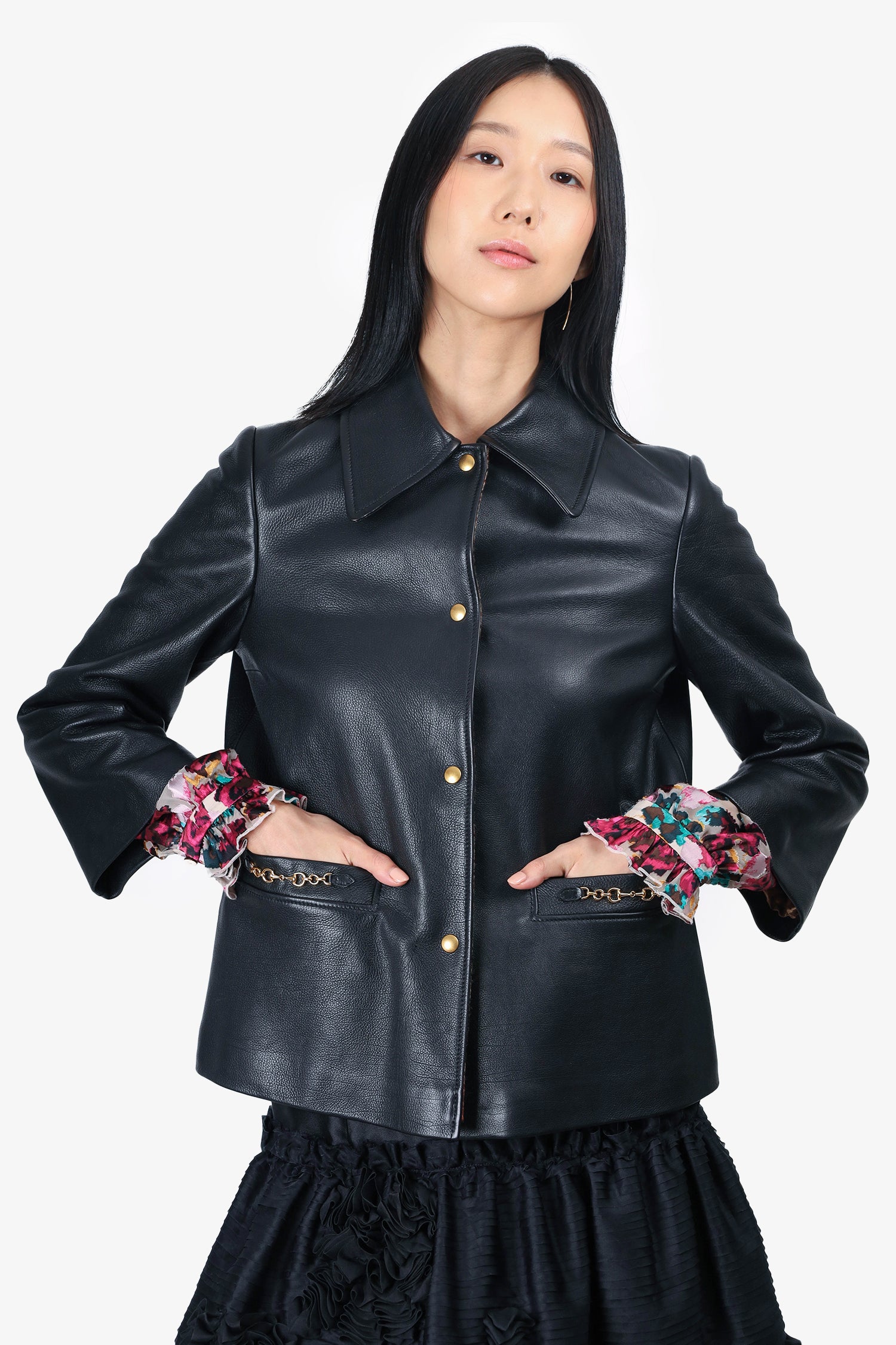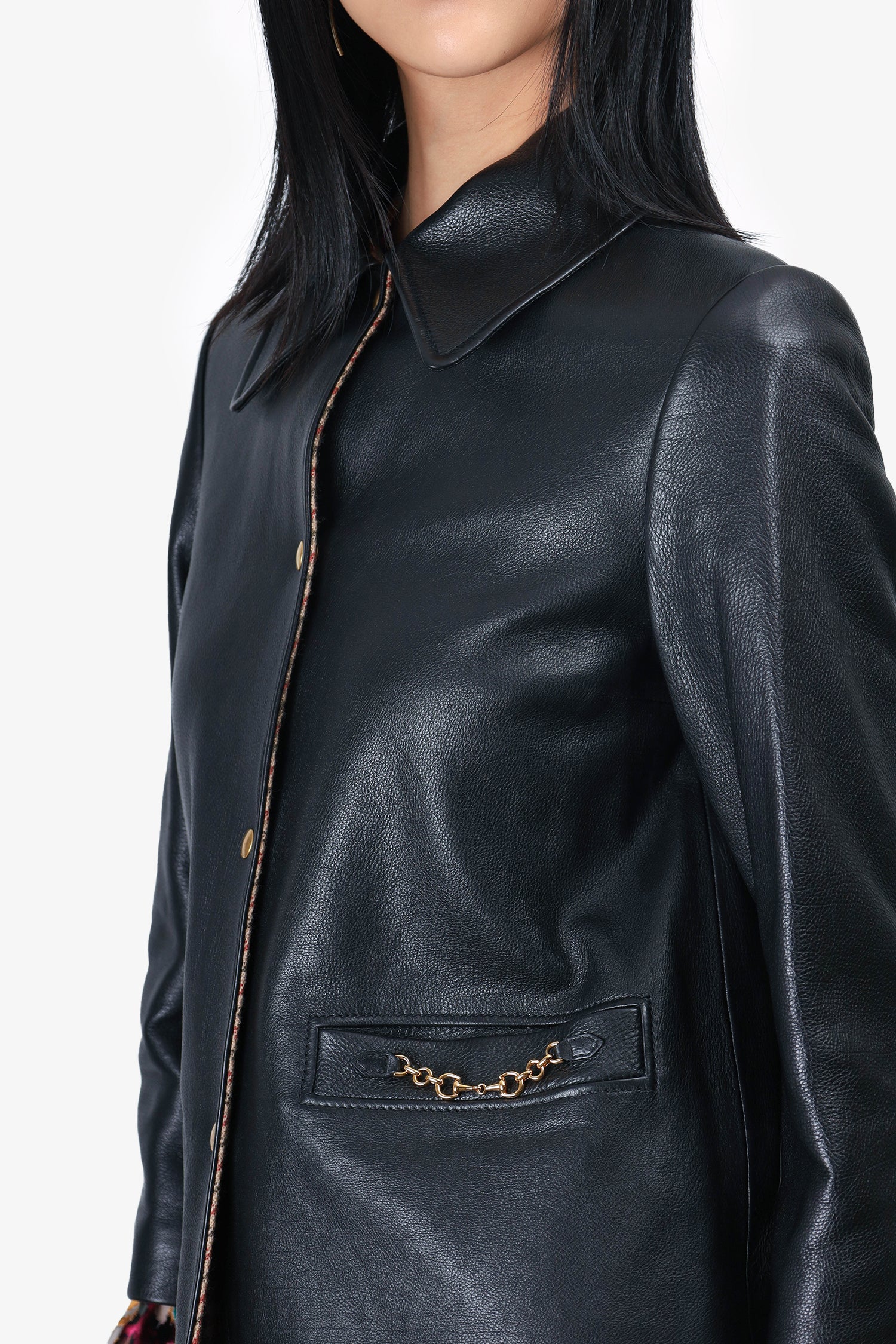 Refresh availabilityGucci 2023-2024 Black Calfskin Biker Jacket with Horsebit Chain Detail. Collared neckline. Front snap button closure. 2 front slip pockets. Chain detailing on slip pockets. Gold-tone hardware. Lined. Tonal stitching.