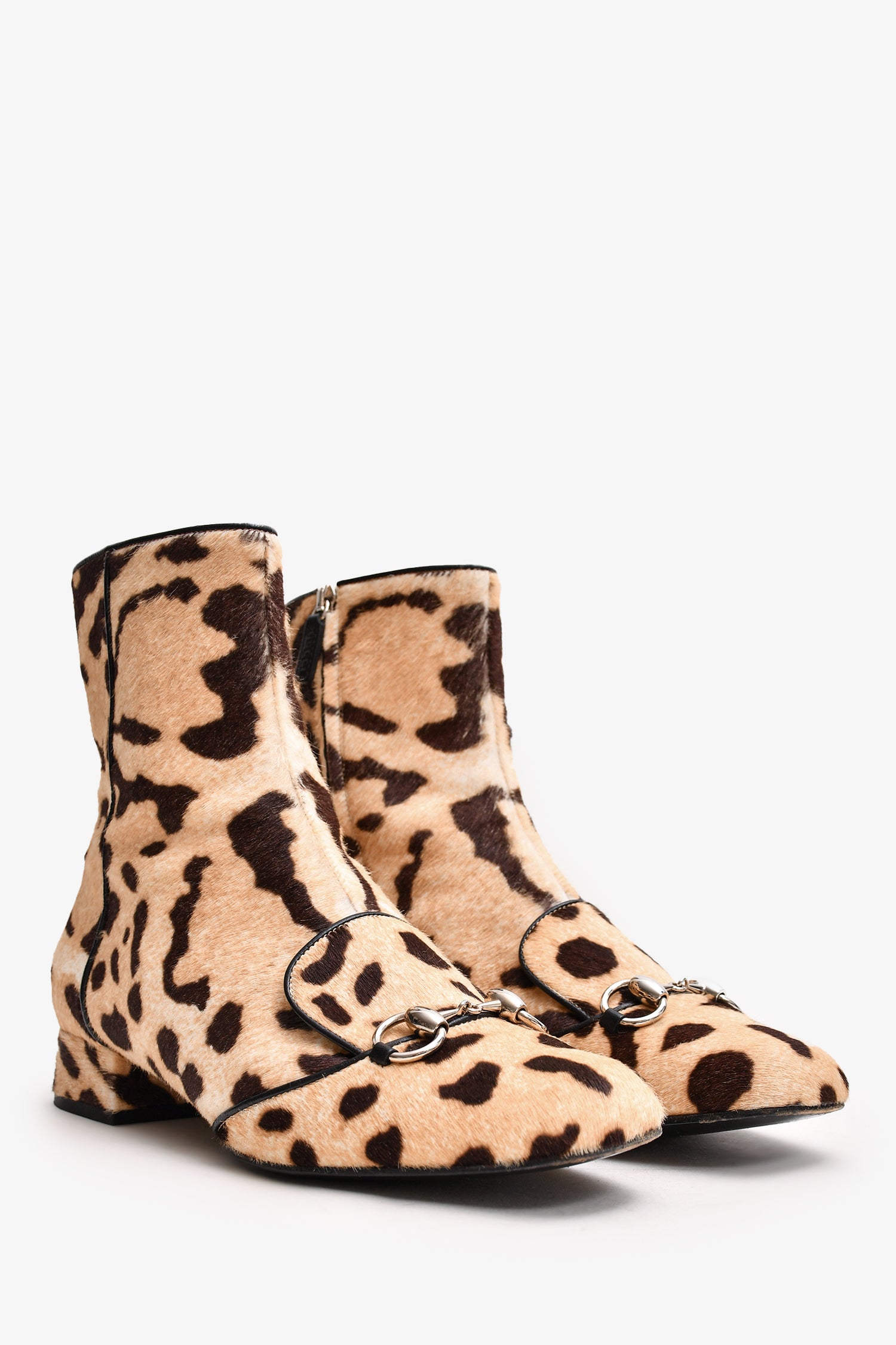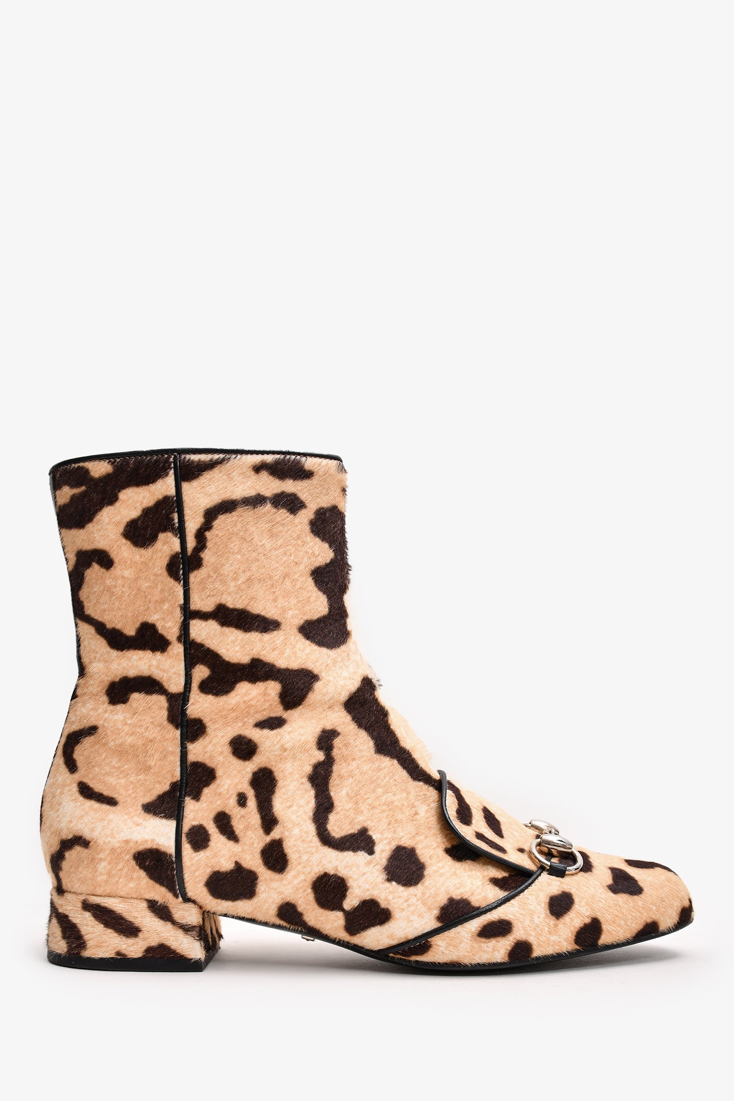 Refresh availabilityGucci Animal Print Pony Hair Horsebit Boots. Side zip up closure. Tonal stitching.