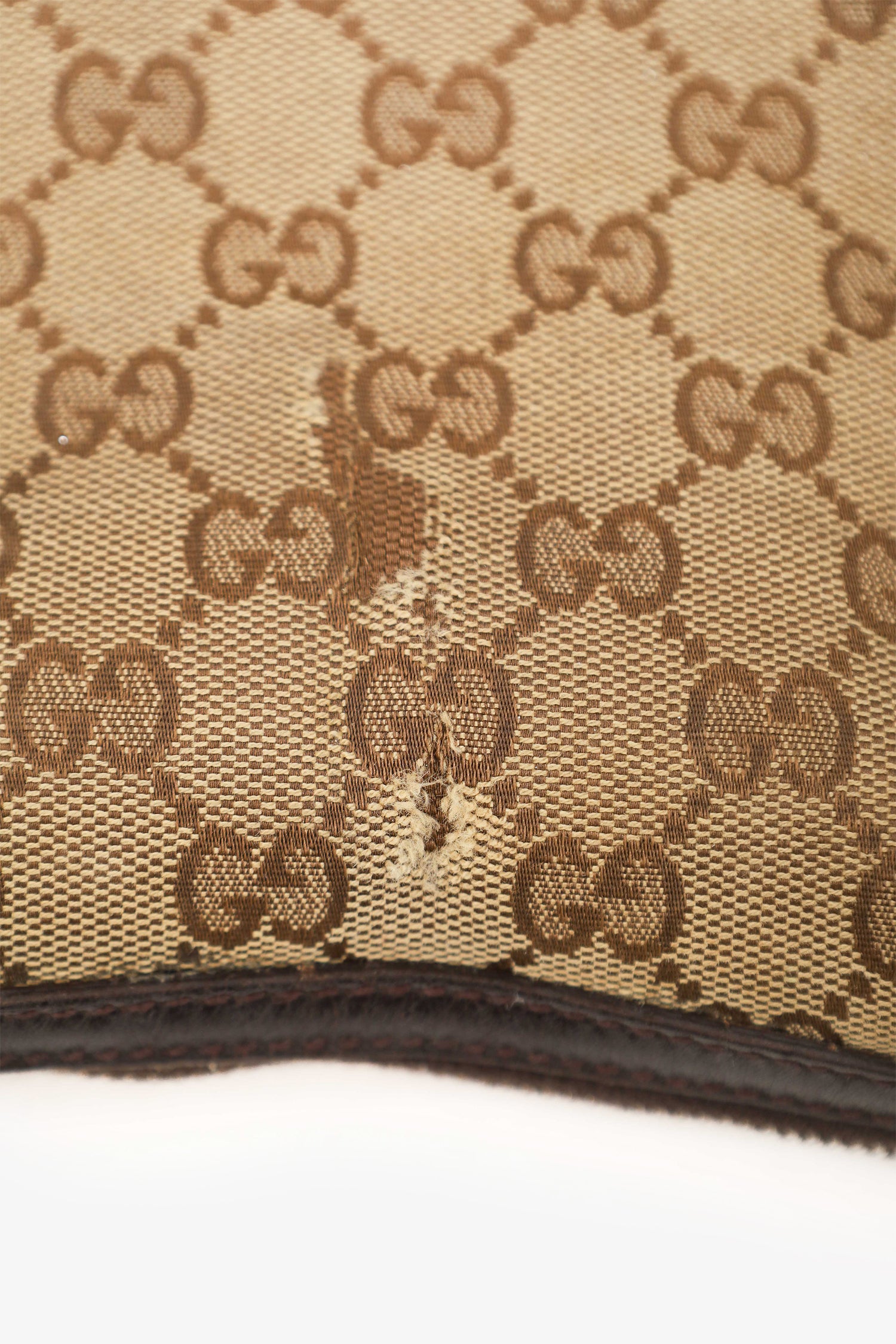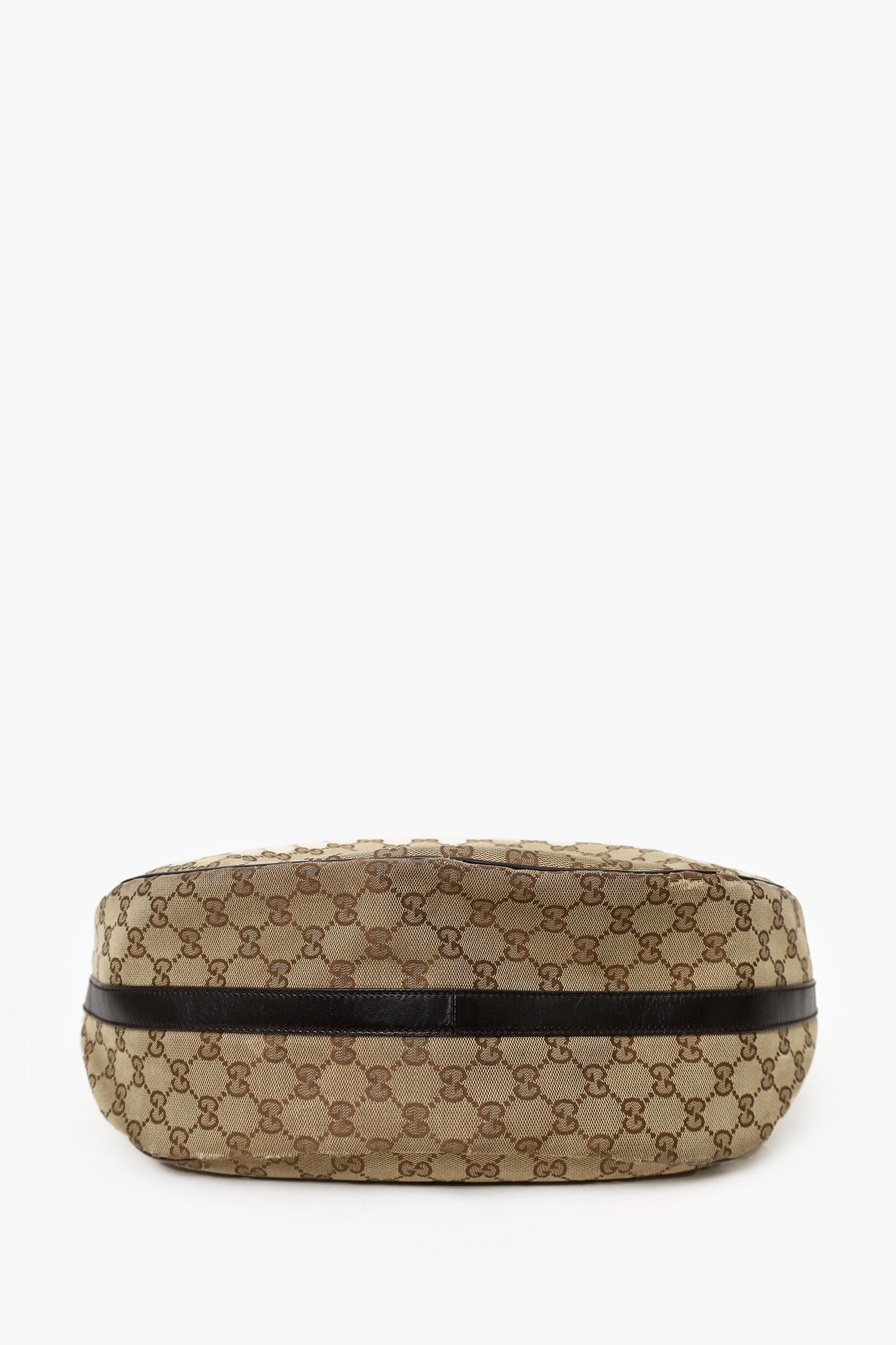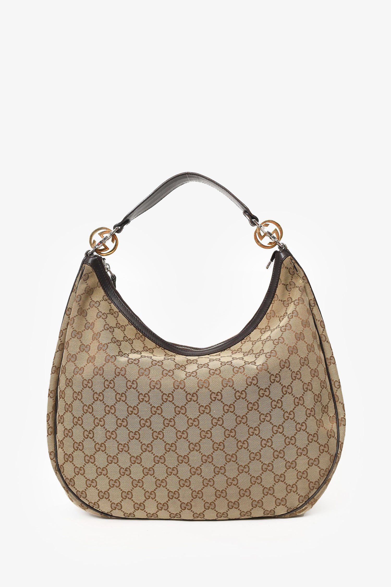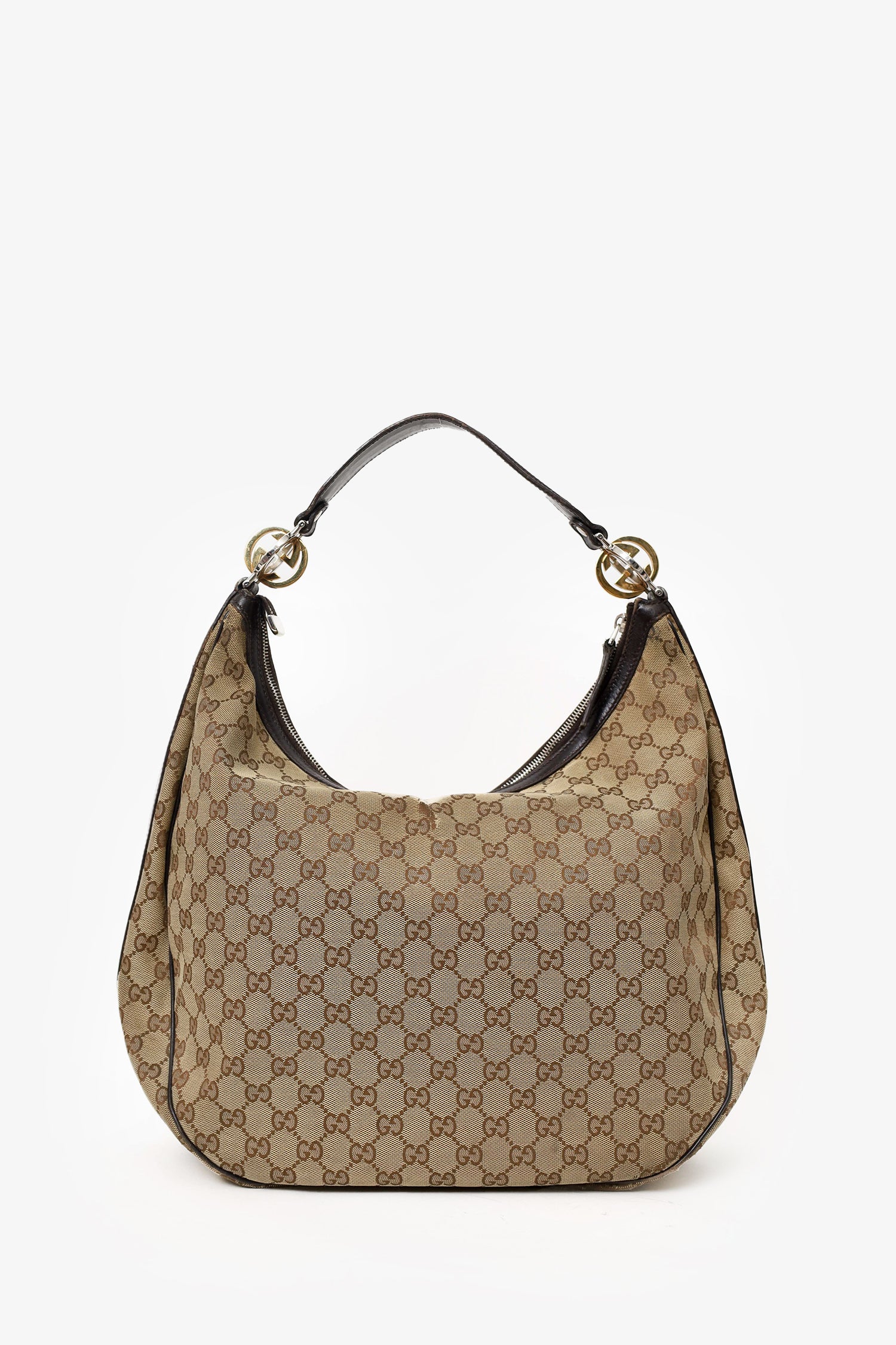 Refresh availabilityGucci Beige/Brown GG Canvas Medium GG Twins Hobo. Top zip closure. Shoulder strap. Fabric-lined interior. 3 interior pockets; 2 slip and 1 zip. Gold and silver-tone hardware. Tonal stitching.