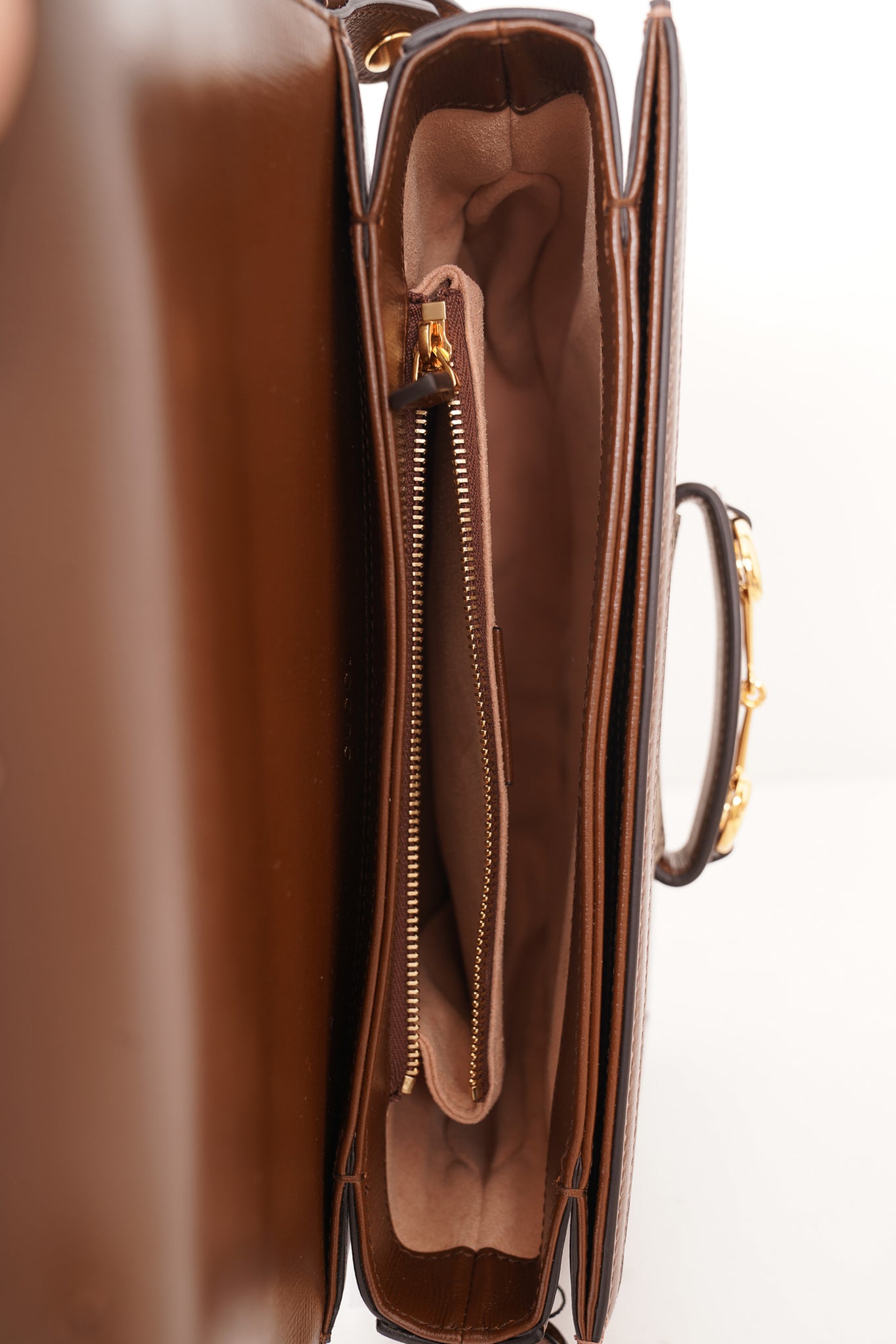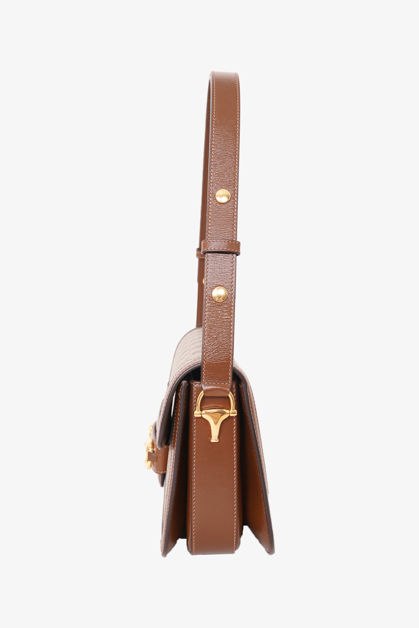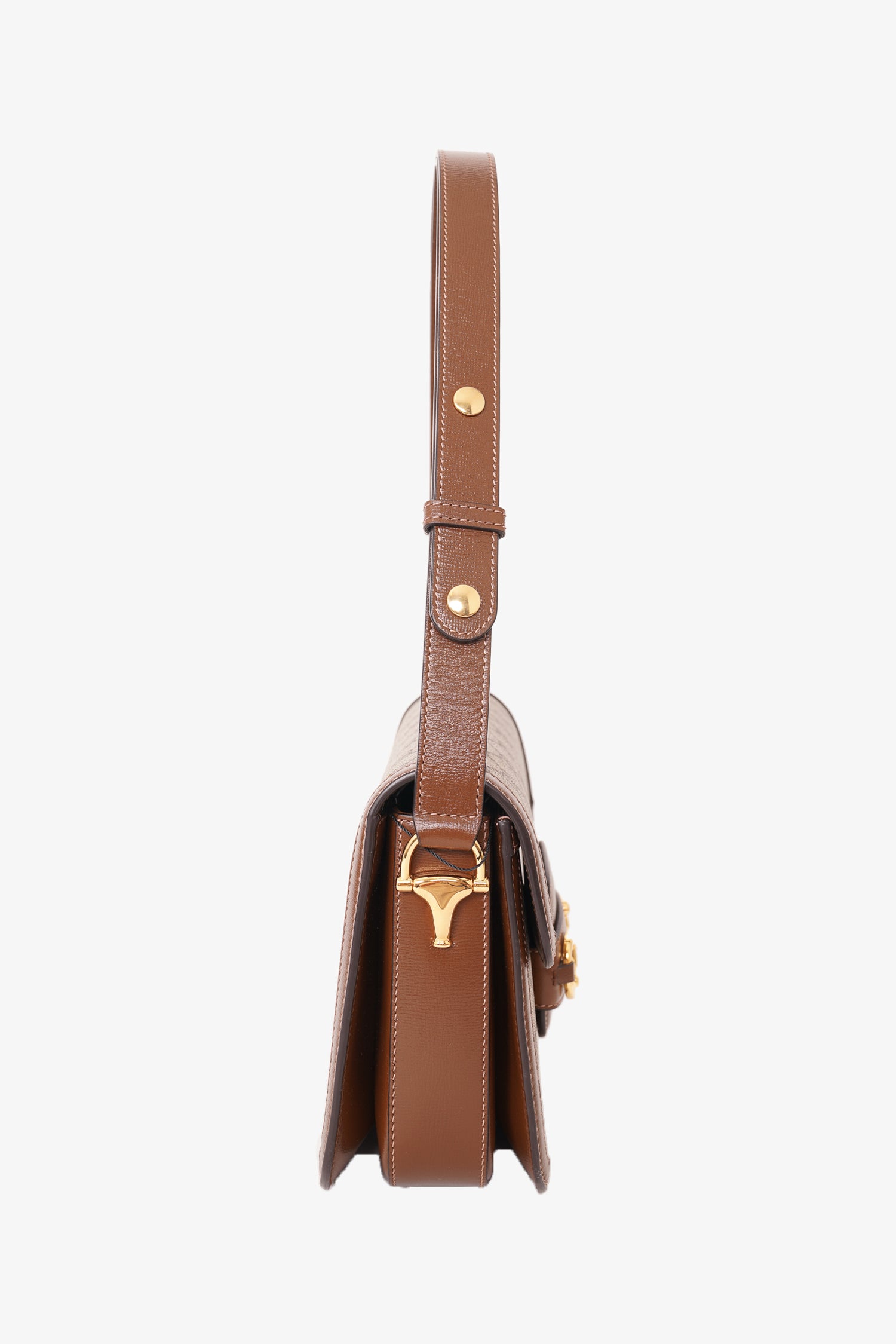 Refresh availabilityGucci Beige/Brown Monogram 'Gucci 1955' Horsebit Shoulder Bag. Adjustable top handle. Front flap with slide closure. Suede beige interior lining. 3 interior compartments. 2 interior pockets; zip-up and open. Gold-toned hardware. Tonal stitching.