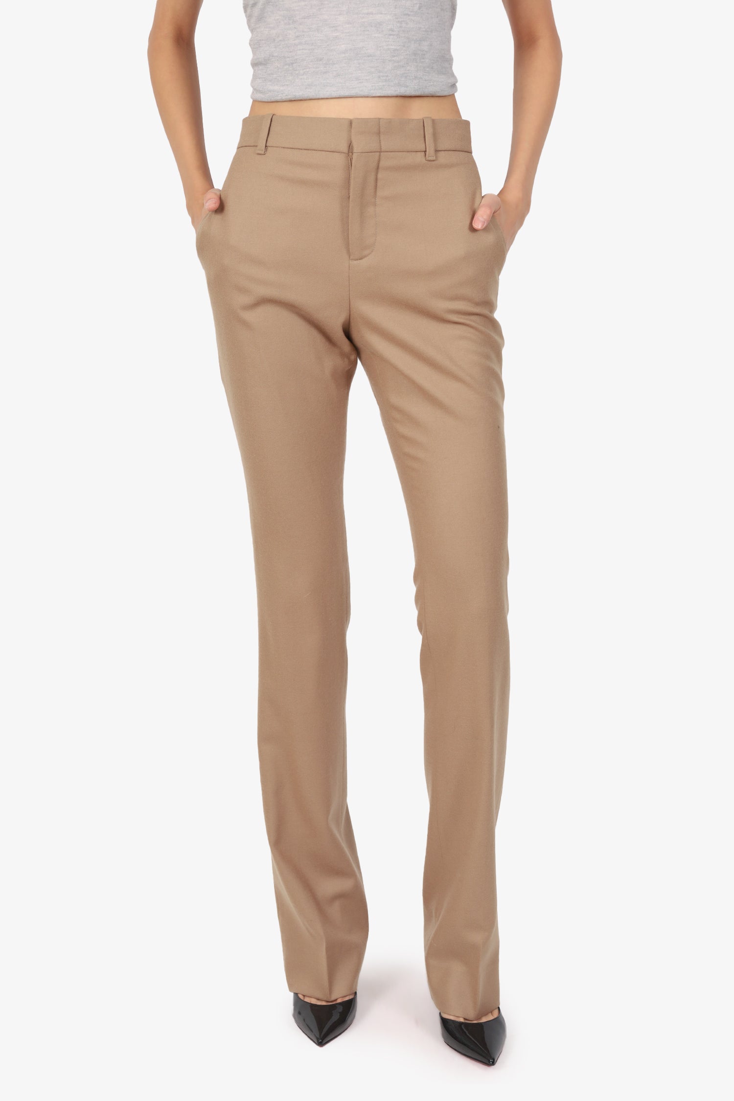 Refresh availabilityGucci Beige Wool/Cashmere Straight Leg Trousers. Slip on. Front zip with button-up closure. Waistband belt-loops. 4 exterior pockets; 2 front slip, and 2 rear with button-up closure. Silver-tone hardware. Tonal stitching.