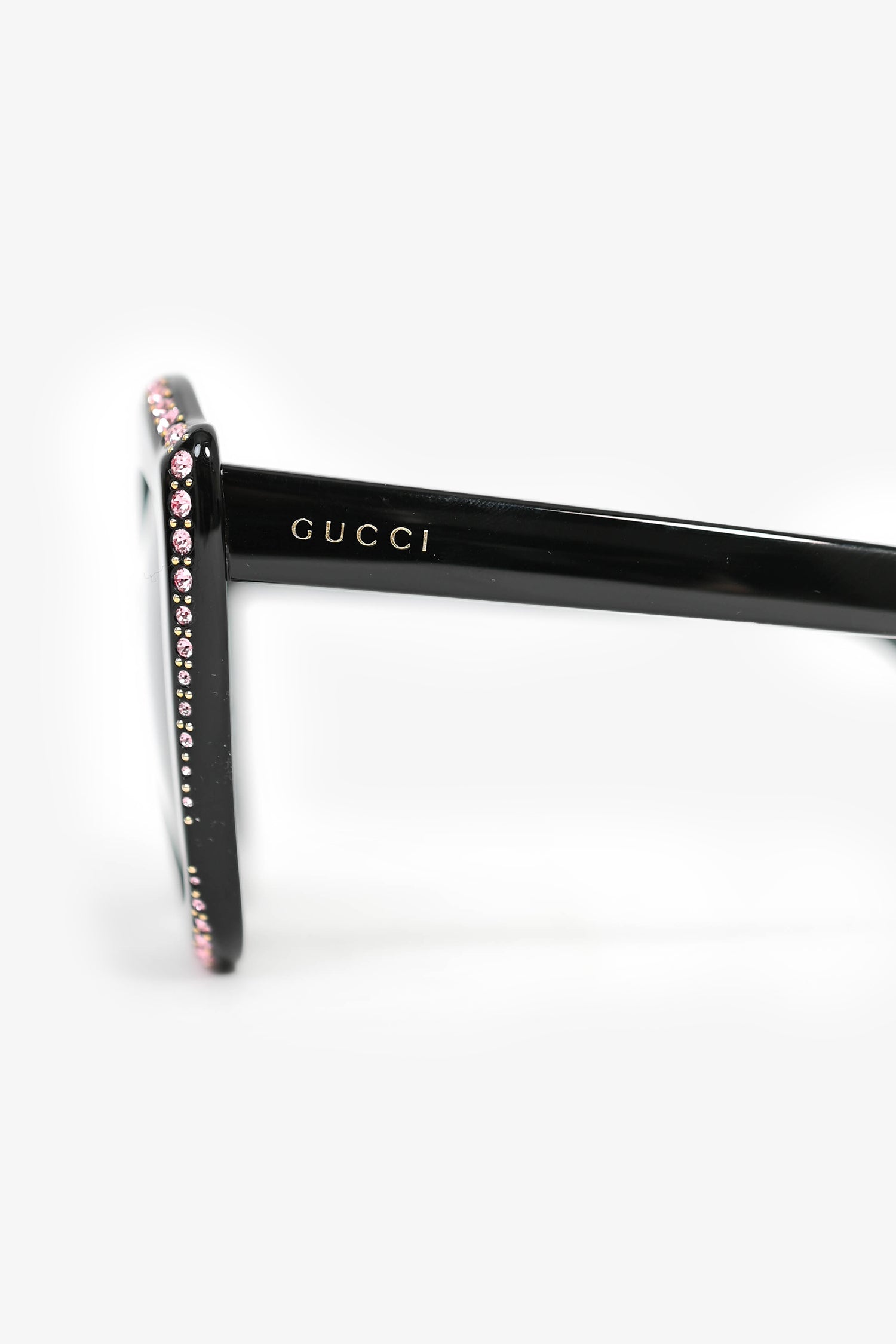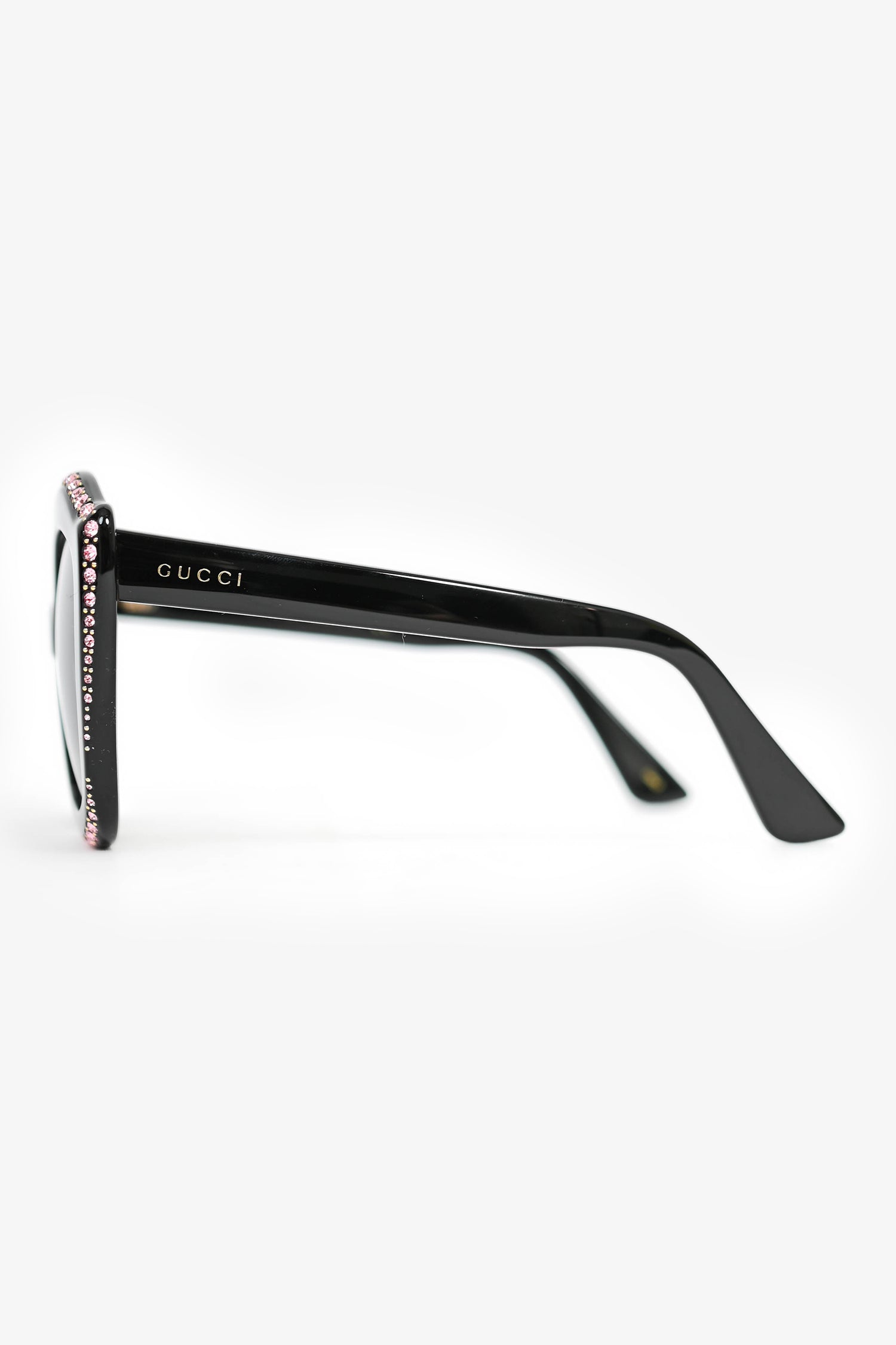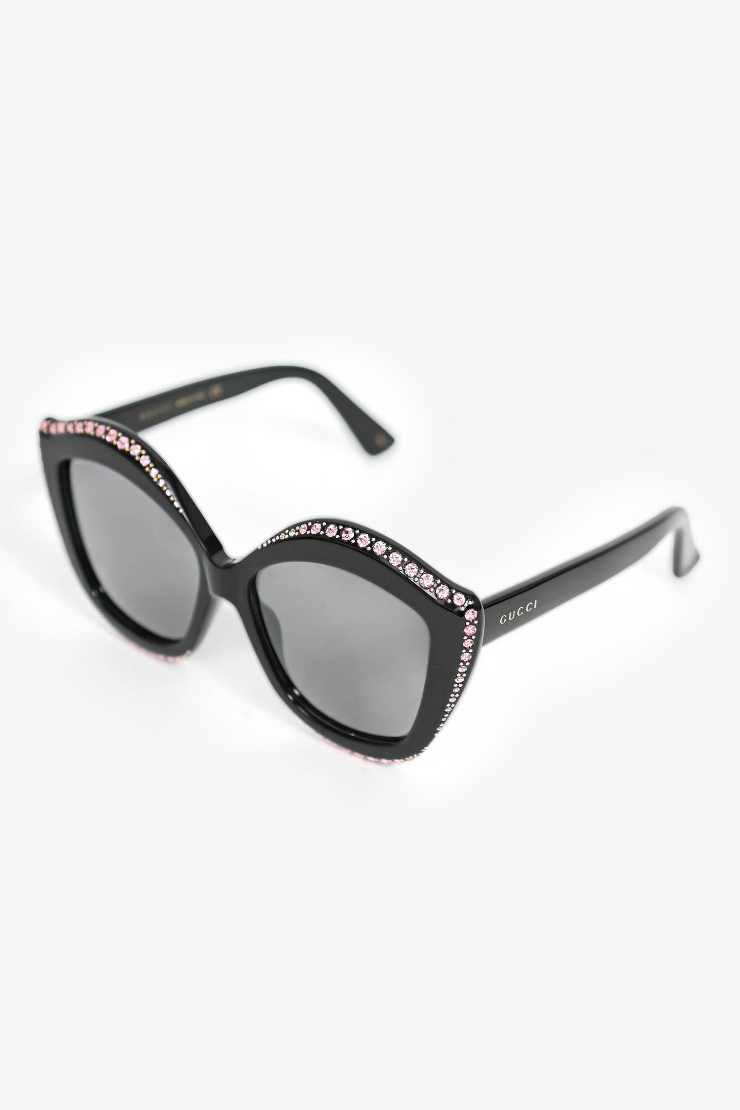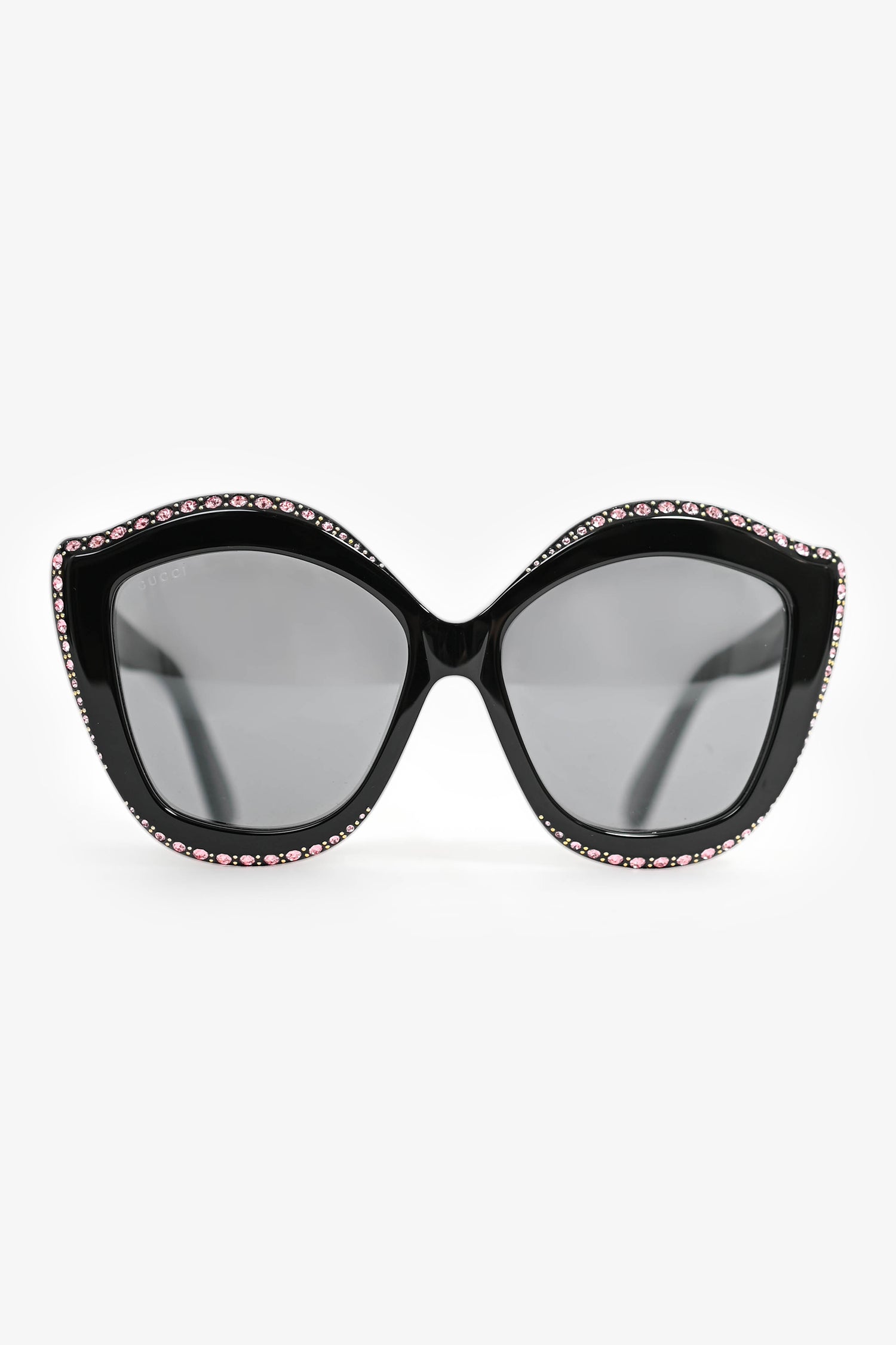 Refresh availabilityGucci Black Acetate/Pink Crystal Oversized Sunglasses. Built-in nose pads. Gold-tone hardware.