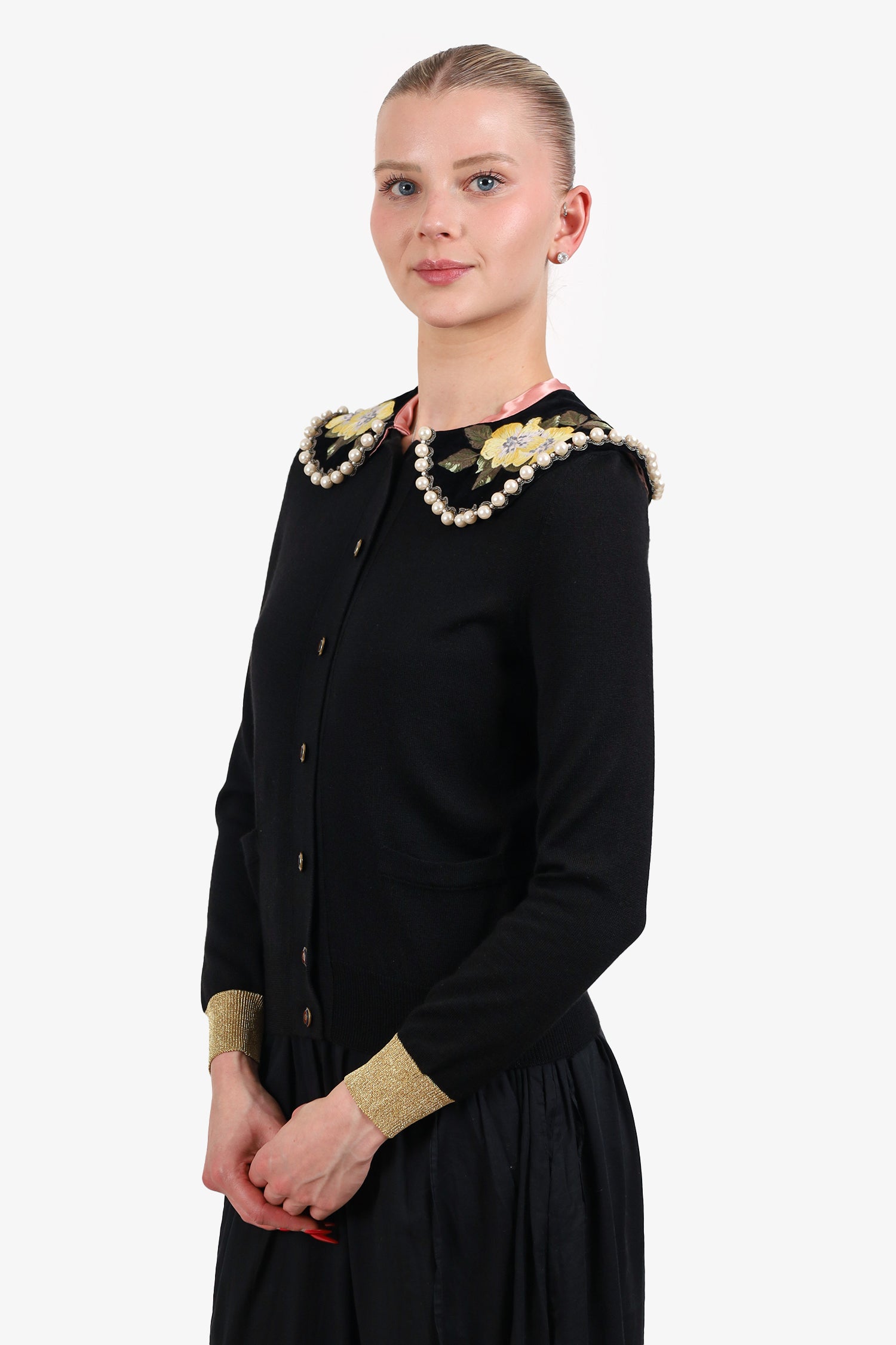 Refresh availabilityGucci Black Floral Embroidery Pearl Collar Cardigan. Pull-on. Round neckline. Removable collar with snap-button closure. 2 front exterior slip pockets. Gold-tone hardware. Tonal stitching.