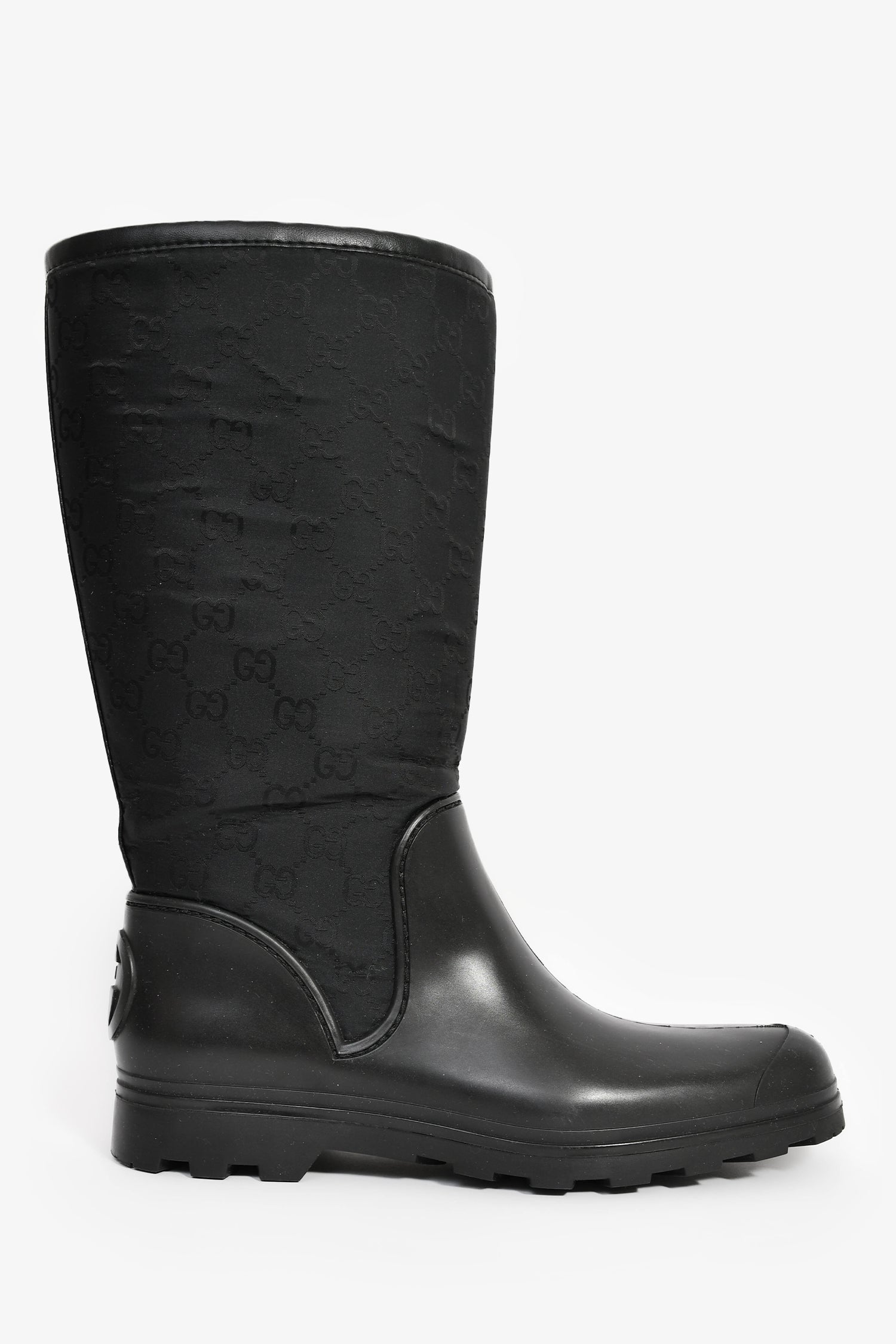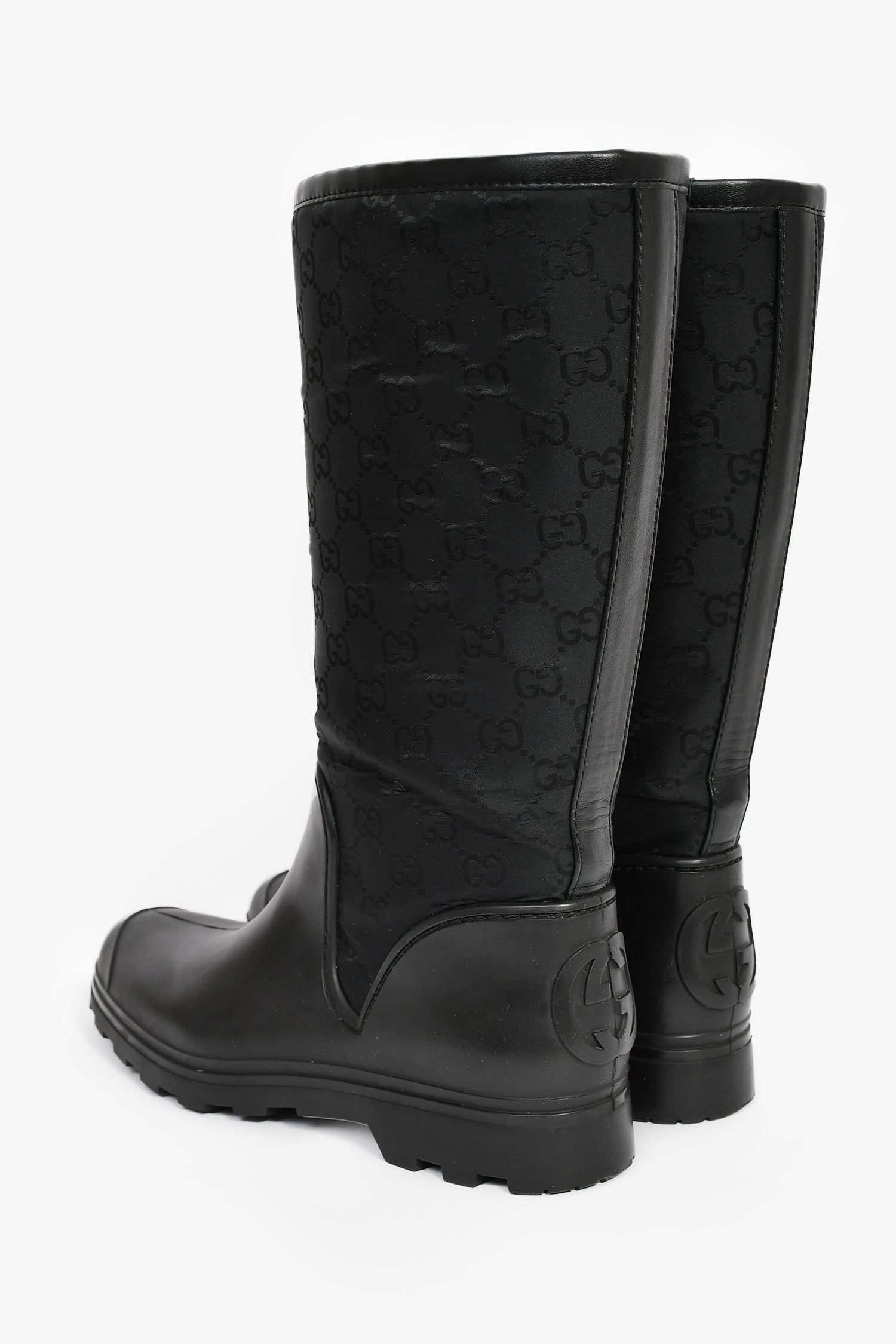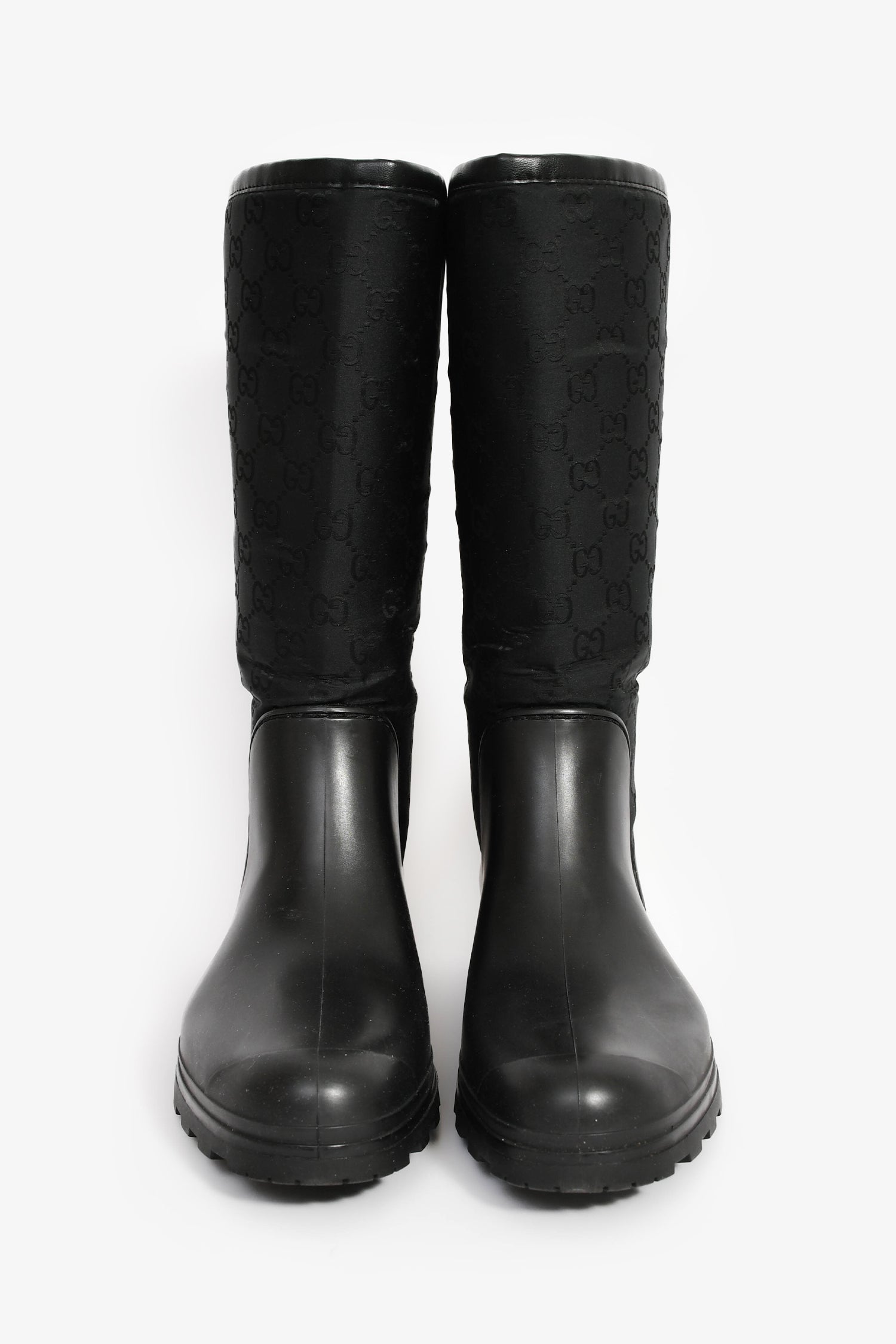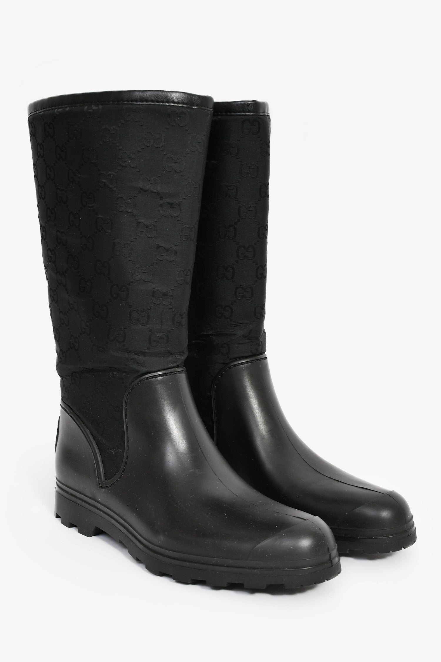 Refresh availabilityGucci Black GG Supreme Rubber/Canvas Rain Boots. Pull-on. Round toe. Tonal stitching.