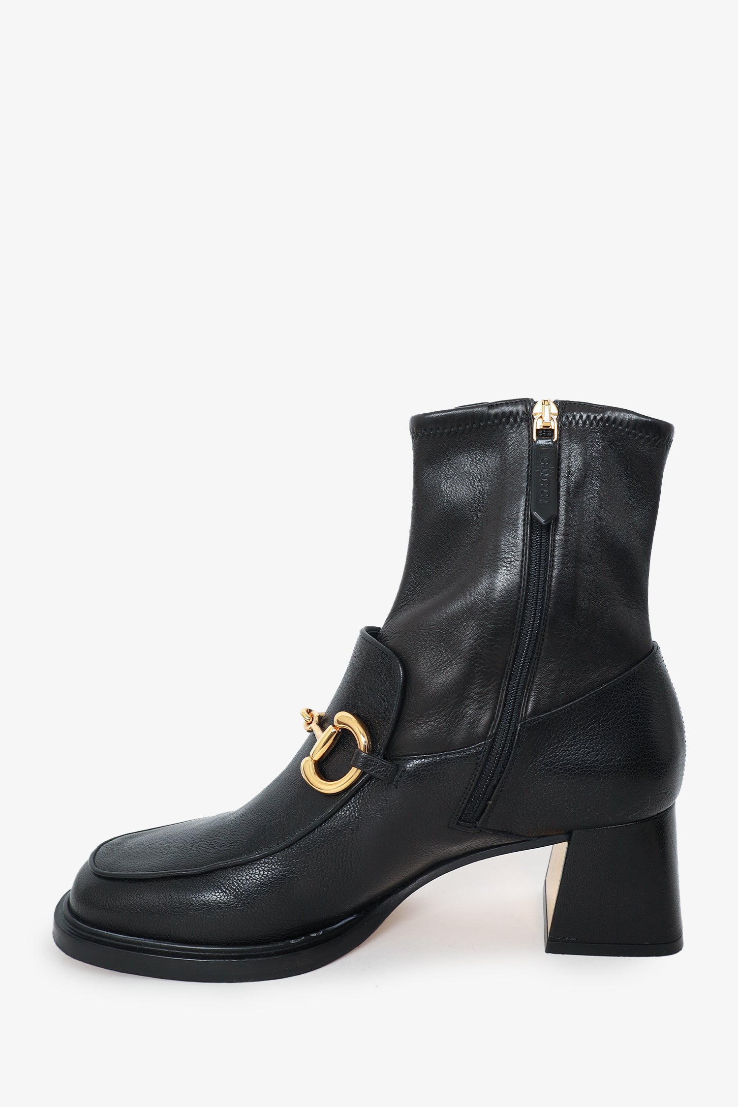 Refresh availabilityGucci Black Leather 1955 Horsebit Ankle Boots. Zip closure. Block heel. Round toe. Gold-toned hardware. Tonal stitching.
