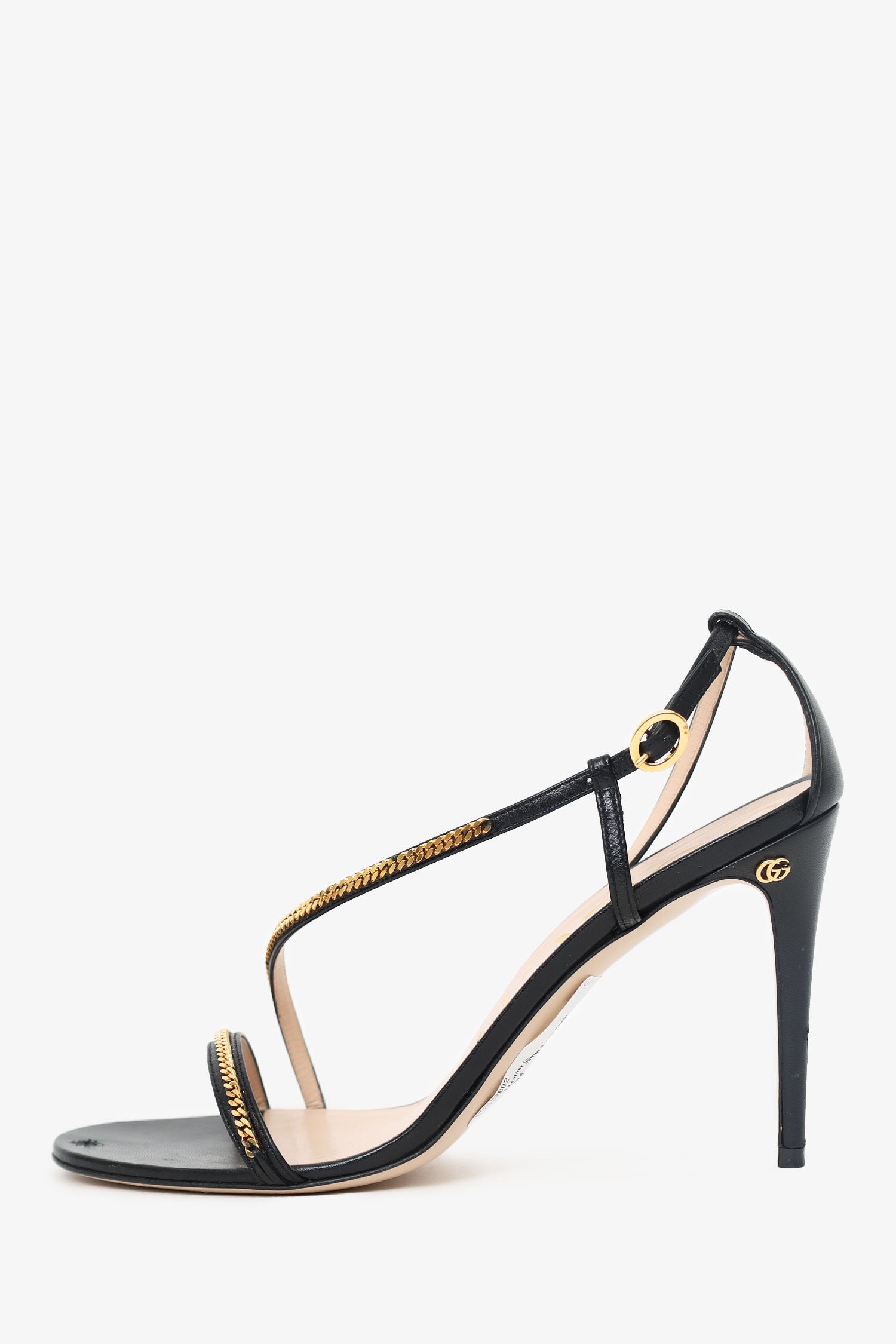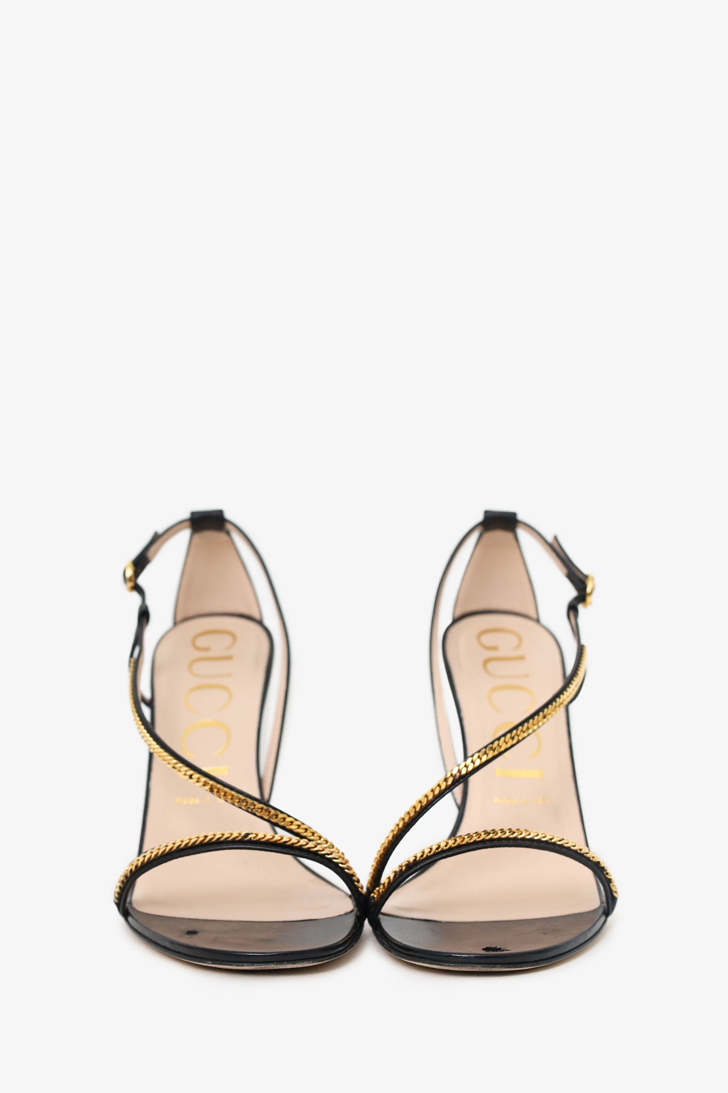 Refresh availabilityGucci Black Leather 95mm Sylvie Chain Sandals. Slip-on. Pointed-round open toe. Adjustable slingback ankle strap with buckle closure. Gold-tone hardware. Tonal stitching.