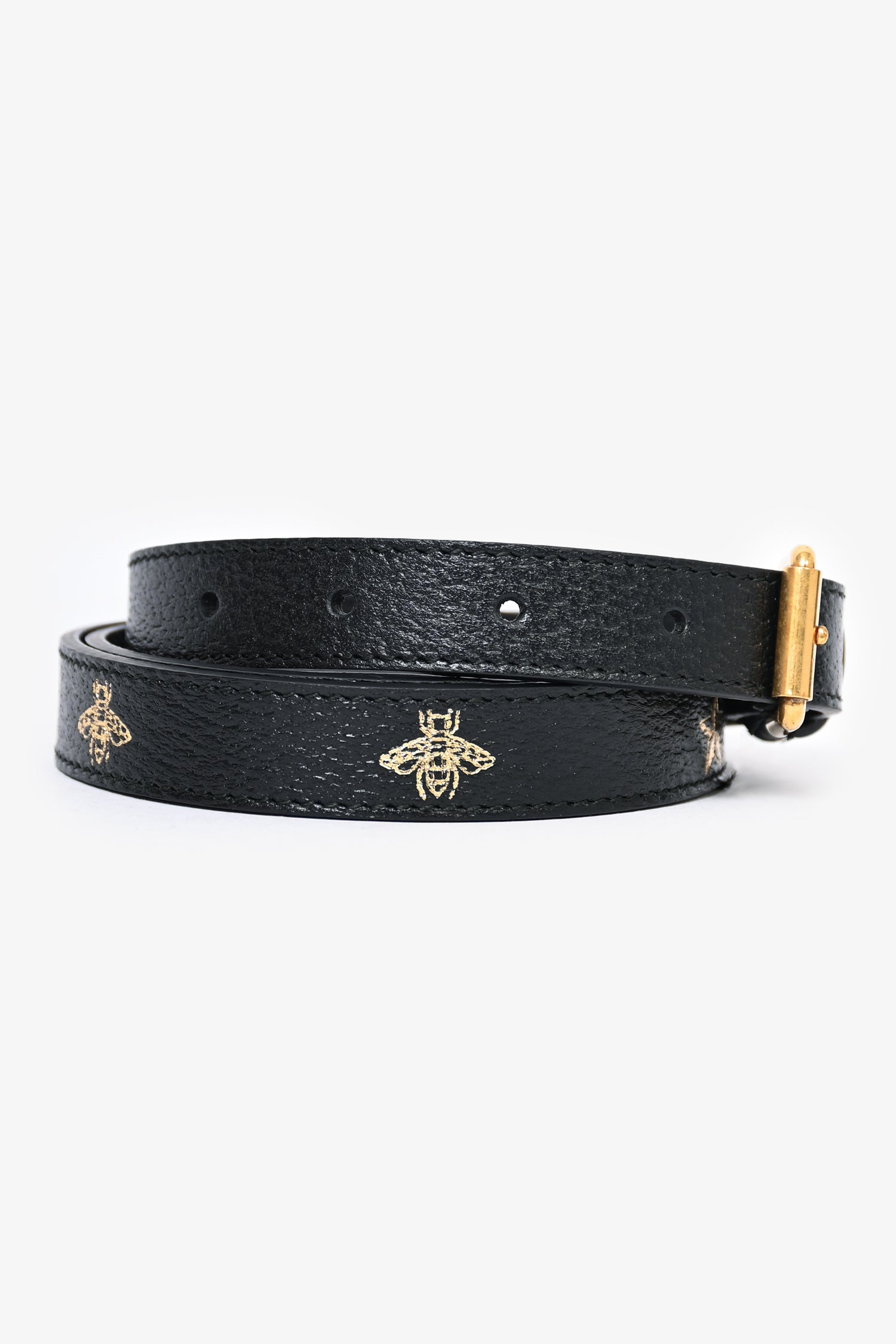 Refresh availabilityGucci Black Leather Bee Belt. Gold-tone hardware. Perforated holes. Leather trimming.