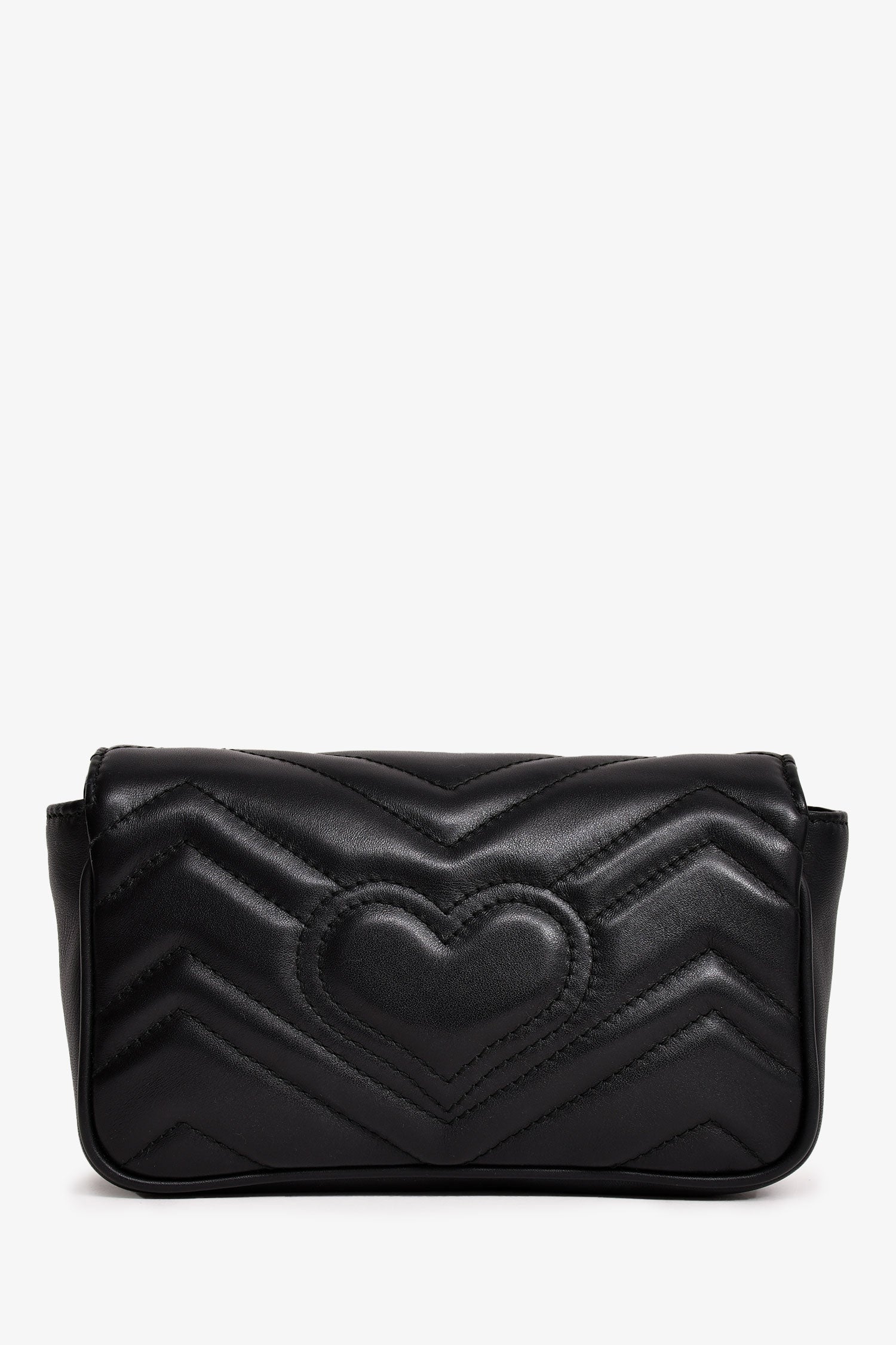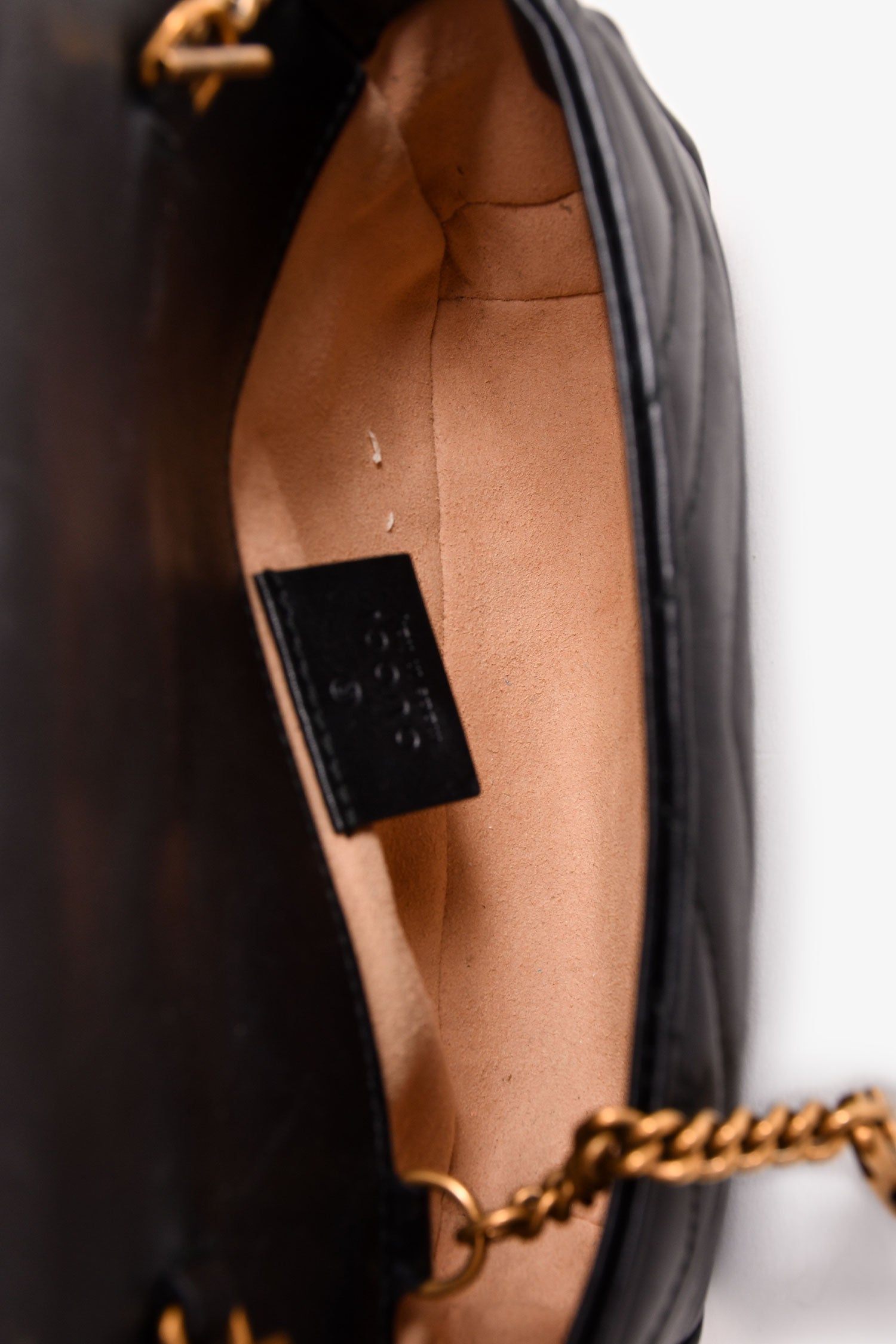 Refresh availabilityGucci Black Leather Chevron Quilted GG Marmont Super Mini Bag. Front fold-over flap with snap-button closure. Peach suede interior lining. Open interior. Gold-tone hardware. Chain strap. Interior key hook.