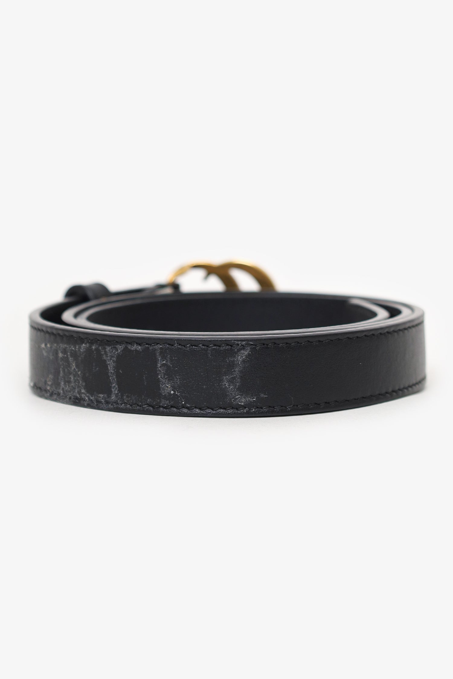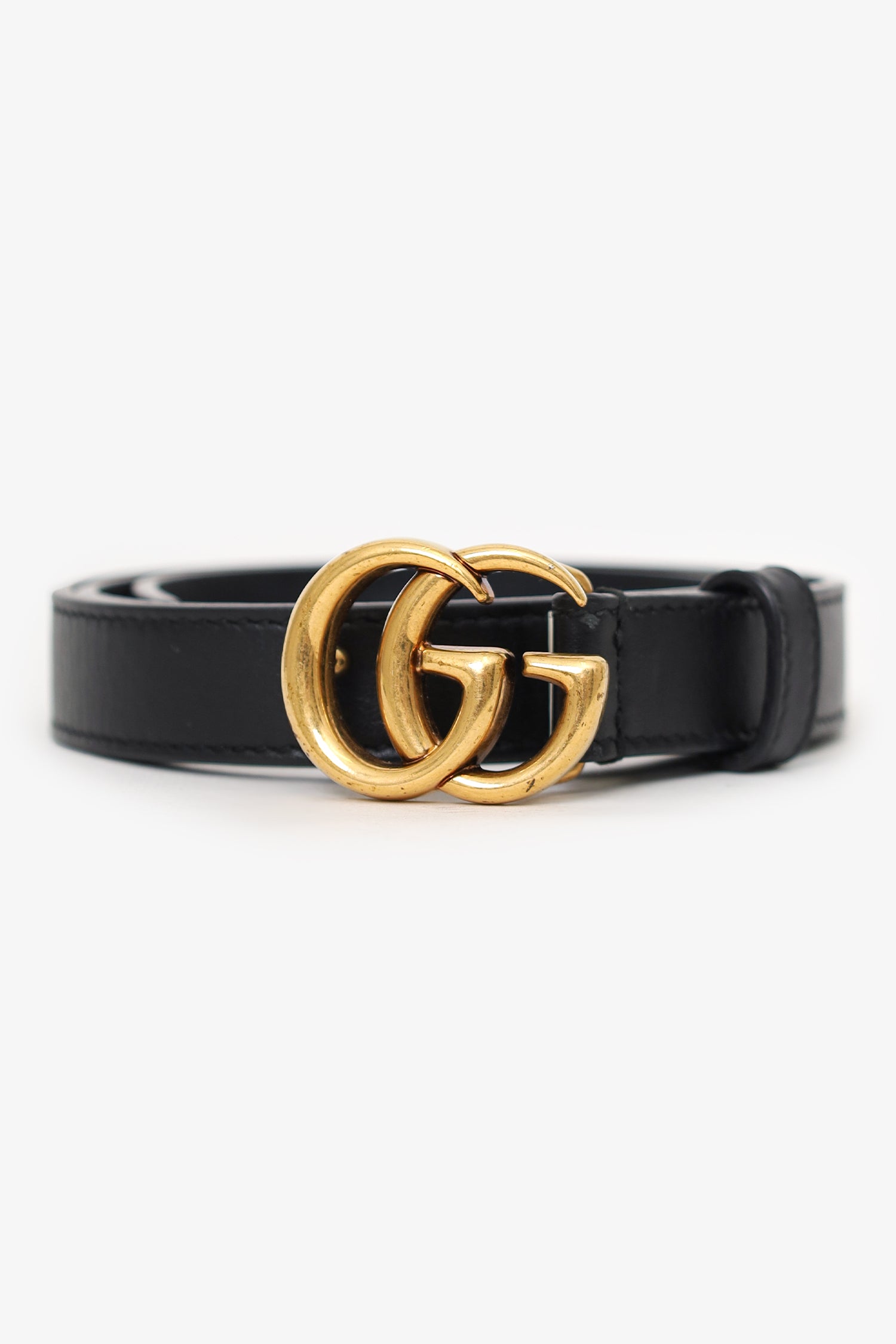 Refresh availabilityGucci Black Leather 'GG' Marmont Thin Belt. Adjustable push-pin buckle closure. Tonal stitching. Gold-tone hardware.