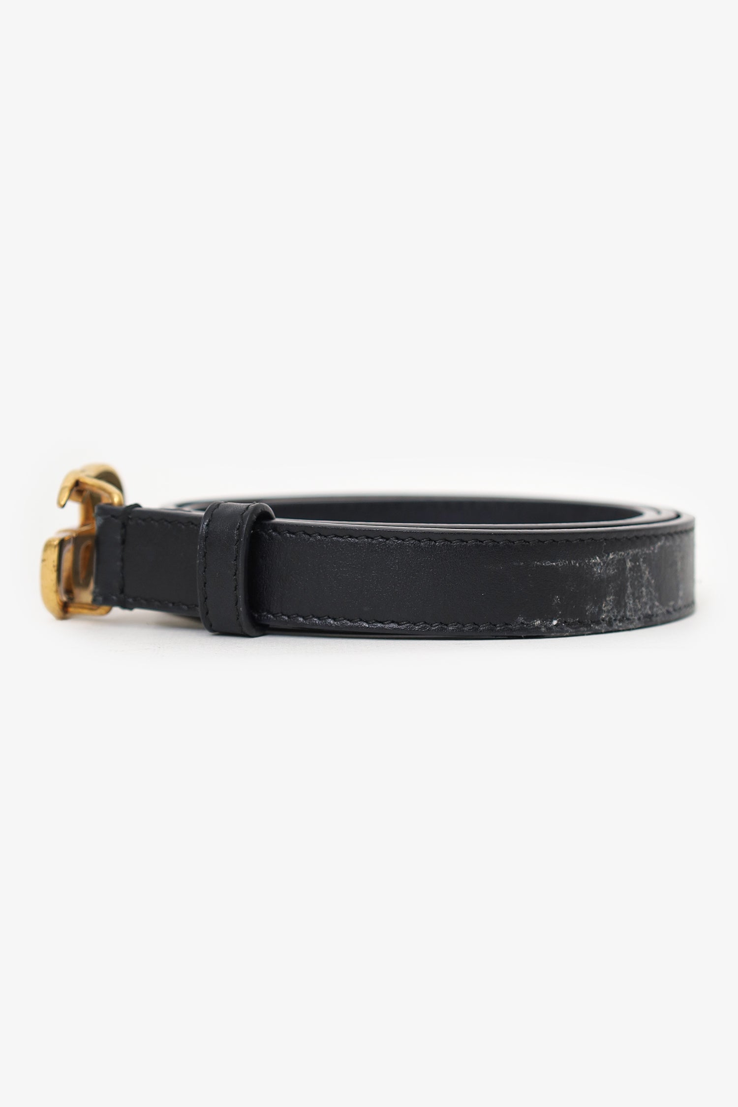 Condition: This item is in fair pre-loved condition. Visible creasing and wear to leather. Some warping to belt. Minor scratches to hardware.