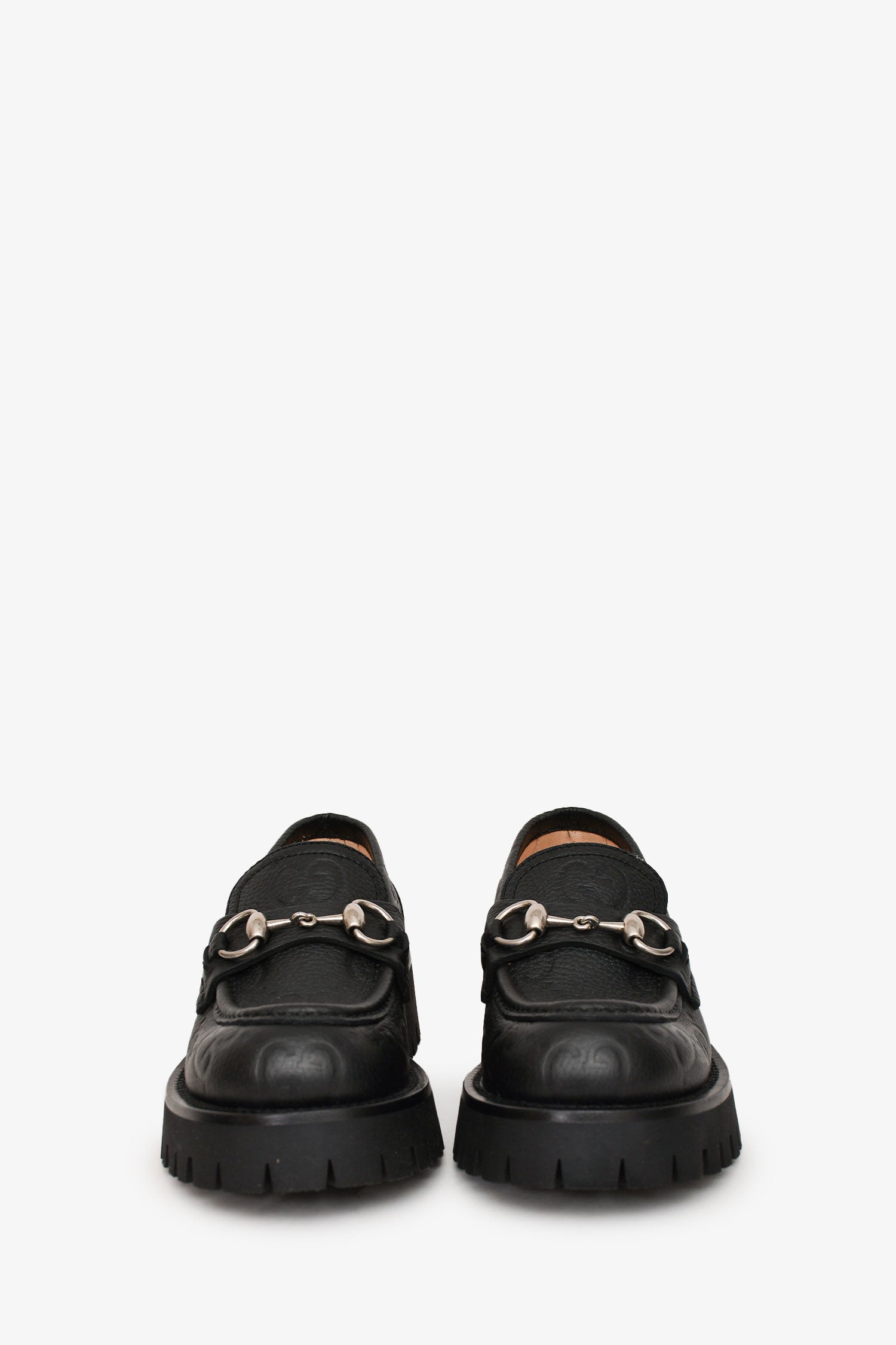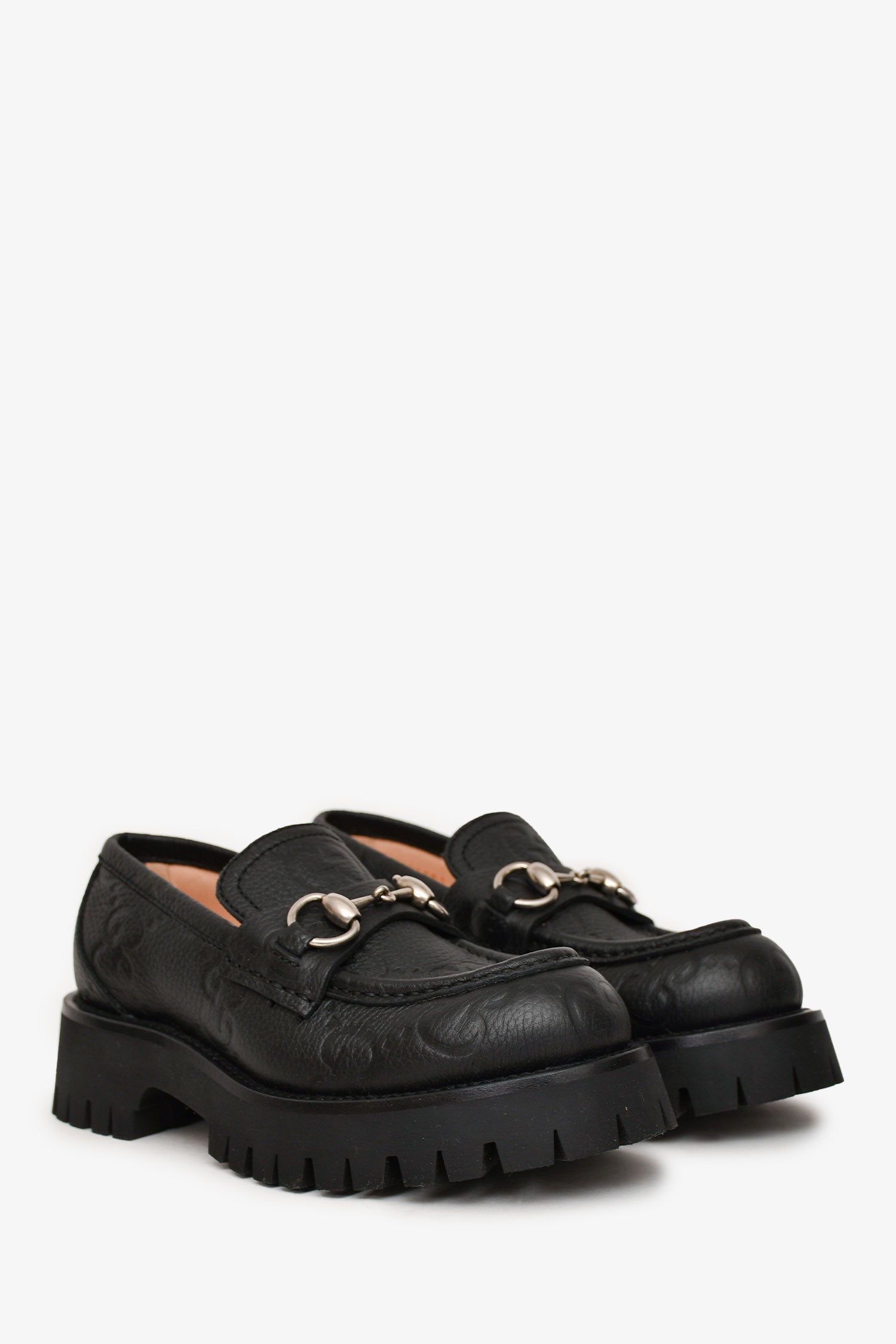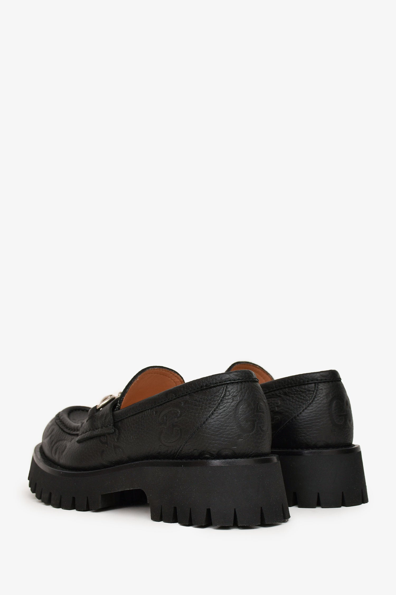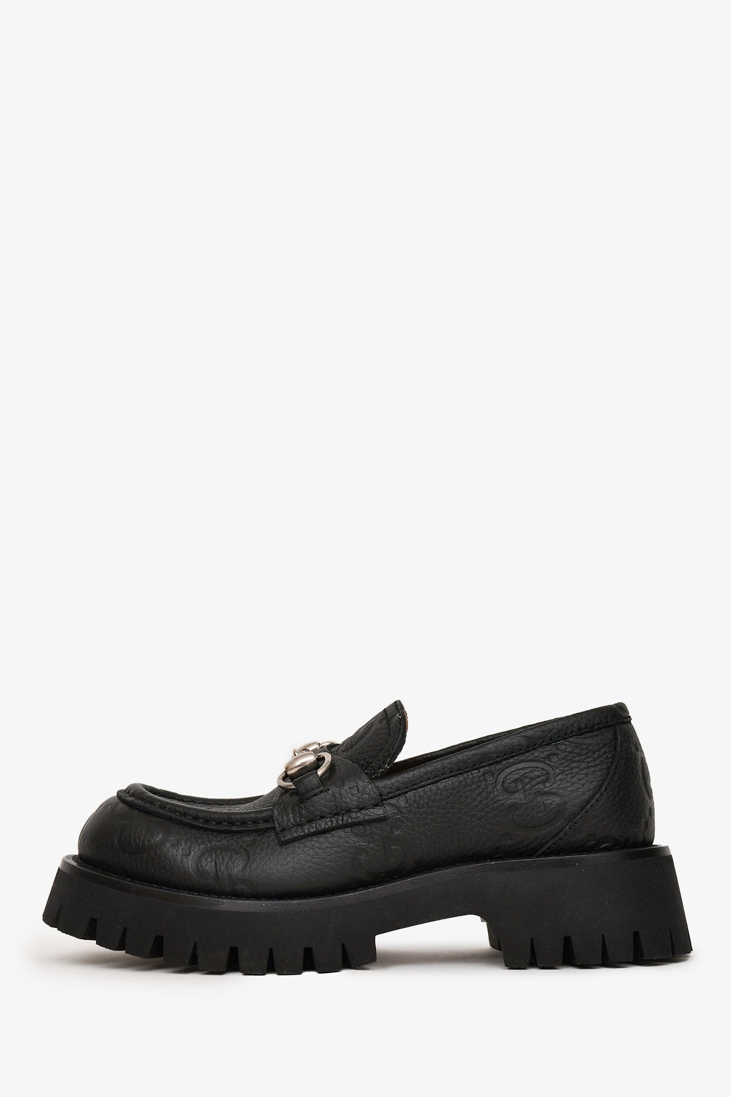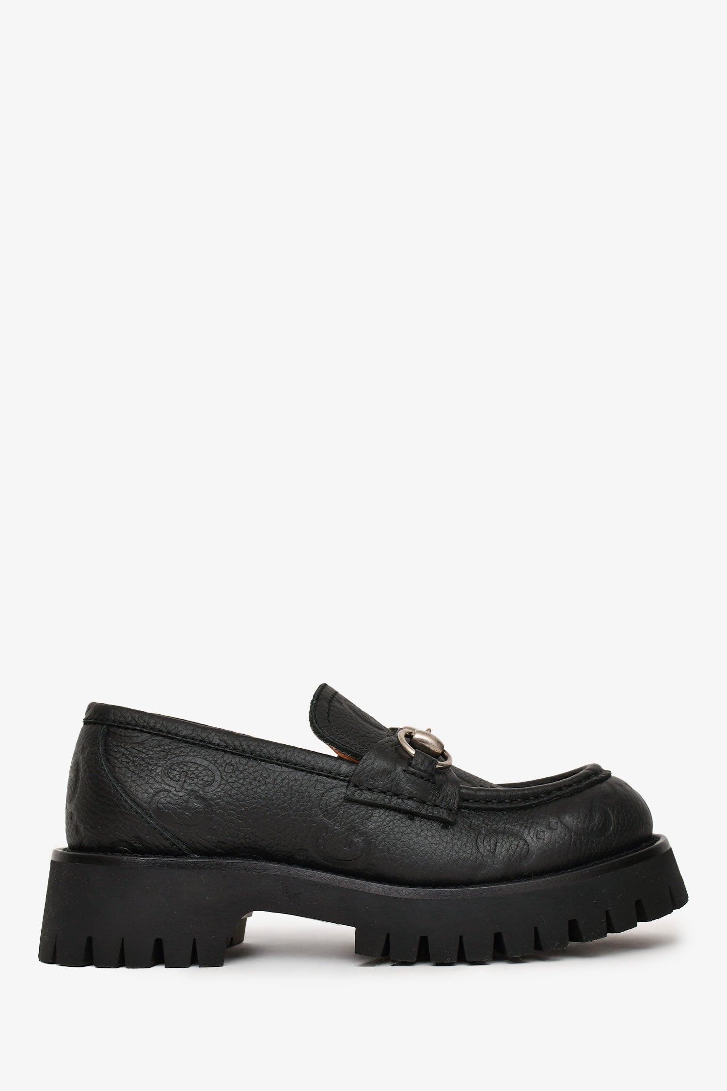 Refresh availabilityGucci Black Leather GG Supreme Platform Loafers. Almond toe. Slip-on style. GG Supreme monogram detail. Chunky platform sole. Tonal stitching. Comes with box and dust bags.