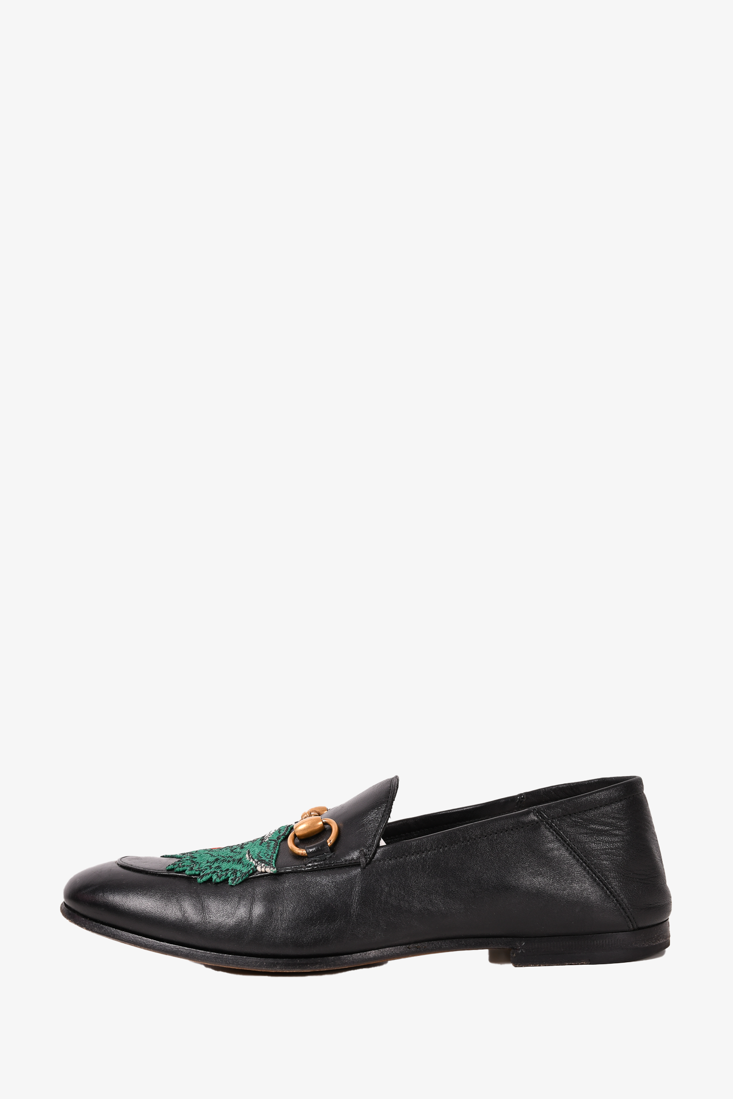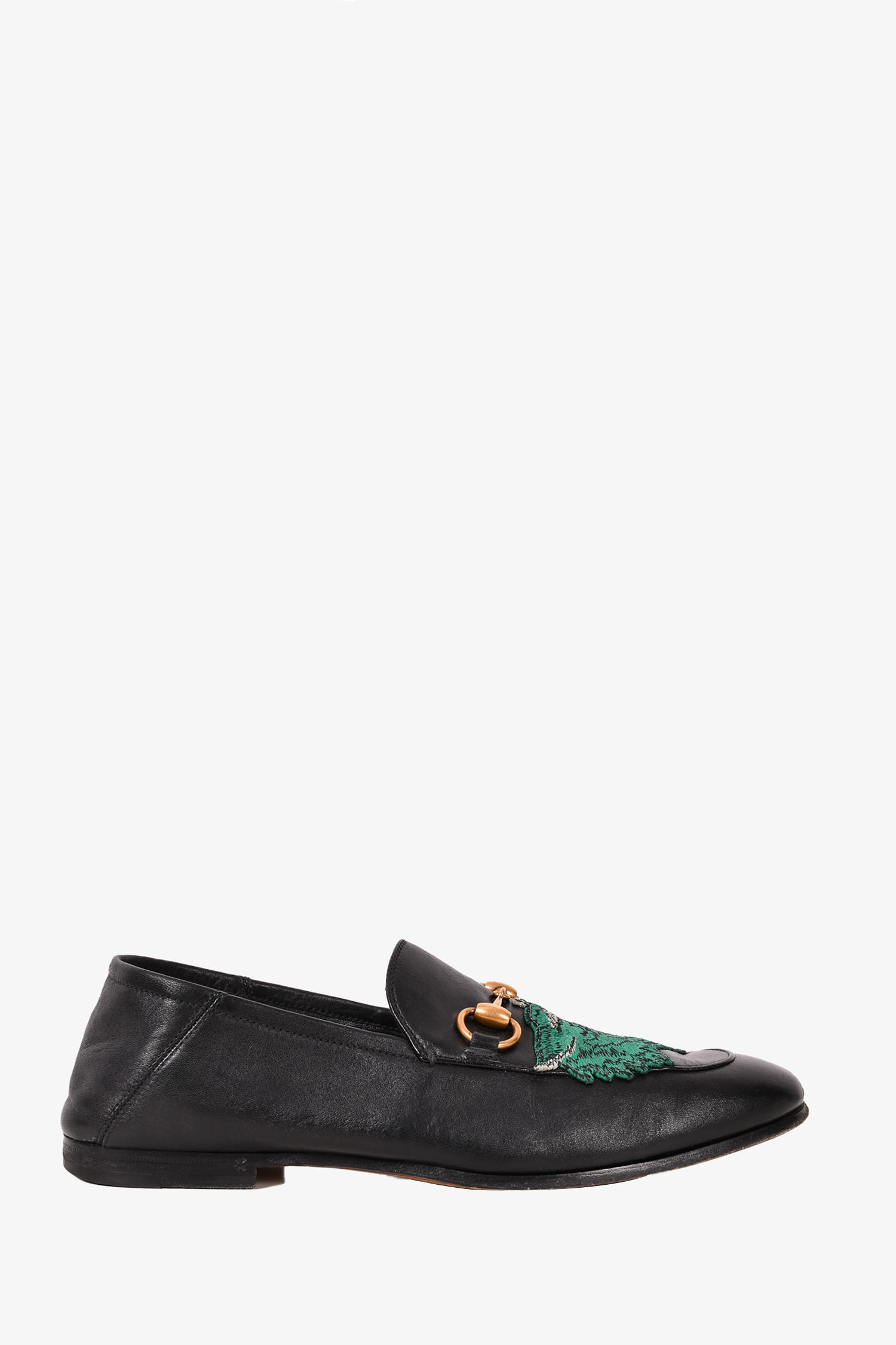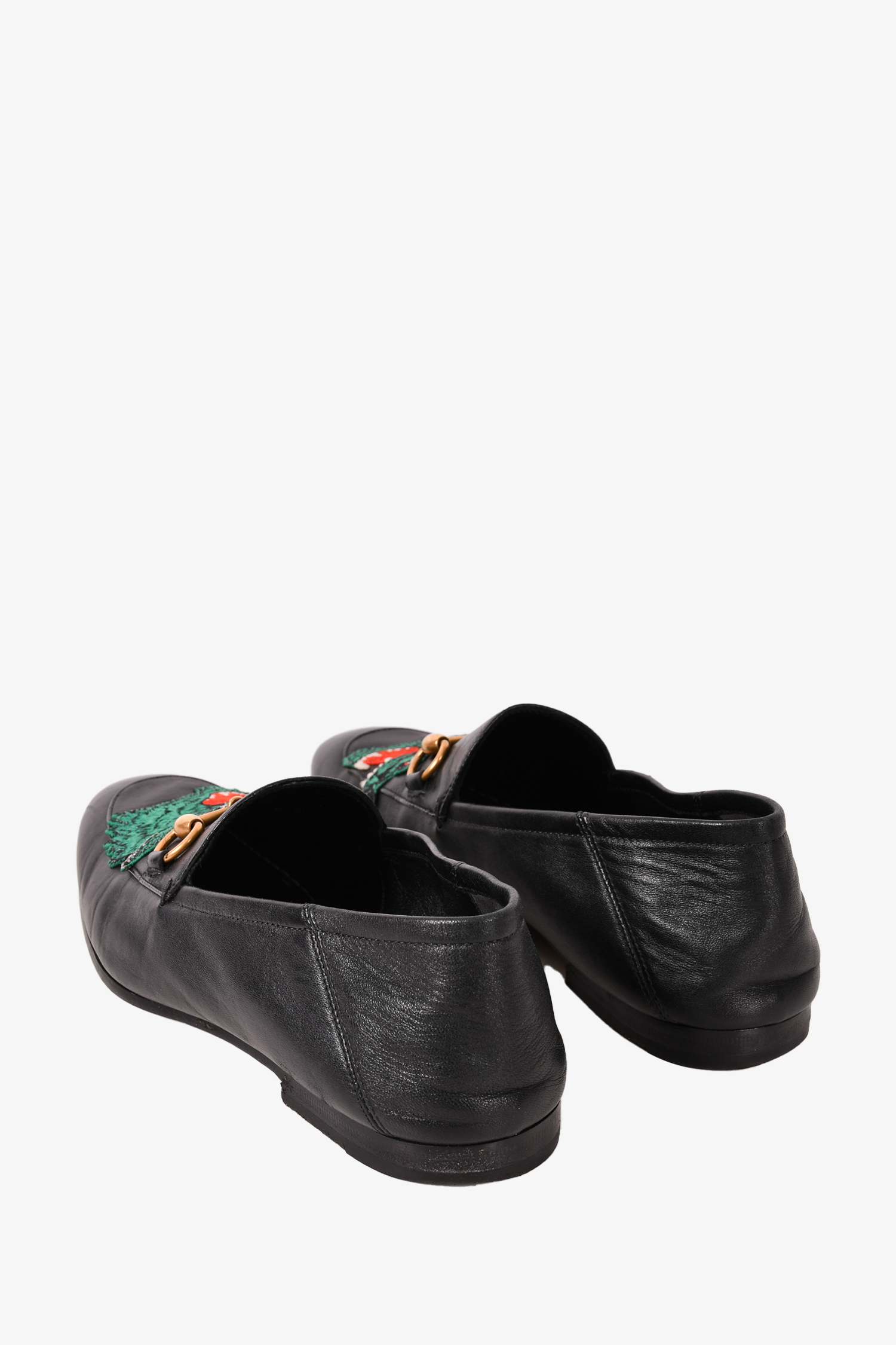 Refresh availabilityGucci Black Leather Green Animal Embroidered Horsebit Loafers. Slip-on. Round toe. Gold hardware. Tonal stitching