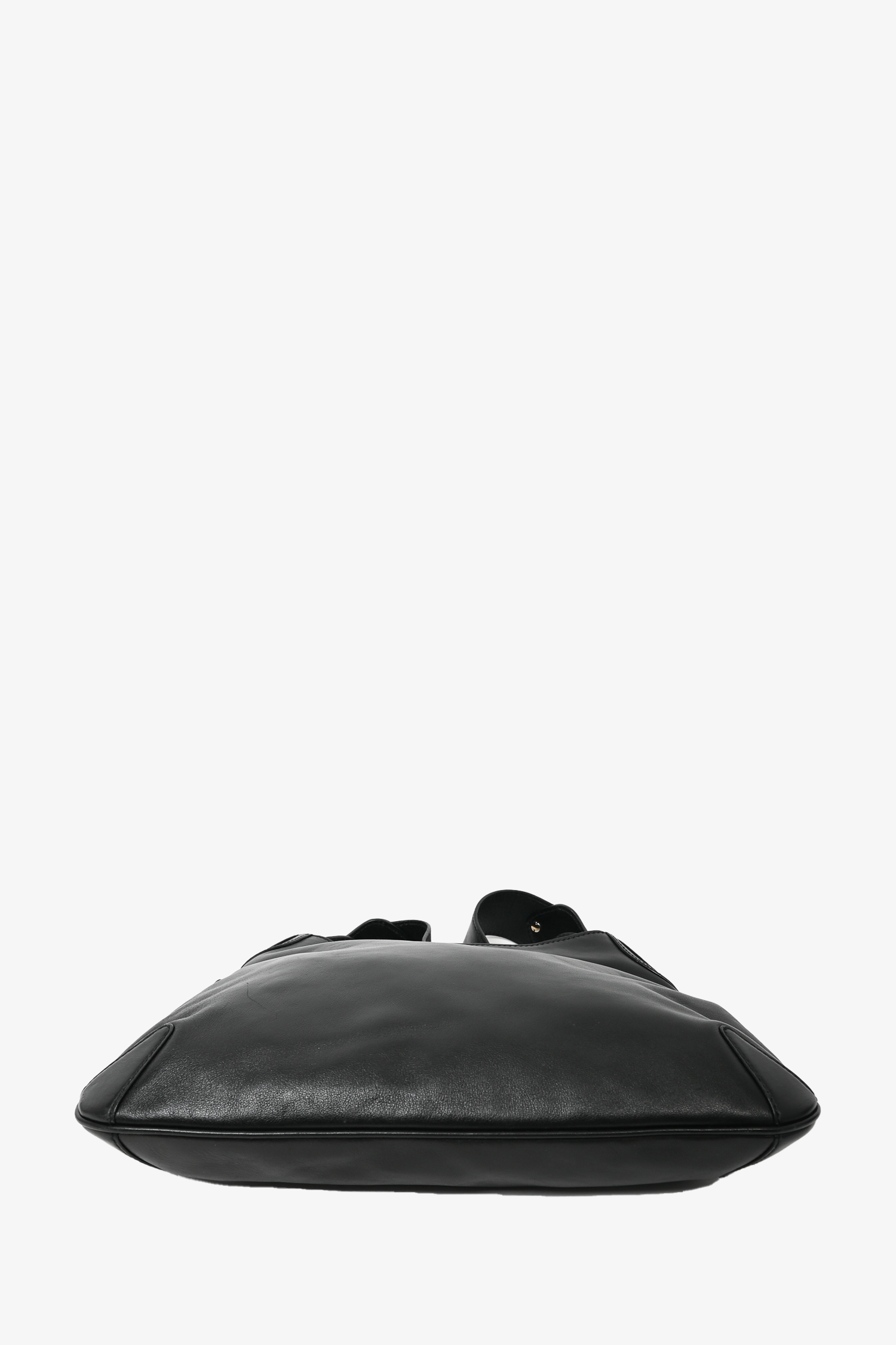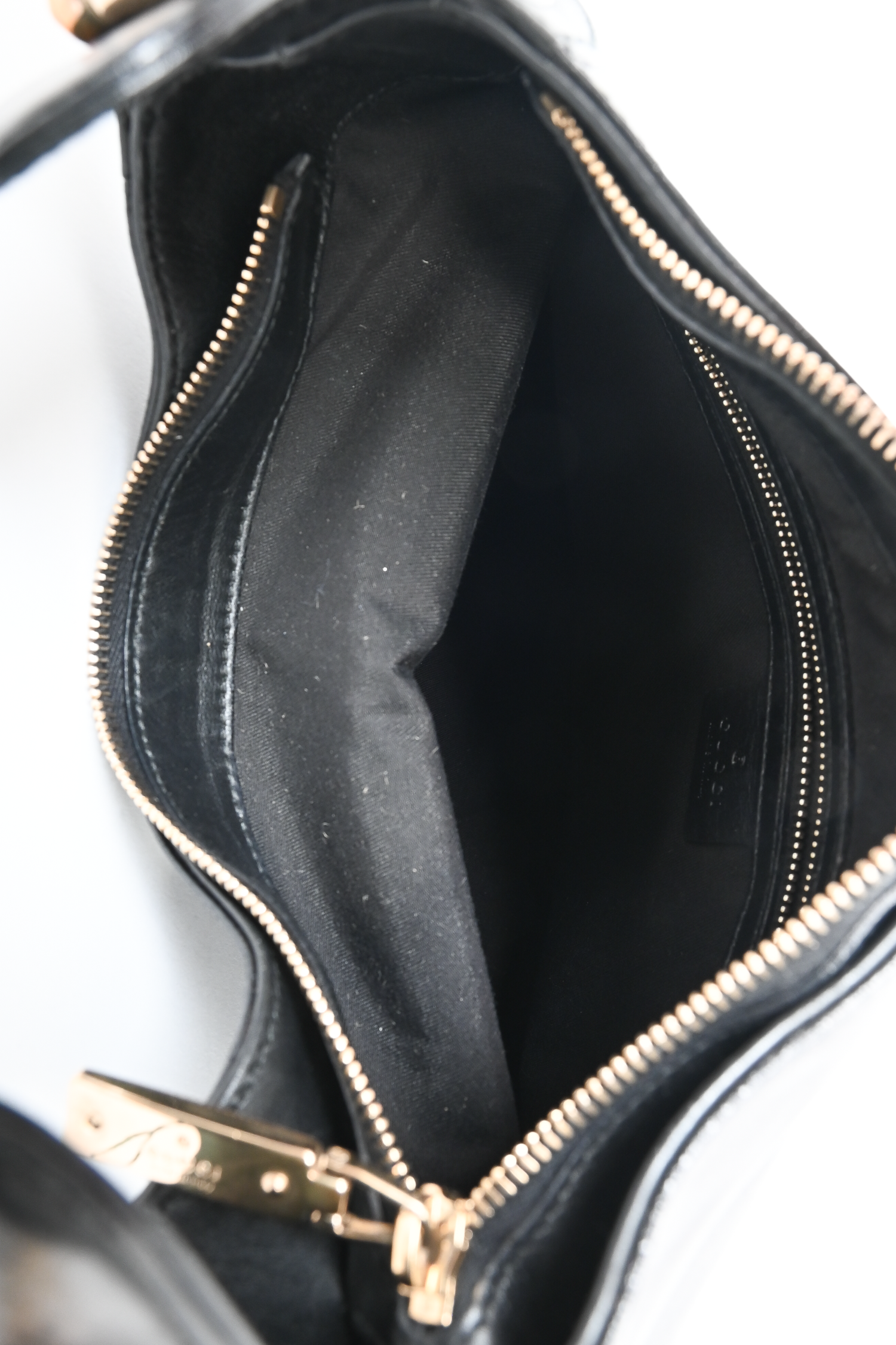 Refresh availabilityGucci Black Leather Horsebit Hobo Bag. Zip closure. Interior zip pocket. Gold-tone hardware. Tonal stitching.