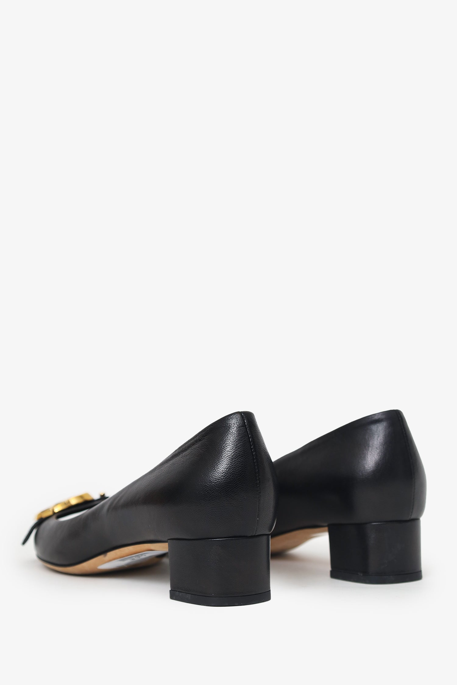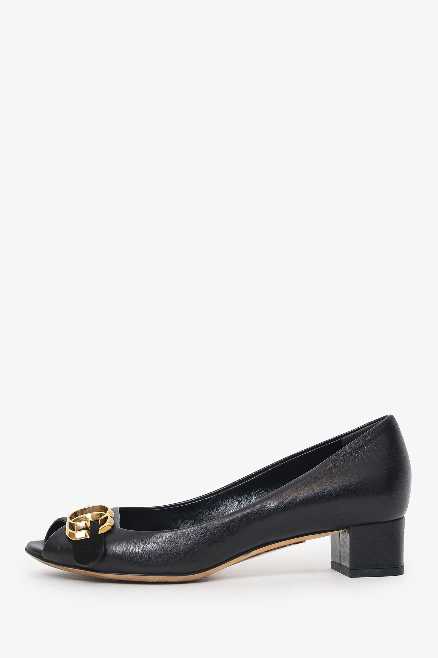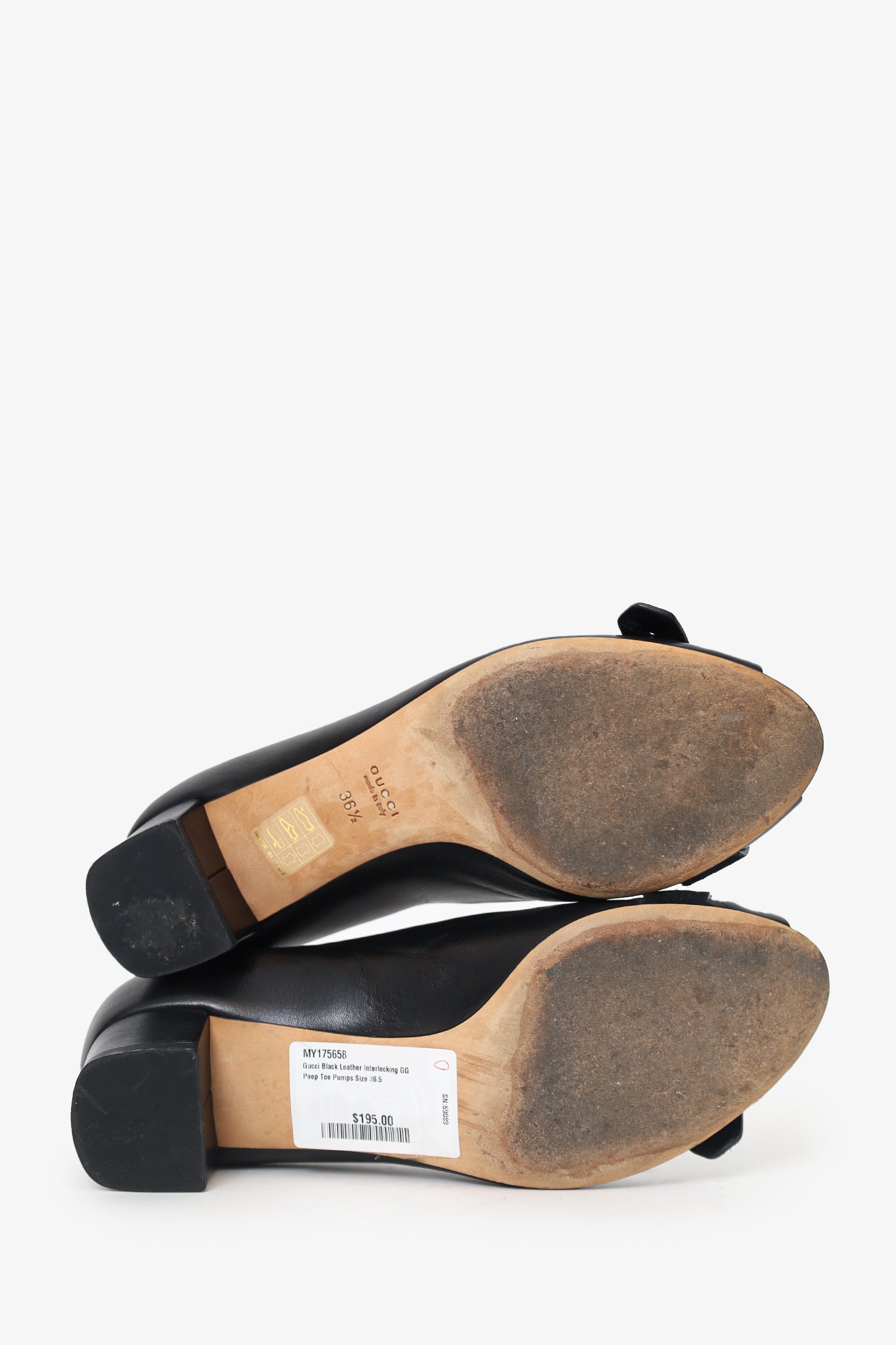 Refresh availabilityGucci Black Leather Interlocking GG Peep Toe Pumps. Slip-on. Open-round toe. Embellishment to vamp. Block heel. Gold-tone hardware. Tonal stitching.