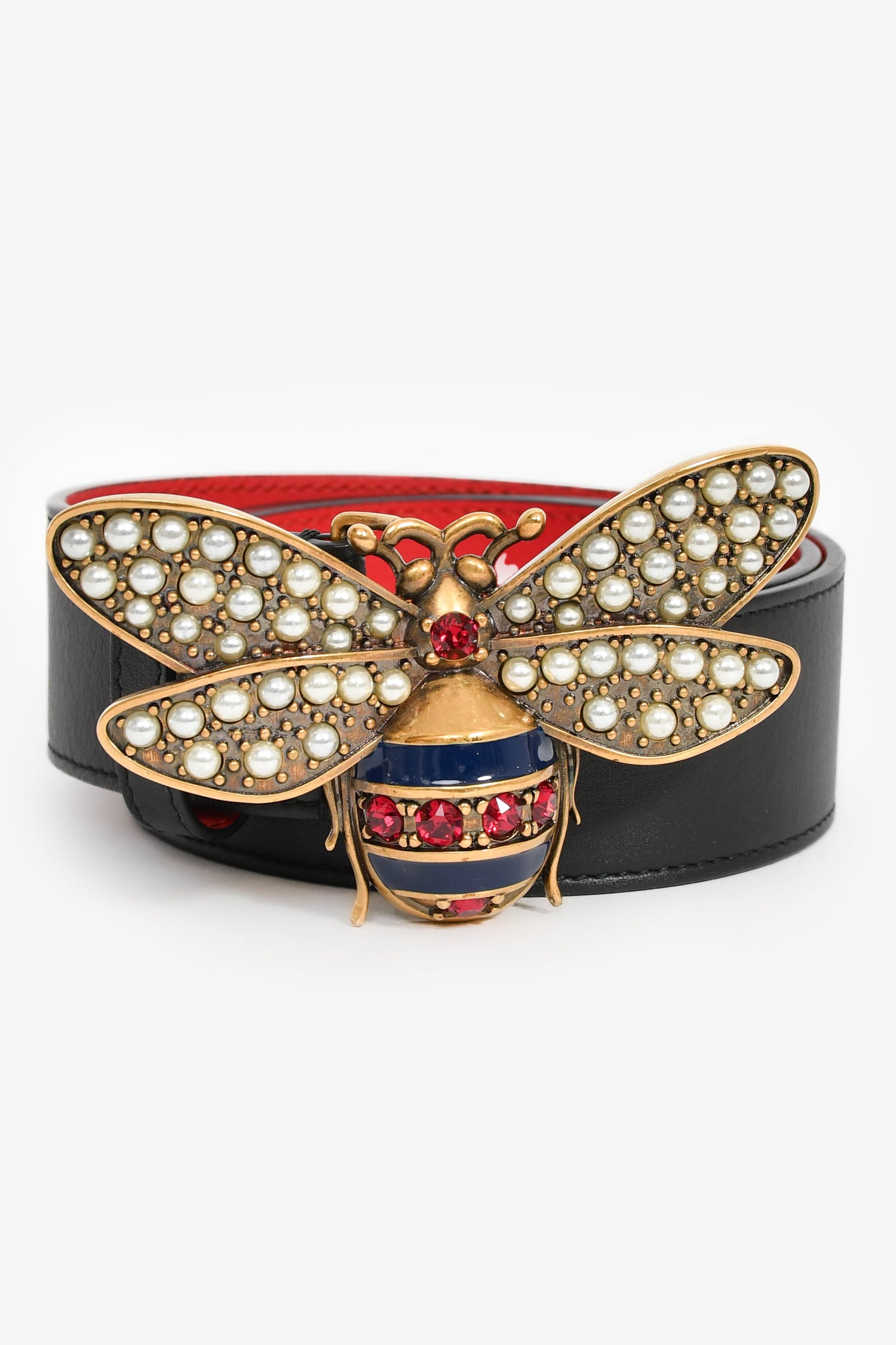 Refresh availabilityGucci Black Leather Jewel Bee 'Sylvie ' Belt. Adjustable push-tab buckle closure. Gold-tone hardware. Tonal stitching.