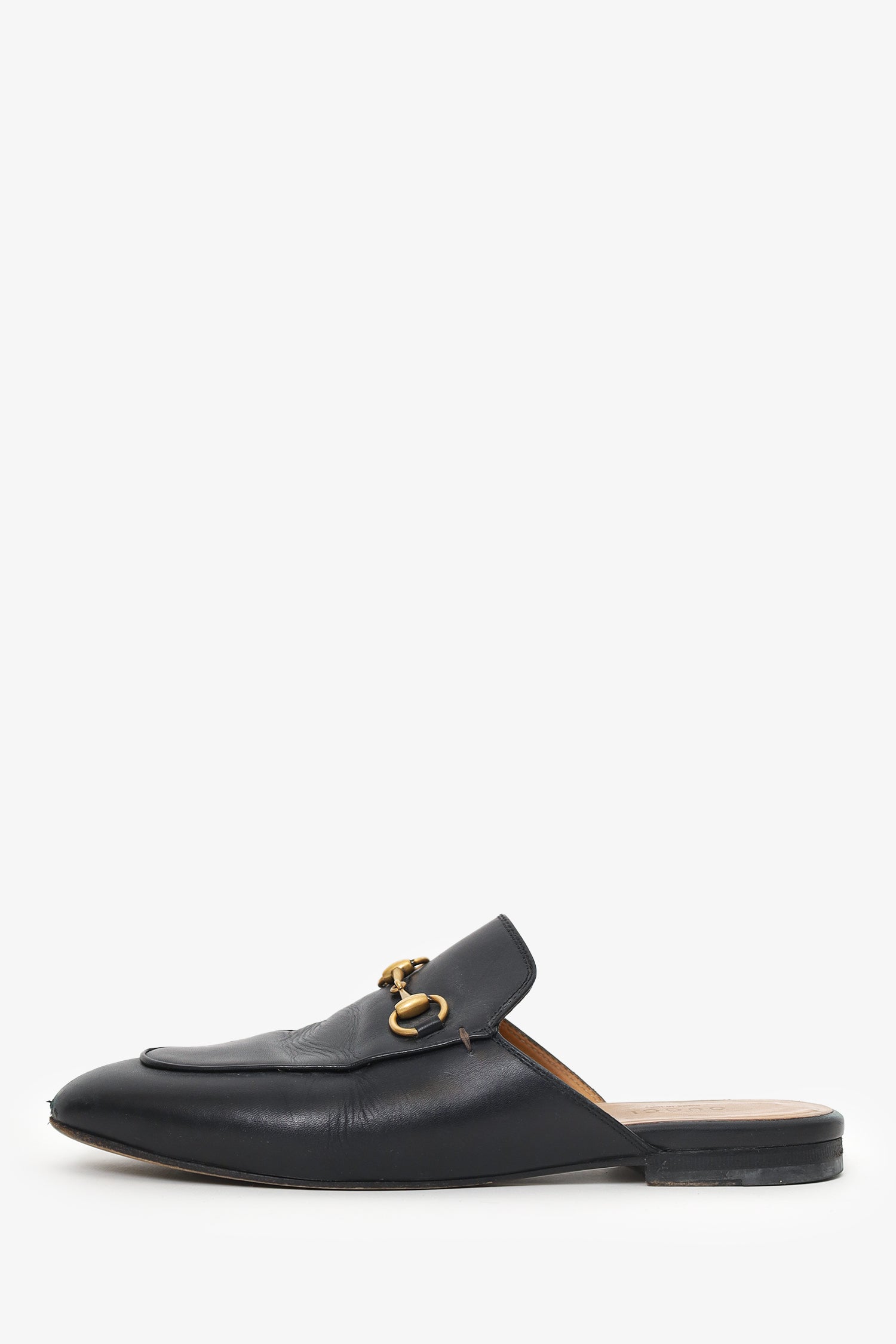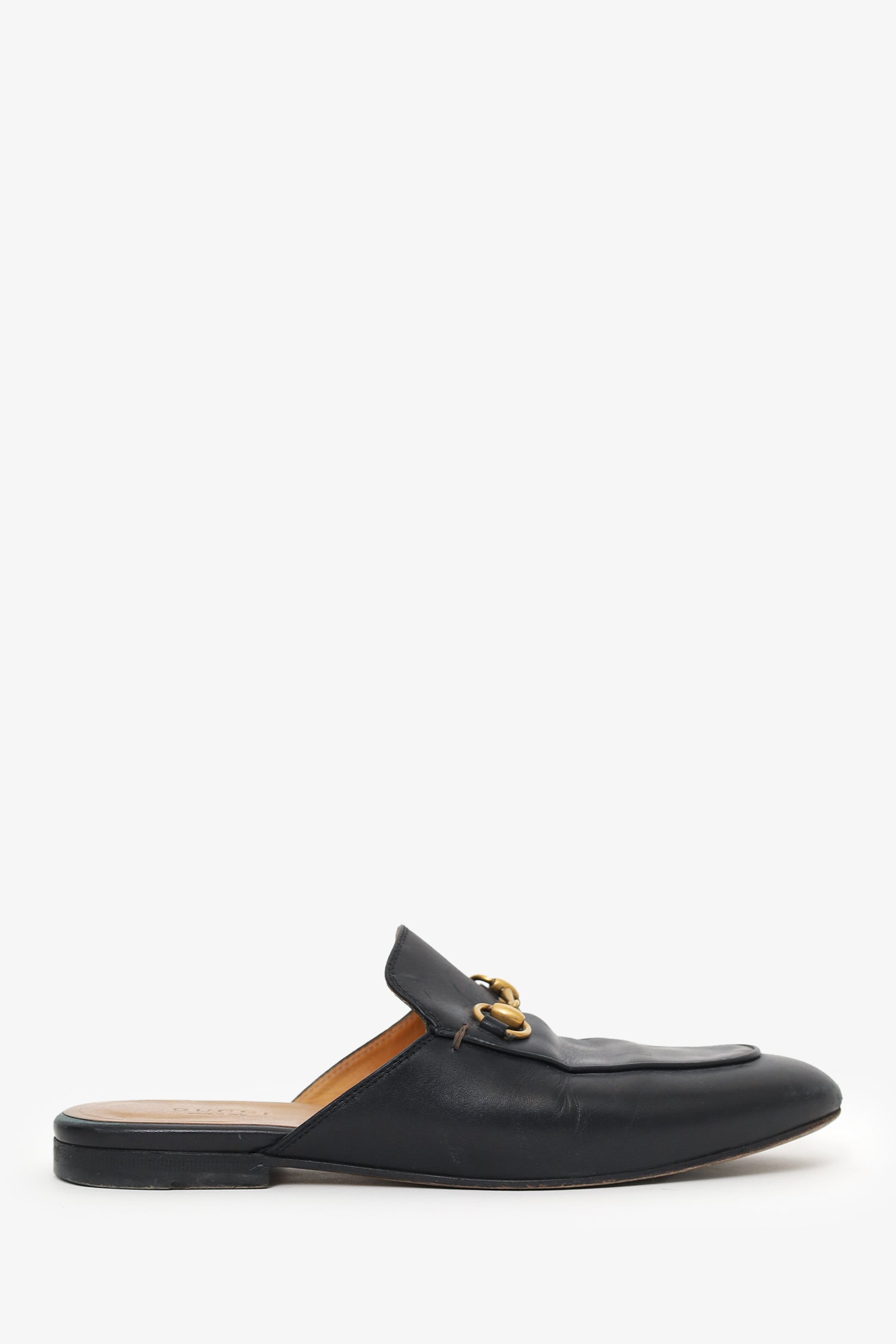 Refresh availabilityGucci Black Leather Princetown Slide Loafers. Slip-on. Round-toe. Horse-bit hardware at front toe box. Gold-tone hardware. Tonal stitching.