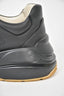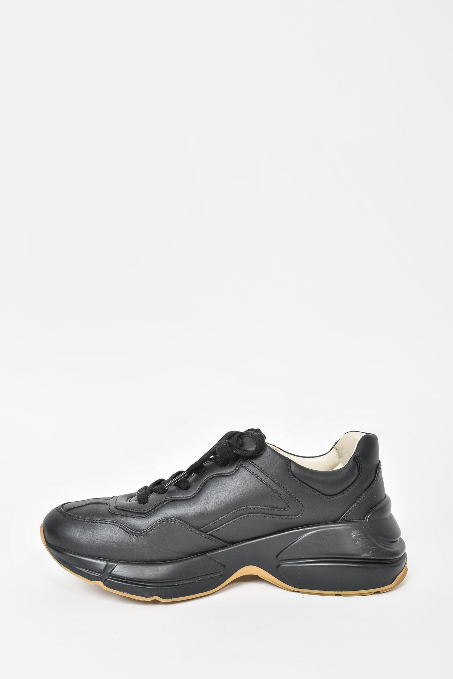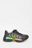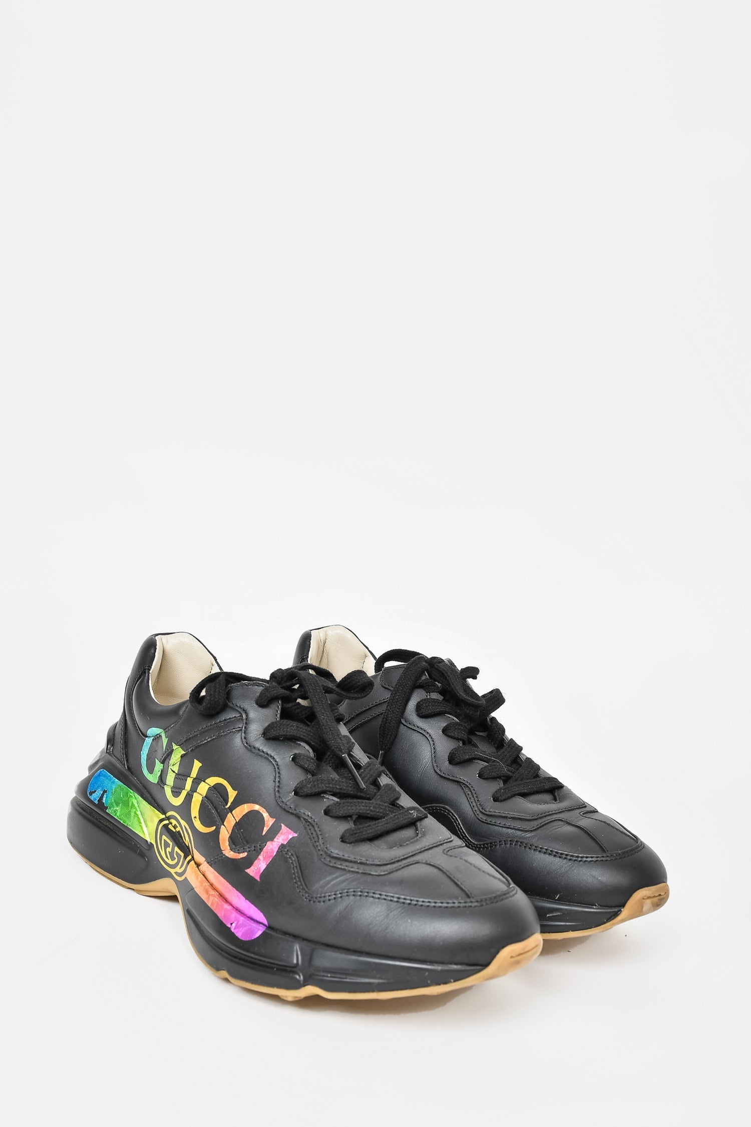 Gucci Black Leather Rainbow Logo "Rhyton" Sneakers. Round toe. Lace-up closure. Tonal stitching.