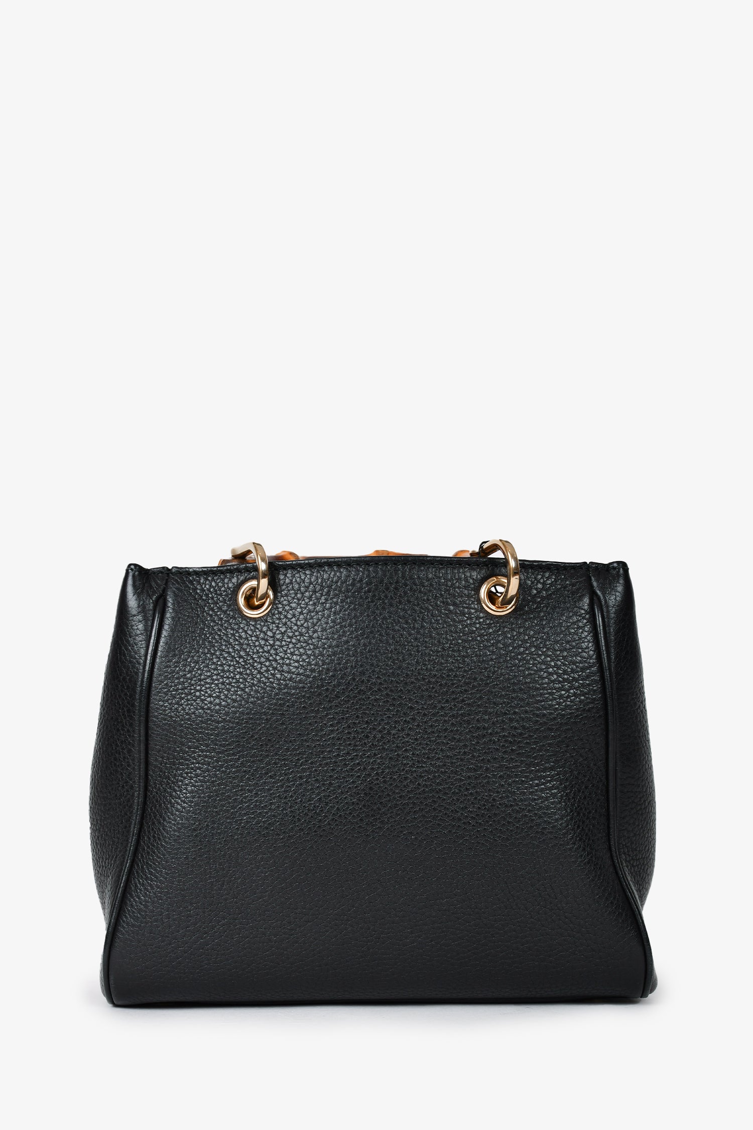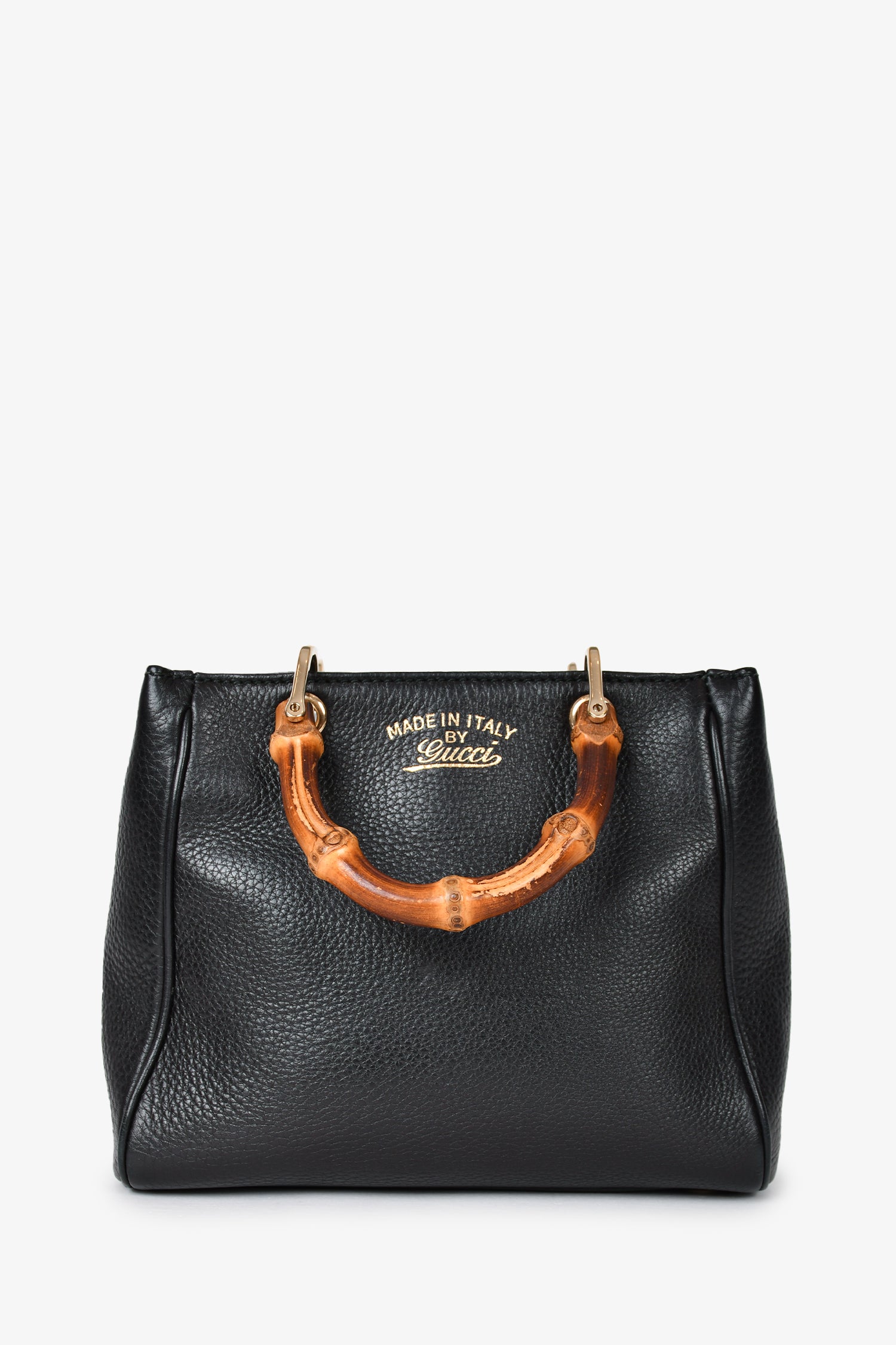 Refresh availabilityGucci Black Leather Small Bamboo Handle Tote. Interior magnetic button closure. Tonal textile interior lining. 2 interior wall slip pockets. Removable and adjustable strap. Protective metal bottom. Gold-tone hardware. Tonal stitching.
