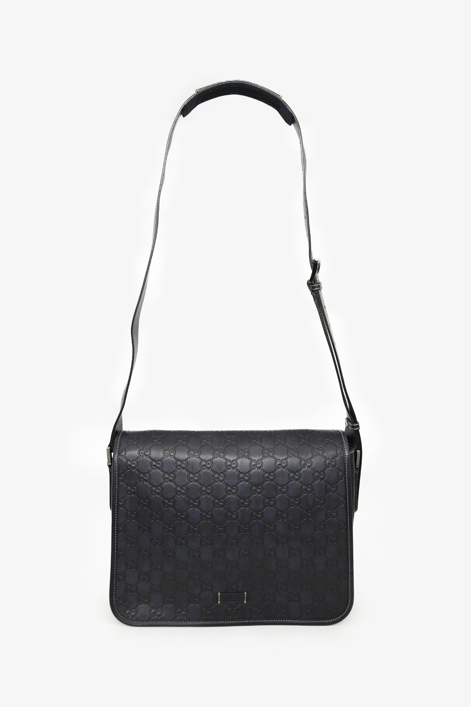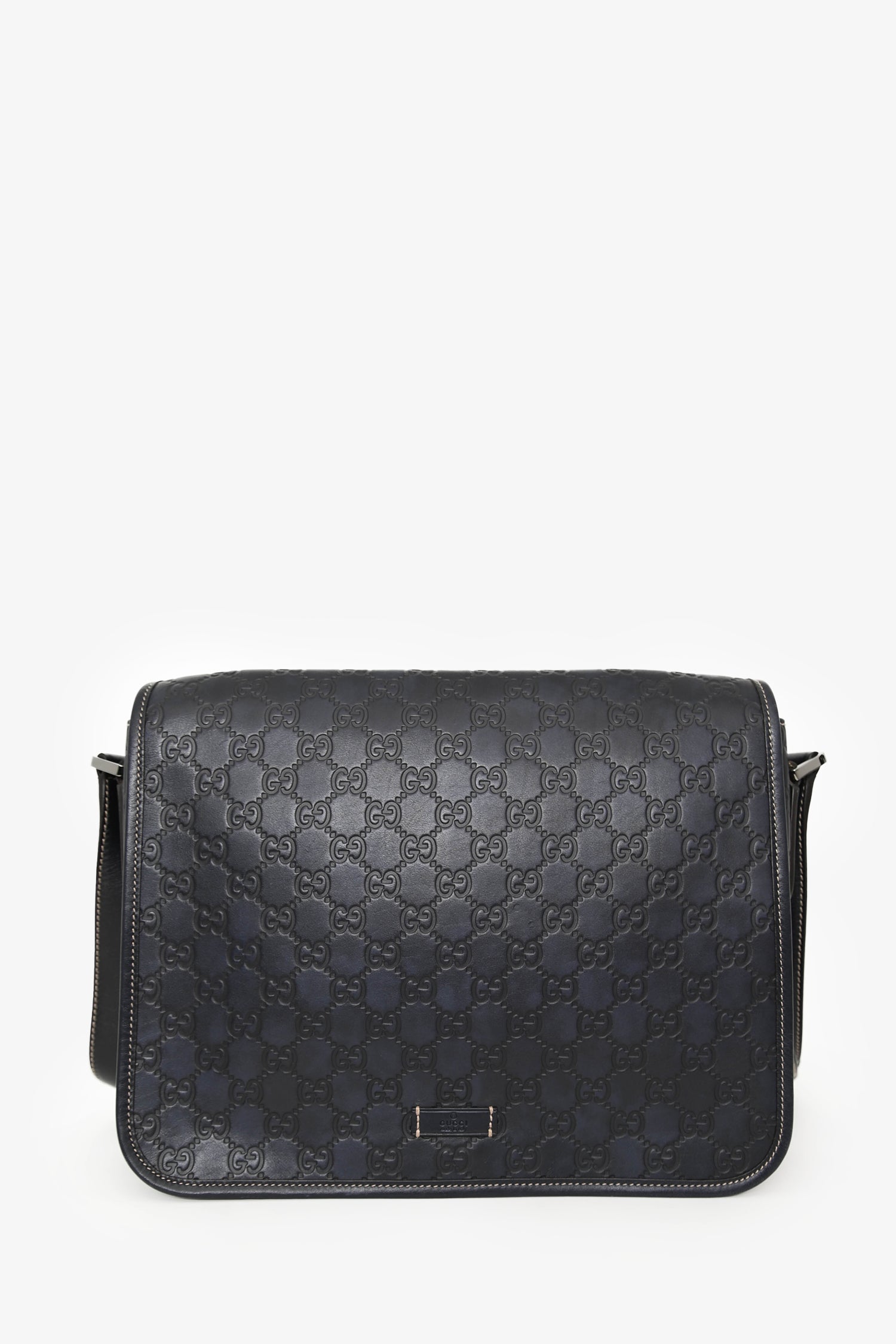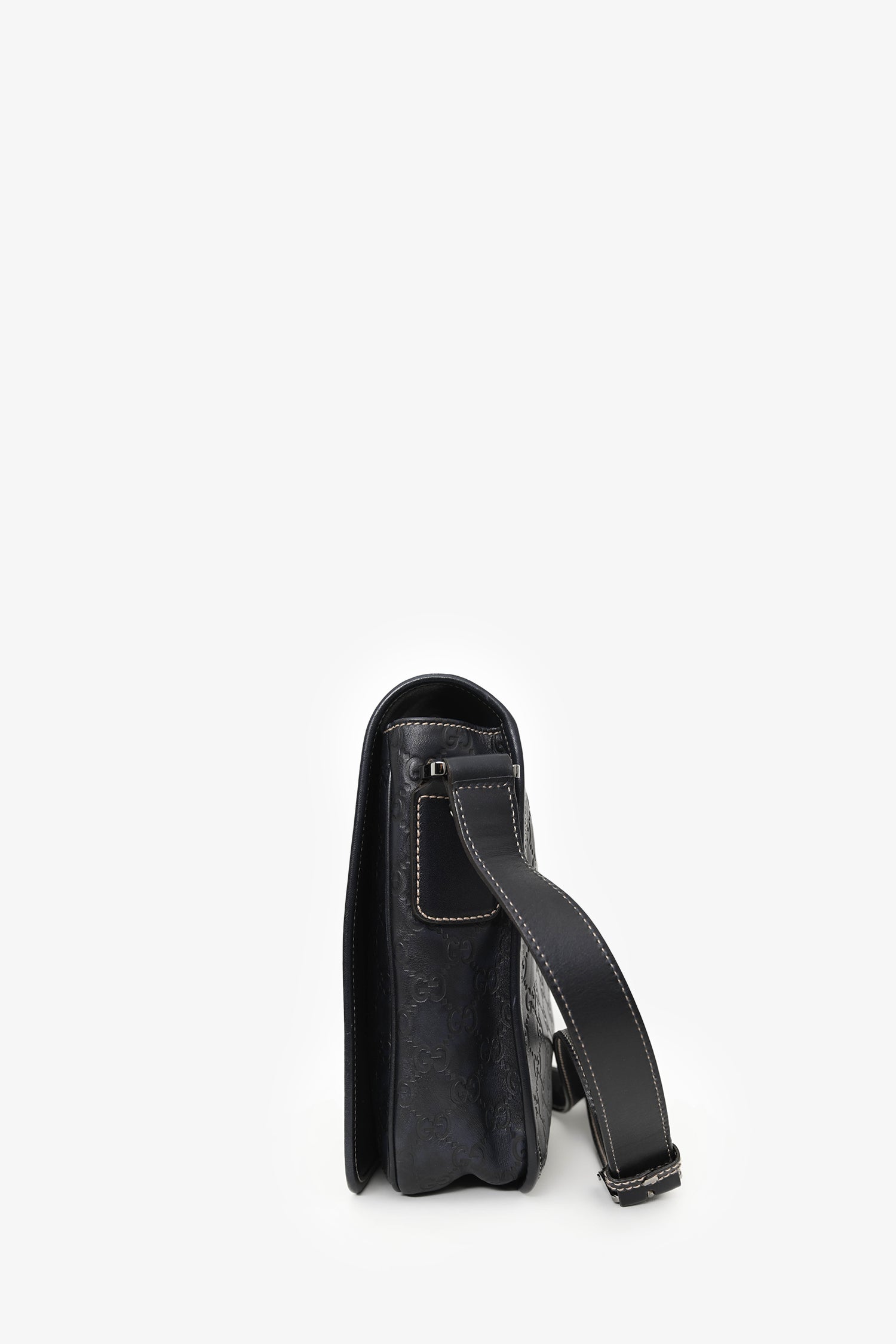 Refresh availabilityGucci Black Leather Supreme Messenger Bag. Front fold-over flap with magnetic button closure. Adjustable strap. Lined interior. 2 interior wall pockets; 1 slip, 1 with zip closure. Silver-tone hardware. Contrast stitching.