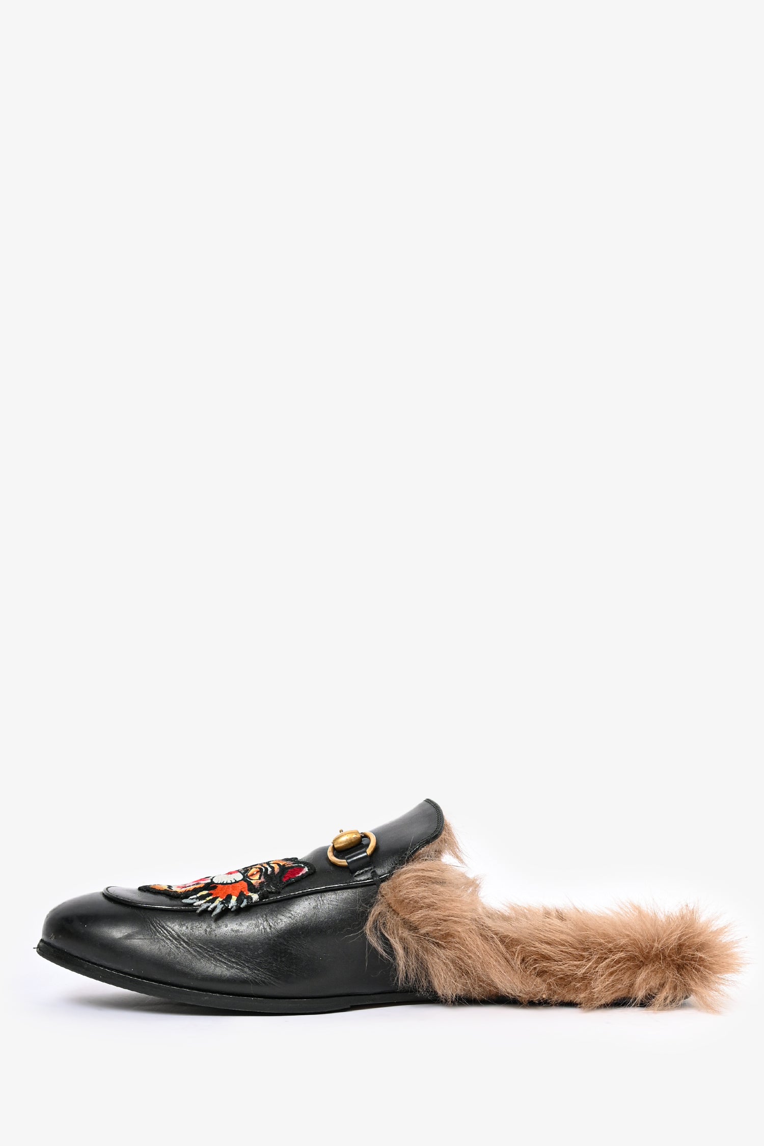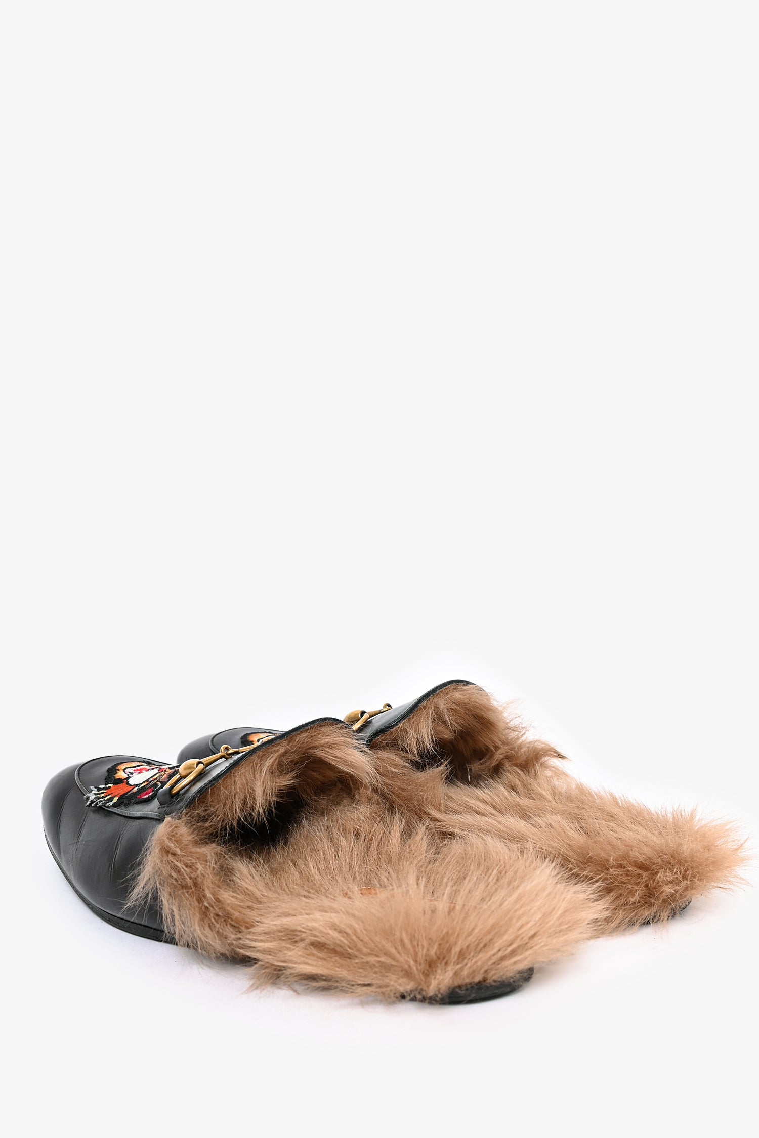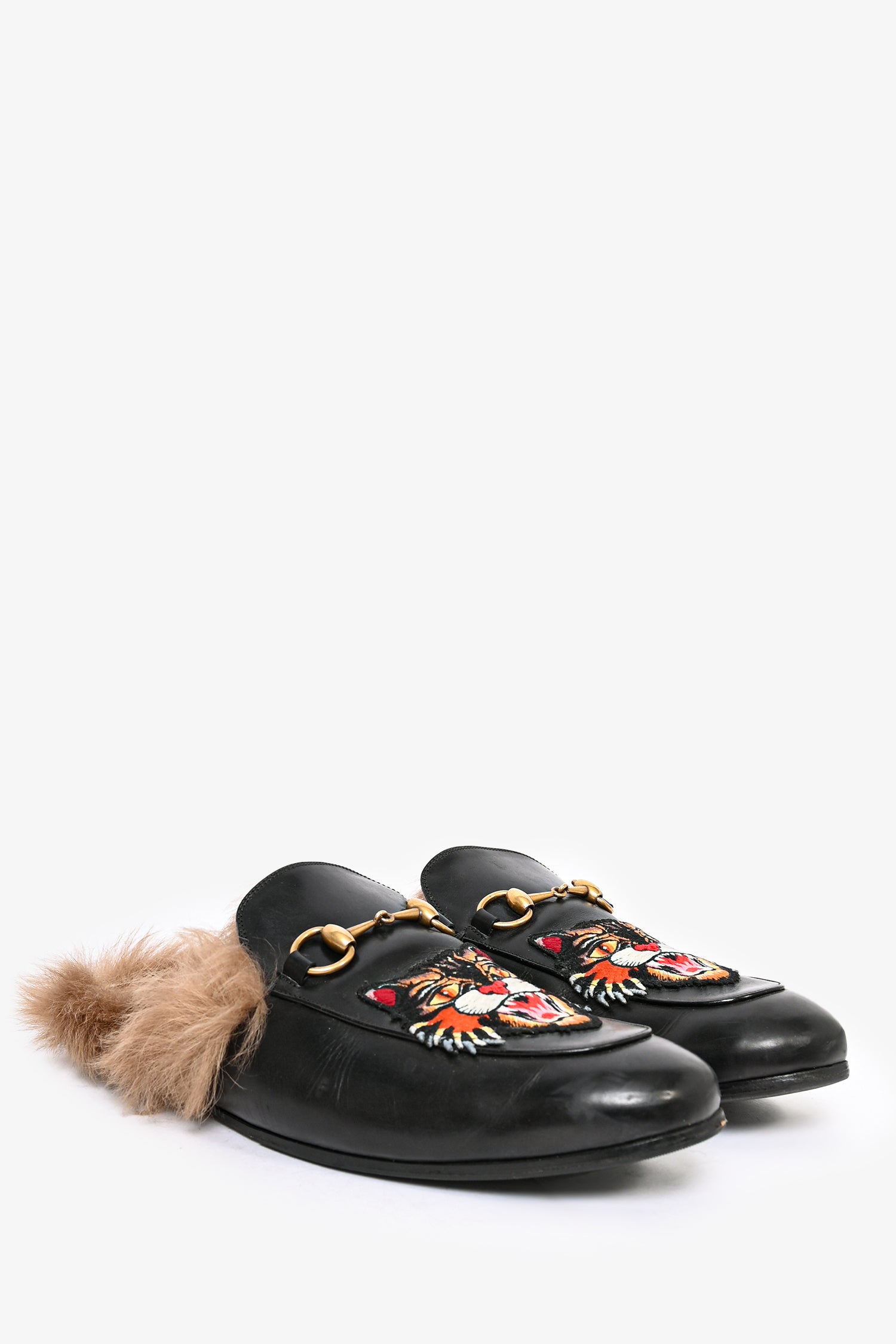 Refresh availabilityGucci Black Leather Tiger Embroidered Slip On Fur Loafers. Tonal stitching.