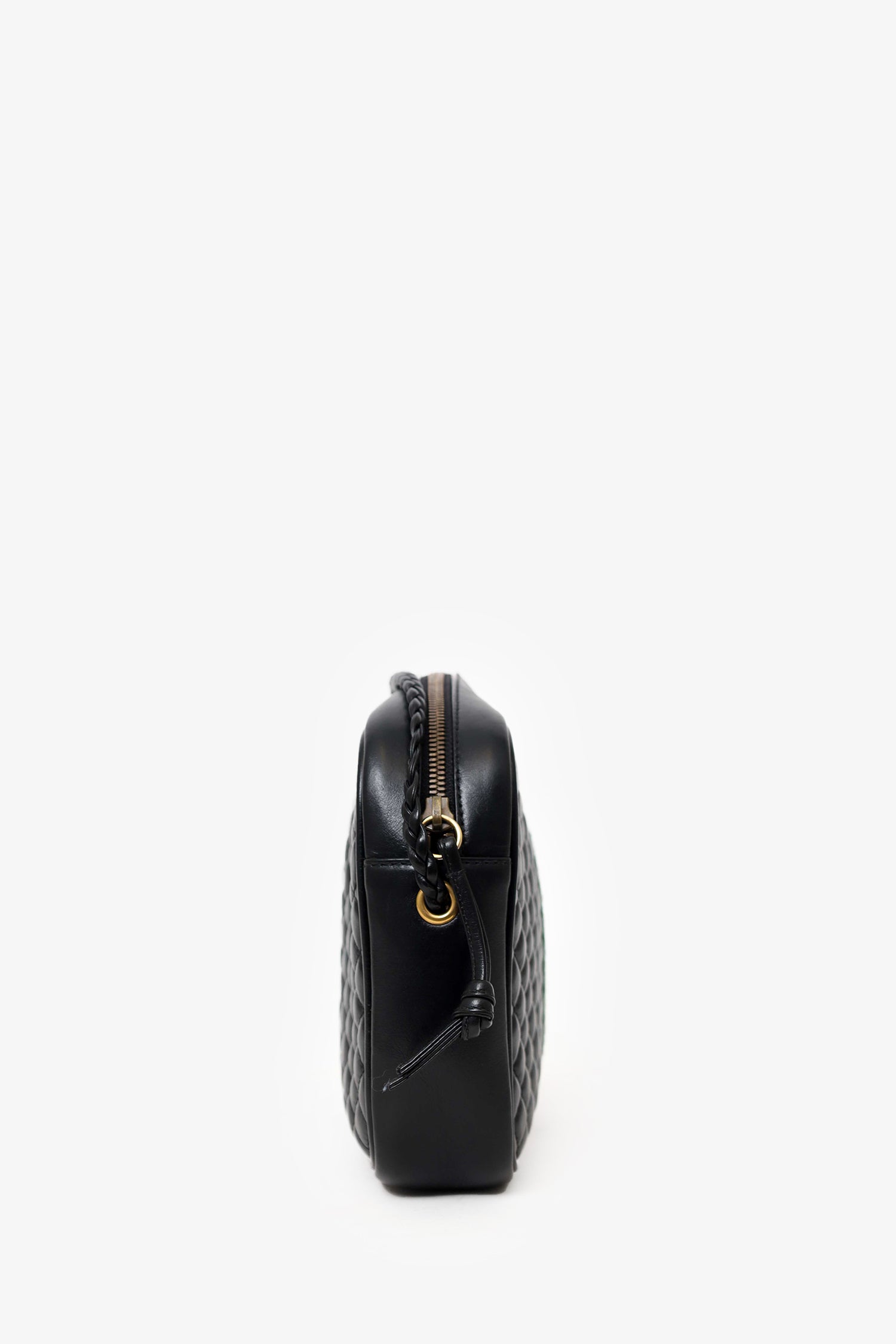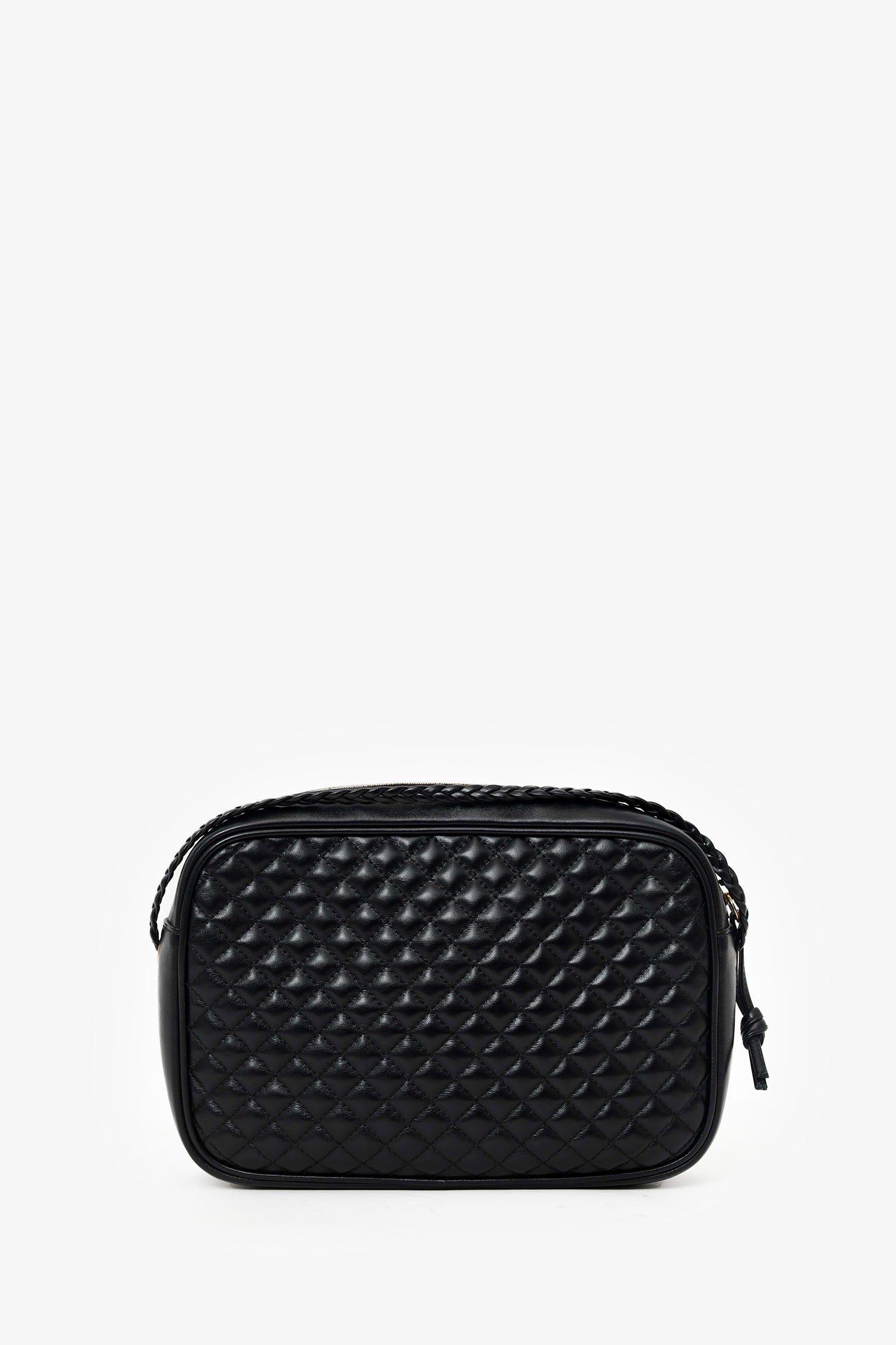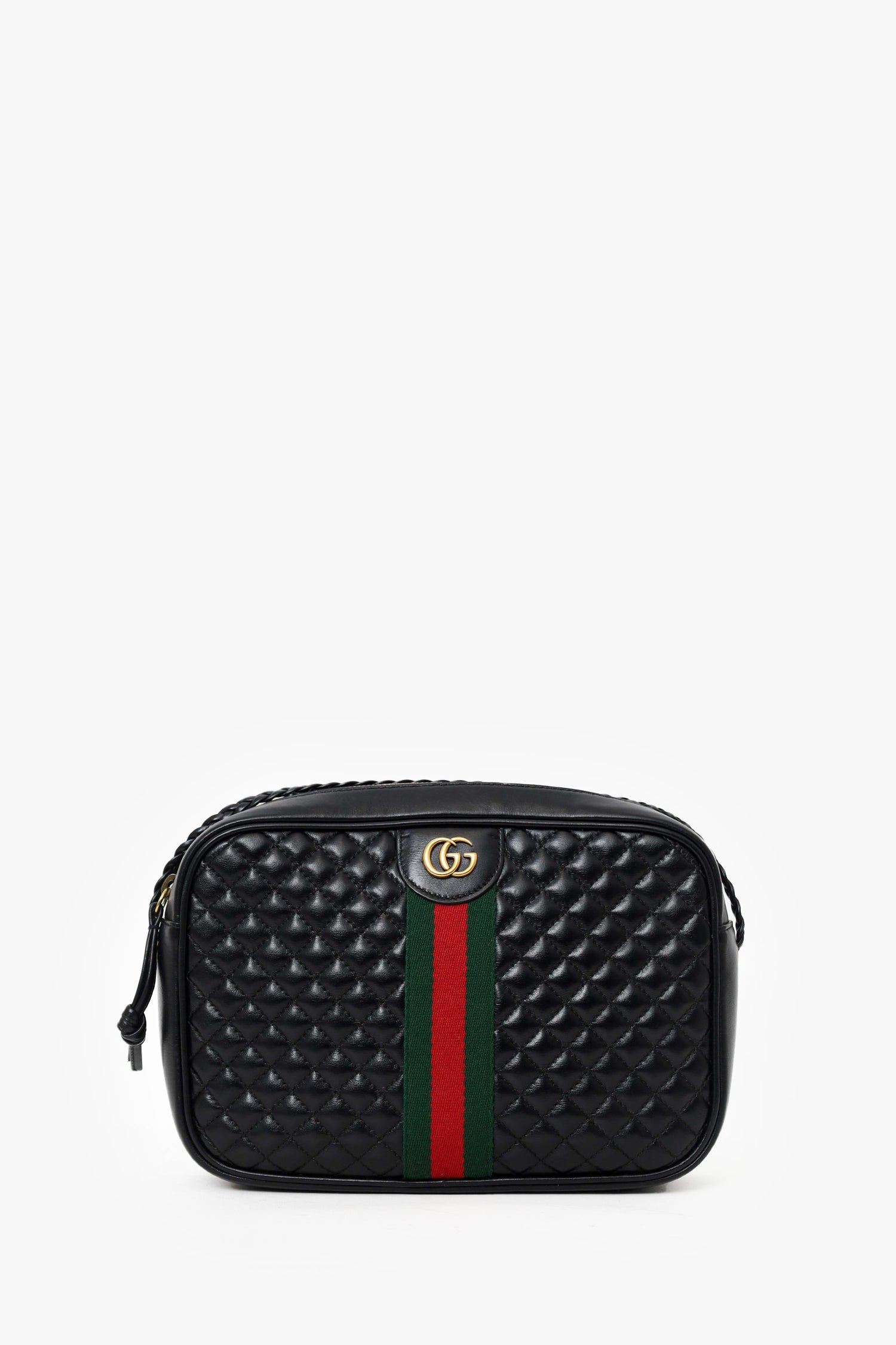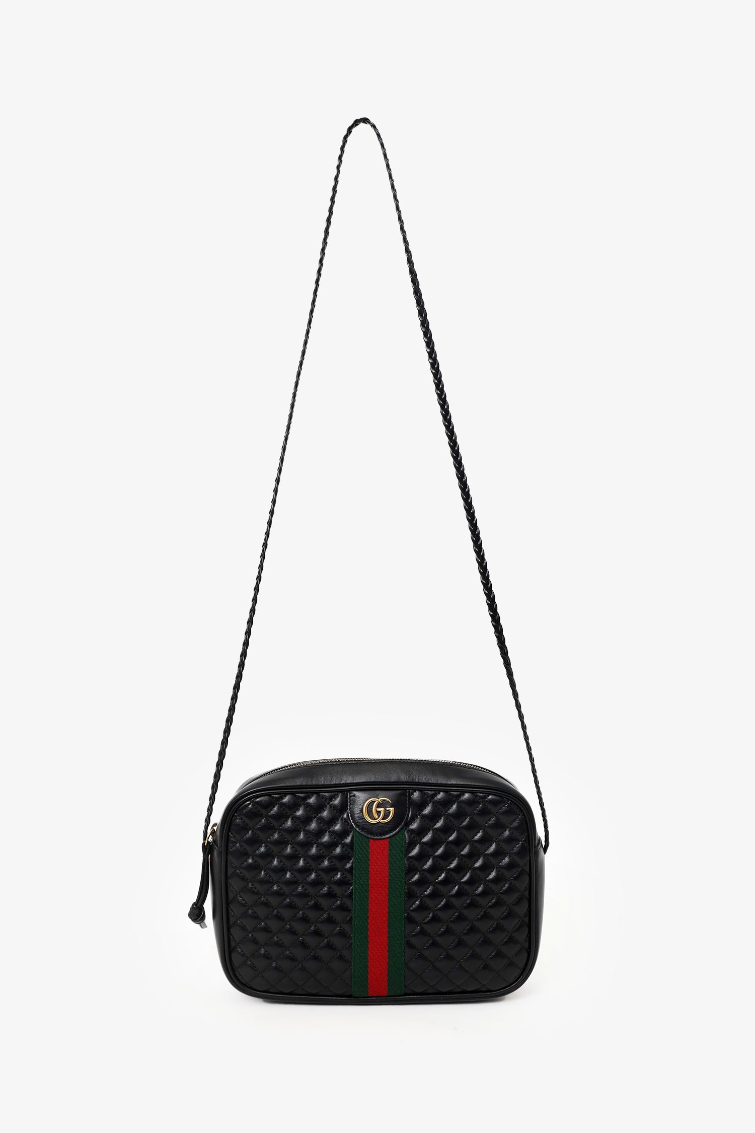 Refresh availabilityGucci Black Leather Web Trapuntata Quilted Camera Bag. Top zip closure. Braided strap. Lined interior. Single interior slip pocket. Gold-tone hardware. Tonal stitching.